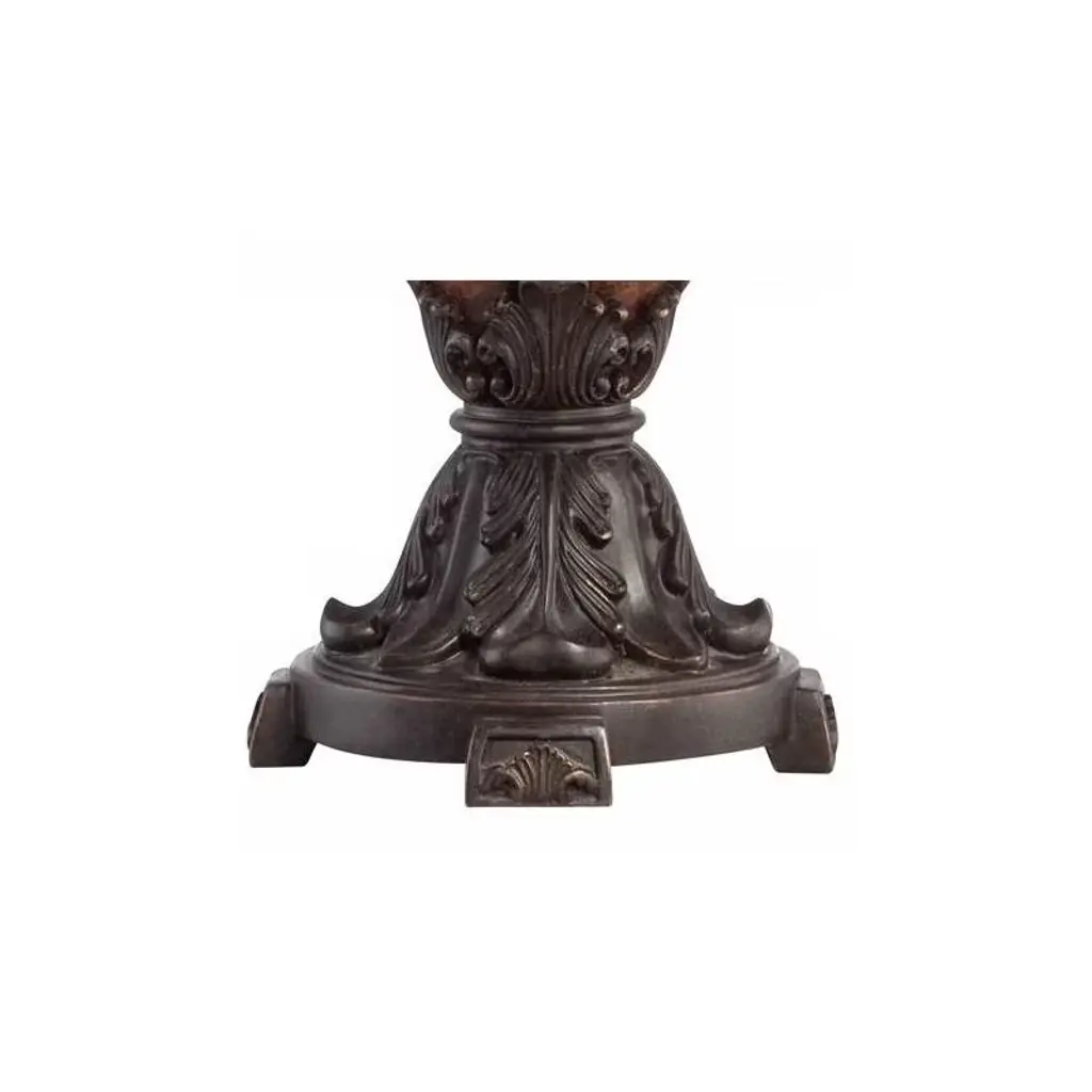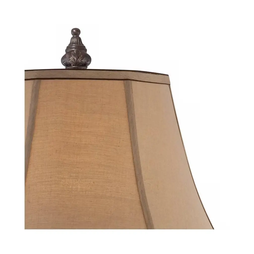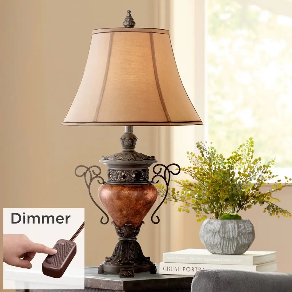 Bring a new focus to home decorating with this wonderfully visual table lamp design. The piece features an urn-style base in a bronze crackle finish, accented with iron scroll handles. A faux silk bell shade rests peacefully on top. This lamp set comes with a tabletop dimmer, one for each lamp, which allows you to control the level of lighting. Simply insert the lamp plug into the dimmer outlet, and then slide the switch on the control to dim or brighten the lighting.