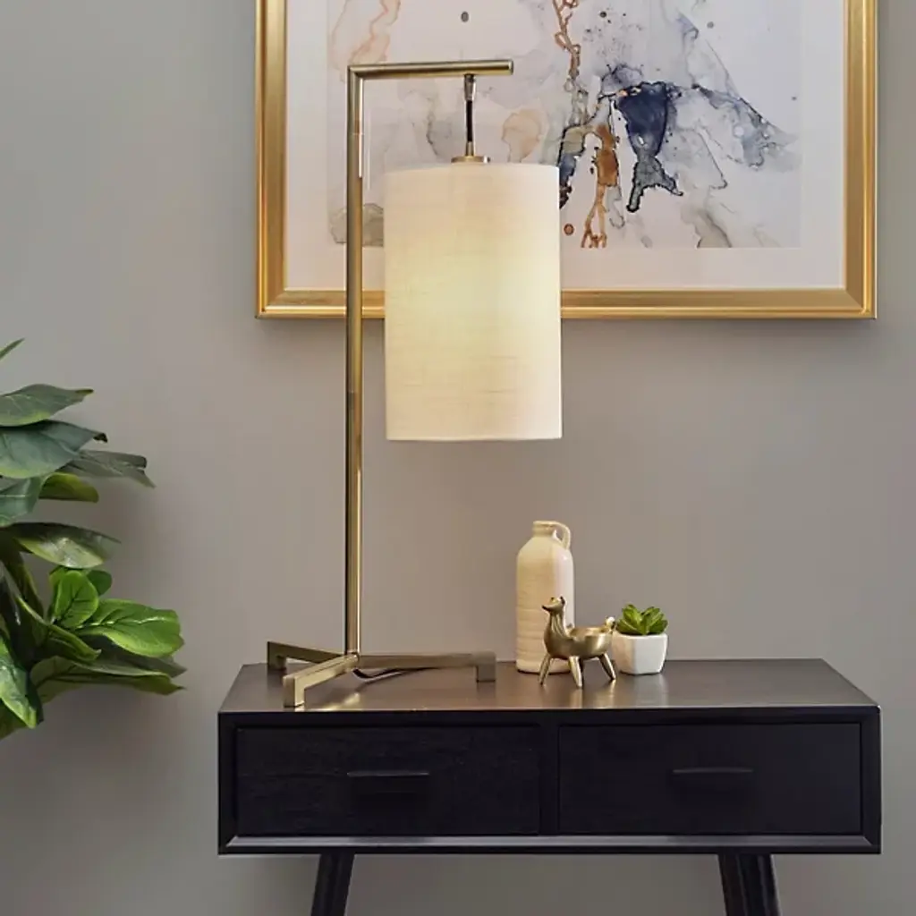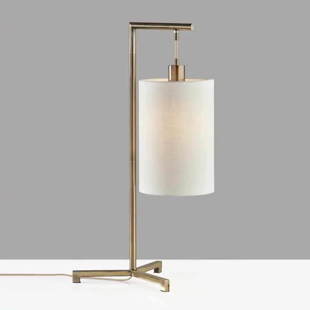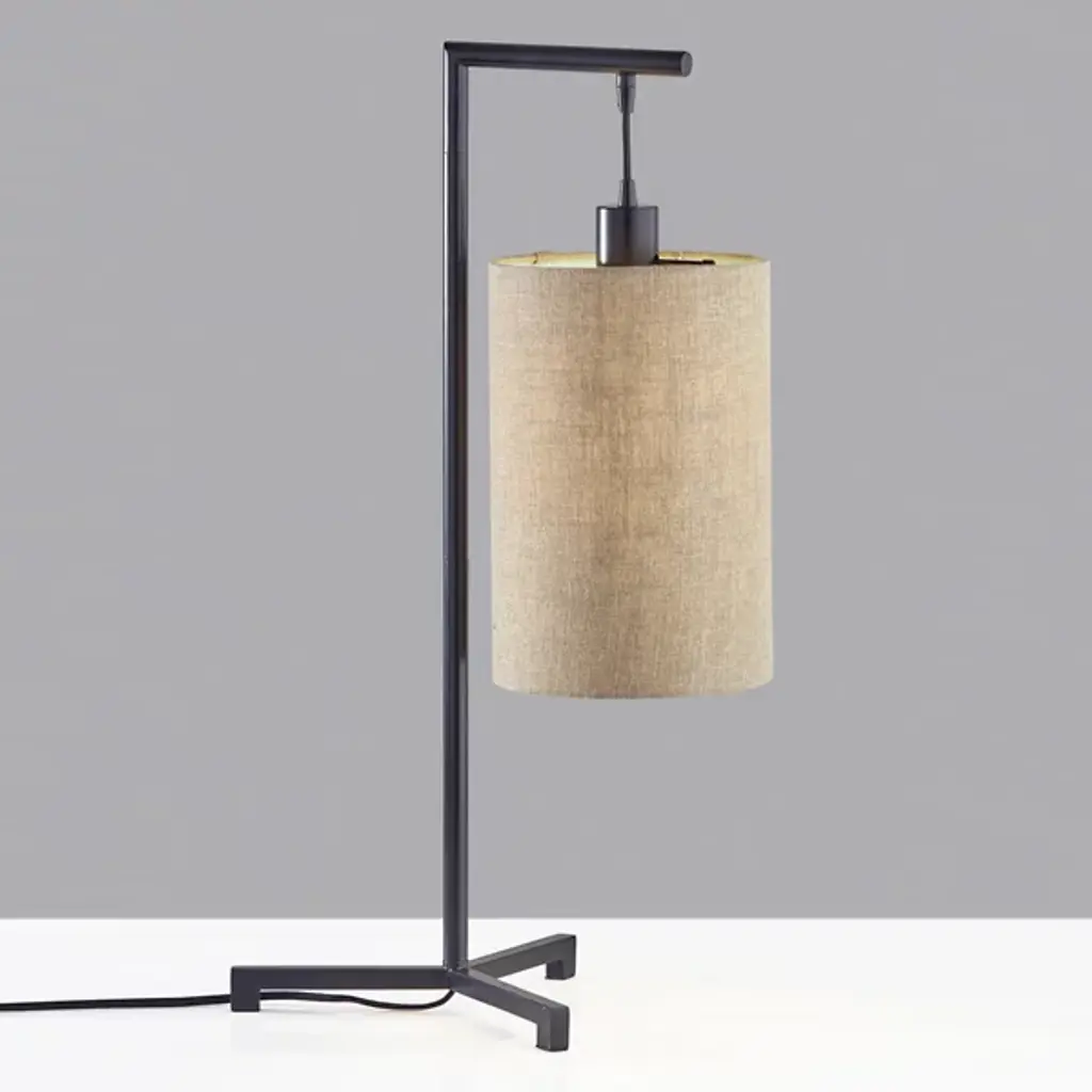 Add Mid-Century style and ambient task lighting to your space with the Reggie Table Lamp by Adesso. This lamp is the perfect addition to nightstands, desks, or end tables. The base forms a low triangle shape leading to a thin stem. Hanging by a short cord is a tall drum shade. The textured fabric diffuses the light, softly illuminating your room.
