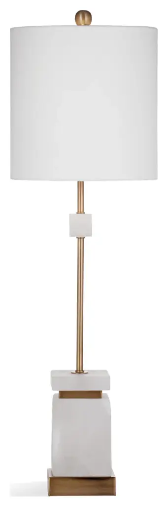 The Regulus Table Lamp is a stunning blend of contemporary glam and timeless elegance. Crafted with a white marble base and accented by sleek brass details, this buffet-style lamp is both functional and stylish. The white drum shade completes the design, offering a soft and inviting glow that enhances any space with sophistication.Features:White marble base with brass accents for a contemporary glam lookBuffet-style design perfect for adding height and eleganceWhite drum shade provides a soft, diffused light ideal for any roomFeatures a 3 way turn knob light switchBulb type a required, not includedEasy assembly - just attach harp, finial and shadeFor over a century, Bassett Mirror has been synonymous with style and quality, transforming homes with its sophisticated and timeless designs. With a wide-ranging collection of furniture, lighting, mirrors, and art, Bassett Mirror seamlessly blends modern style with classic appeal. From rustic modern to luxe glam, each piece is thoughtfully crafted to inspire and elevate any space. Committed to exceptional value and customer care, Bassett Mirror makes it easy for homeowners to create beautiful, personalized interiors with confidence.