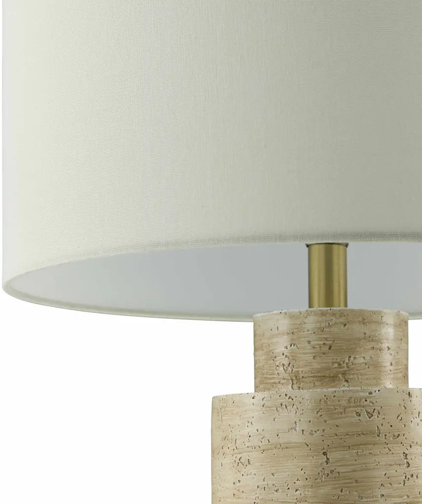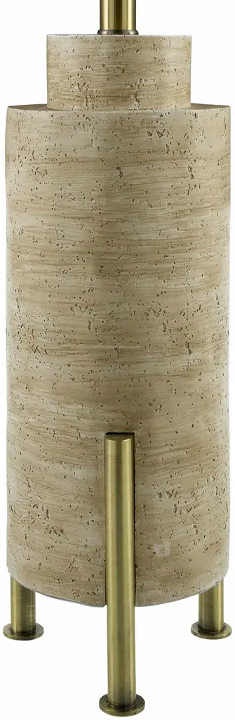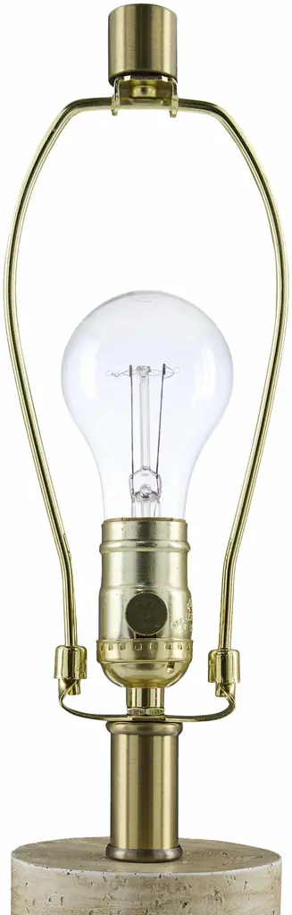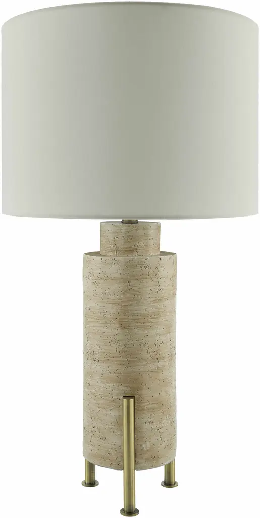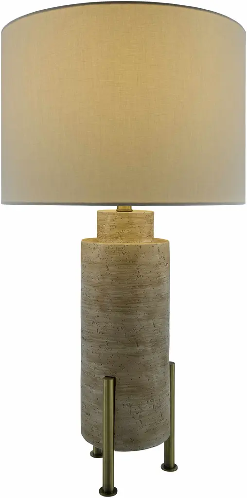 Collection: Reinstorf Colors: Beige, Metallic - Brass, White, Metallic - Nickel, Translucent Material: Body: Cement, Iron / Shade (Outside): Linen / Shade (Inside): Polyester / Finial: Iron Styles: Southwestern Made In: China Lighting Type: Accent Table Lighting Shade Material: Linen, Polyester Shade Color: White, White Cord Length: 6' Switch Type: 3-Way Number of Bulbs: 1 Socket Type: E-26 Bulb Wattage: 100W