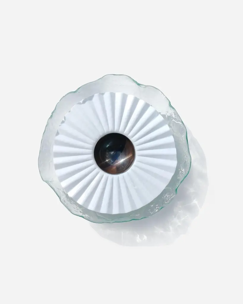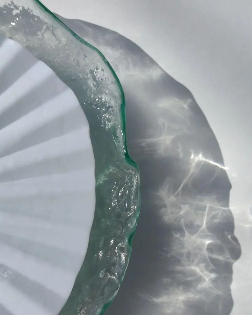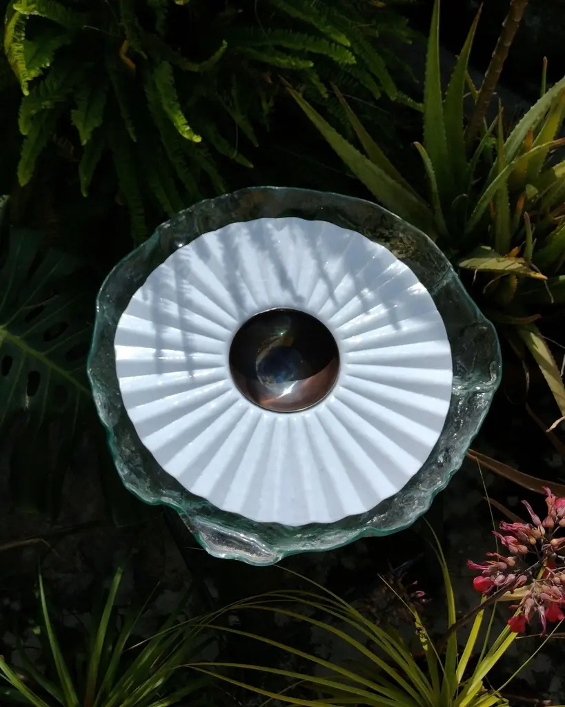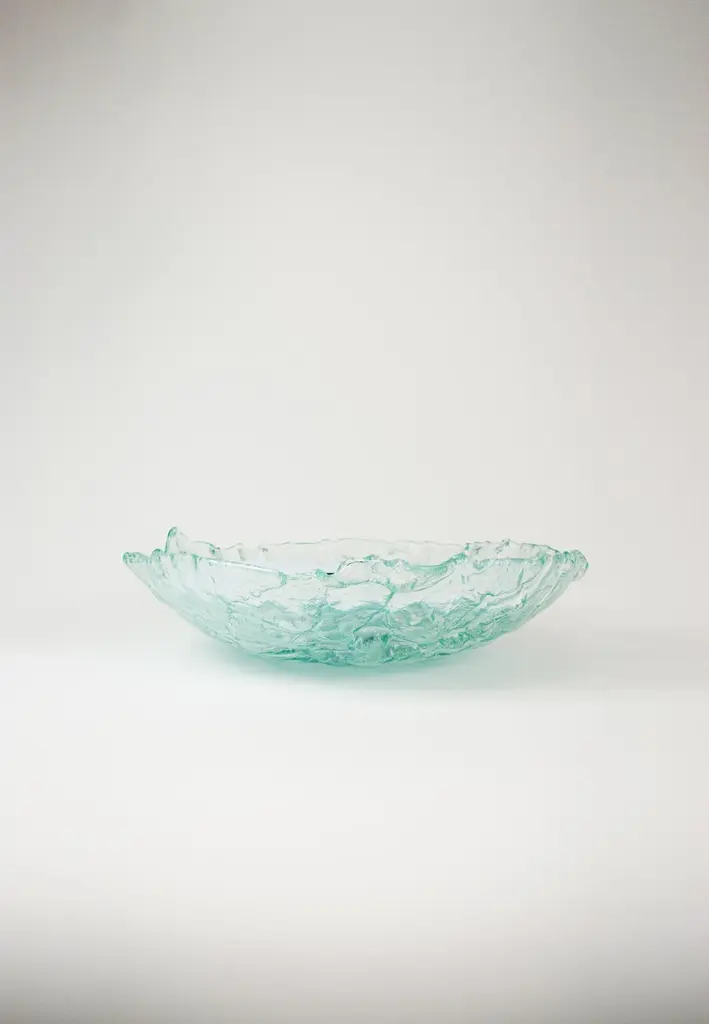 Reliquia by Ehécatl MorenoHandmadeDimensions: D 45 x W 45 x H 12 cm.Materials: Glass, steel.A glass platter modeled from thermoforming, it is a masterpiece of transparency and luminosity. Its prismatic design uniquely captures light, creating reflections and sparkles that flicker on the surface. The molding technique not only adds a three-dimensional dimension to the piece but also allows subtle color changes as light interacts with the folds of the glass and the curves of the steel.Their fragility bestows upon them an even deeper beauty. Every small fissure tells a story of love, challenges overcome, and shared moments. In these imperfections lies the authenticity of the human experience, reflected in objects that have been cherished and cared for throughout the ages.All our lamps can be wired according to each country. If sold to the USA it will be wired for the USA for instance.We harbor a firm conviction that objects not only shape our present but also mold our future. Through our work, we seek to create pieces that act as mediums for participating in politics and presenting fantastical and reconciliatory realities amidst the adverse uncertainty of our time.Our designs, born from an intersection between the beautiful and the grotesque, explore the contrast and tension between the familiar and the novel, the natural and the artificial. We embrace a haunting beauty that challenges and captivates, inviting viewers to confront their own perceptions and emotions. Inspired by the cultural and scenic richness of our environment, we believe that every object has a story to tell and a future to influence.As creative directors, our mission is to offer pieces that not only beautify spaces but also provoke deep and emotional reflection in those who contemplate them. Our work is a tribute to memory and a bridge to the future, uniting the nostalgic with the innovative in every creation, and celebrating a beauty that unsettles as it enchants.