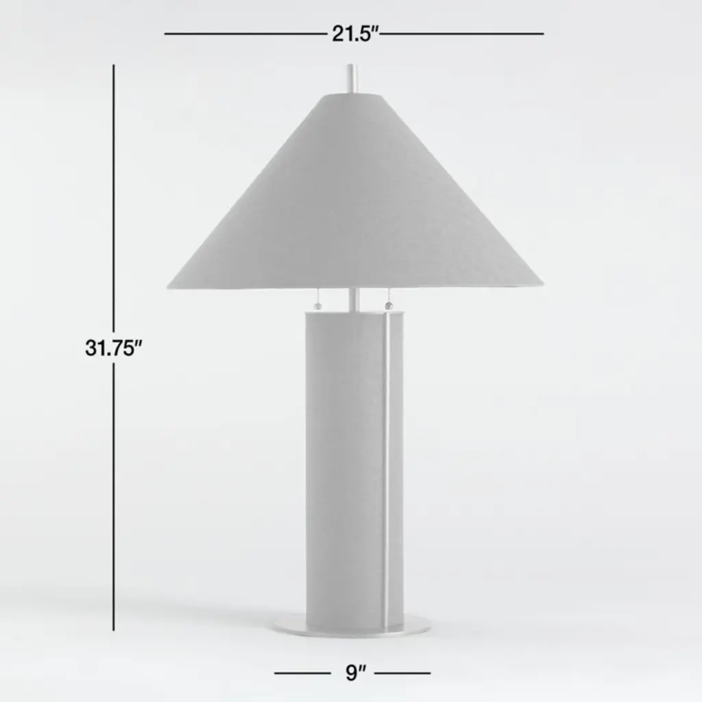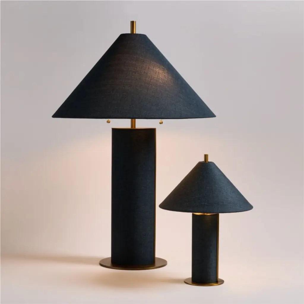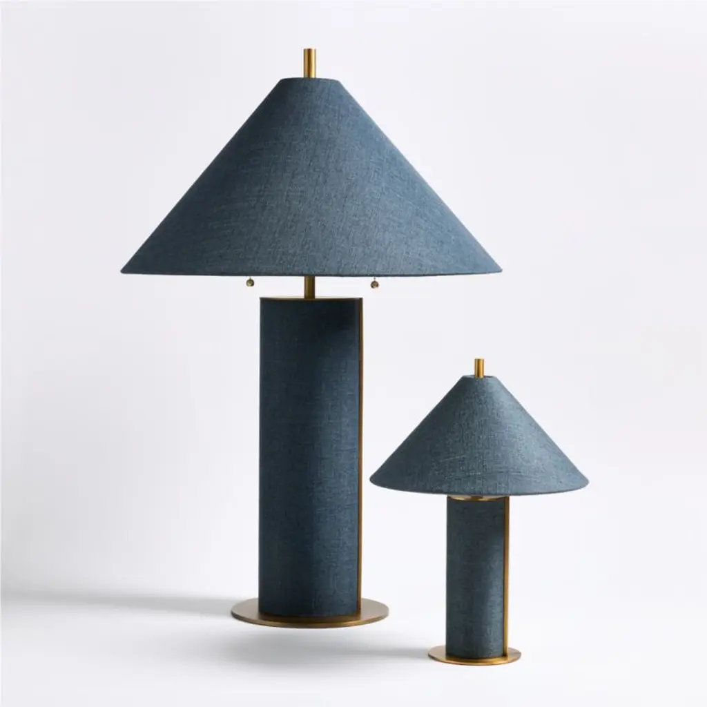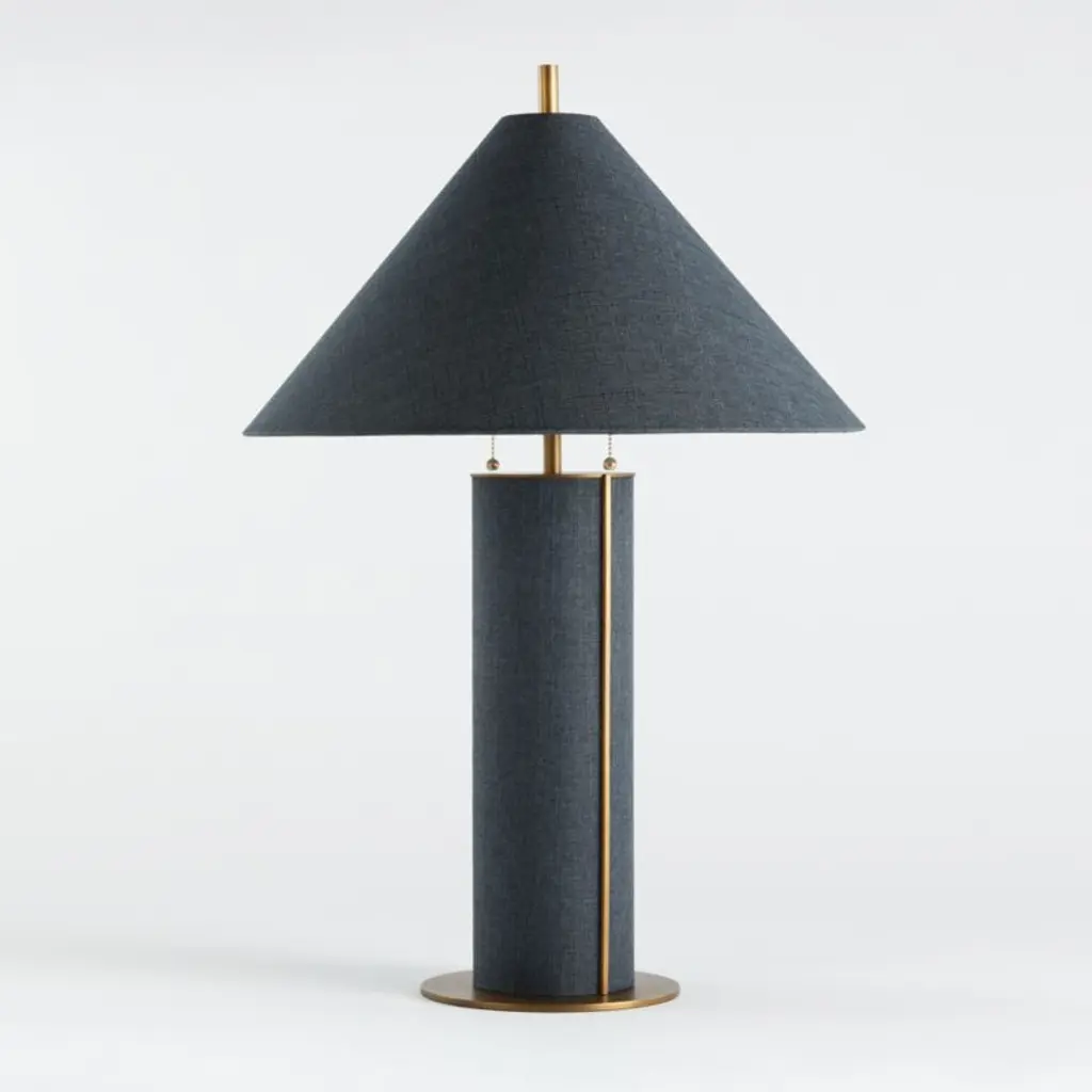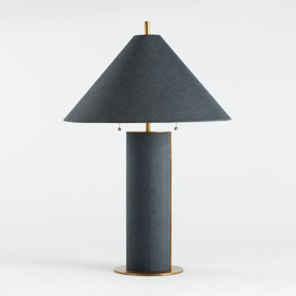 Remi wraps a table lamp entirely in deep blue linen-blend with gilded accents. Topped with a steeply pitched matching shade, the columnar base shows off the slubbed fabric and the warm burnished brass accents. Adding rich color and texture to a side table or nightstand, our Remi blue linen table lamp is a Crate and Barrel exclusive.