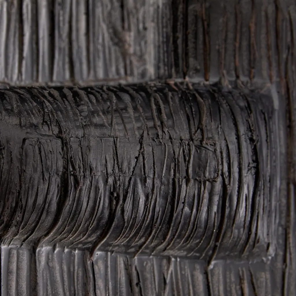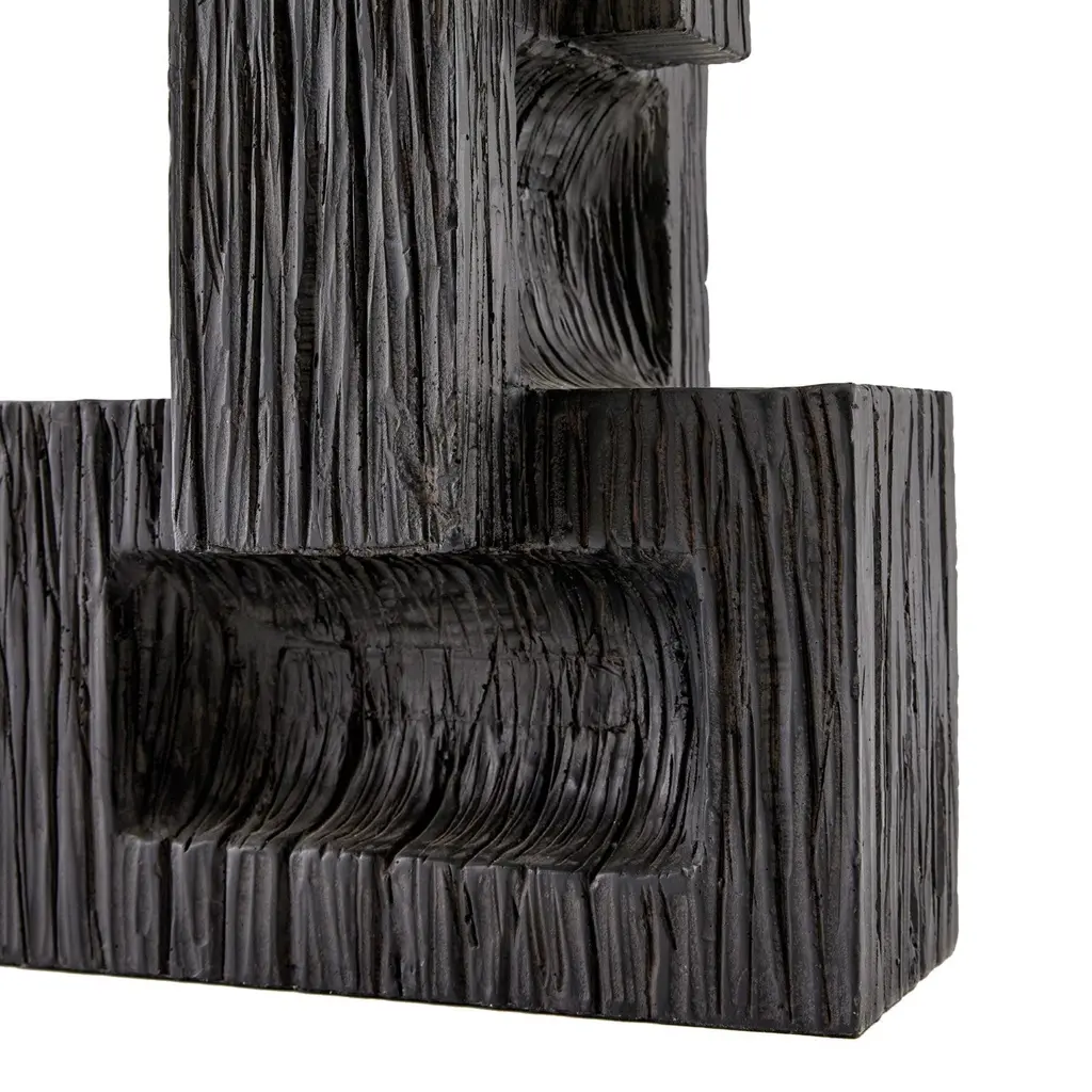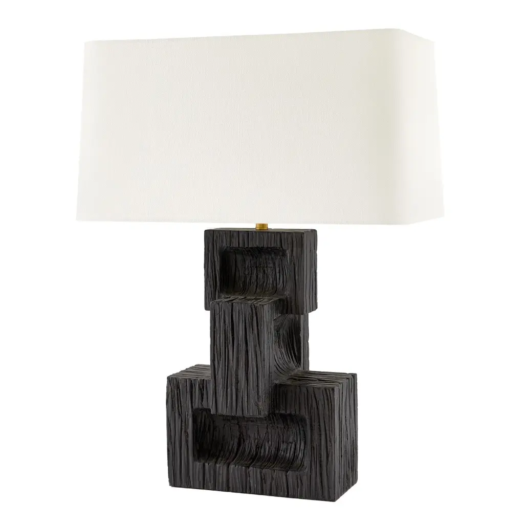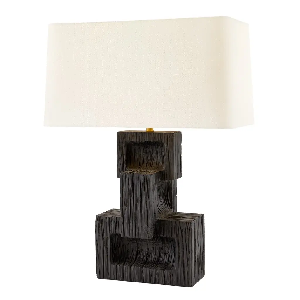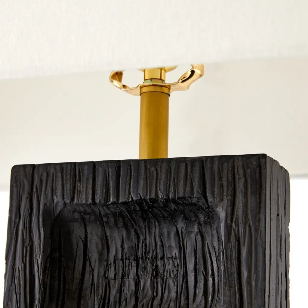 The sculptural, chain-link-inspired Rendor table lamp imparts a worldly vibe to any surface. The totemic lamp is rendered in stacks of ebonized resin to resemble wood, and accented with an antique brass finial. The piece is topped with a rectangular, white linen drum shade lined in white cotton.