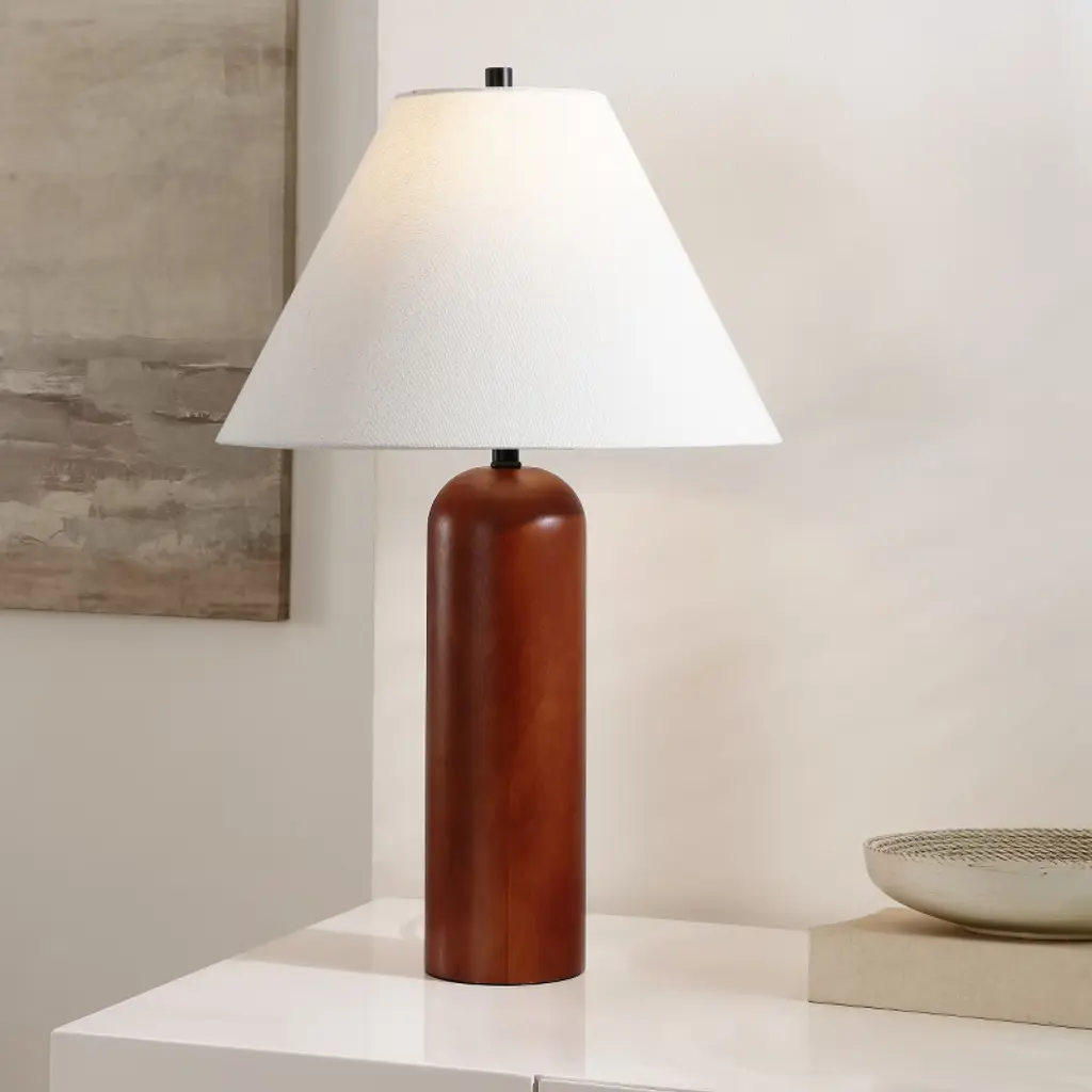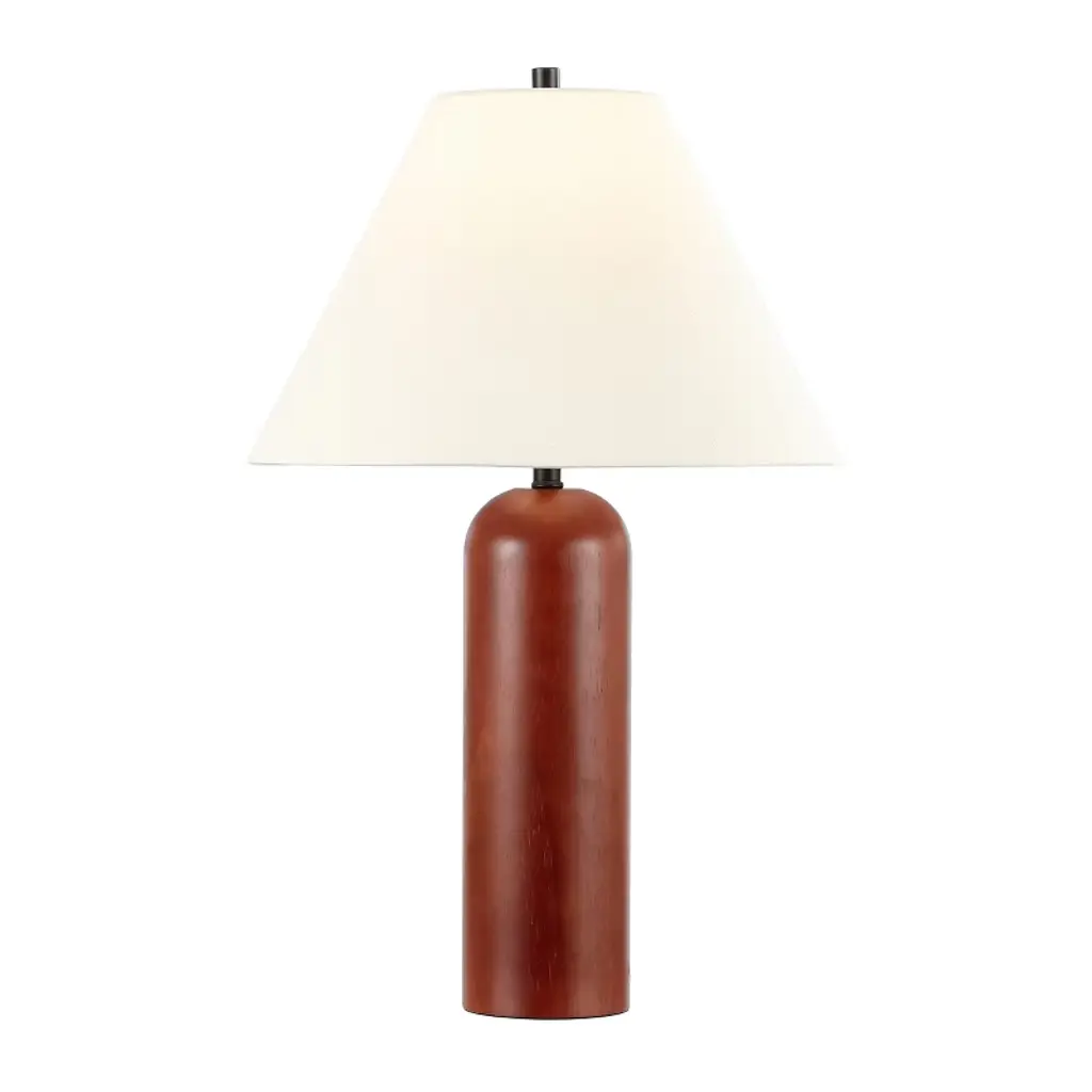 Illuminate your space with the Rennie Table Lamp, a fusion of traditional warmth and contemporary design. This lamp features a sturdy wood body with a rich walnut finish, providing an inviting natural element to your home decor. Topped with a complementary fabric shade, the lamp emits a soft and cozy glow, perfect for reading nooks, office desks, or bedside tables. The lamp stands 25.5 inches tall and the shade measures 11 inches at its widest point, making it a versatile addition to any room. With a cord length of 60 inches, it offers flexibility in placement. Enrich your living environment with the functional beauty of the Rennie Table Lamp.