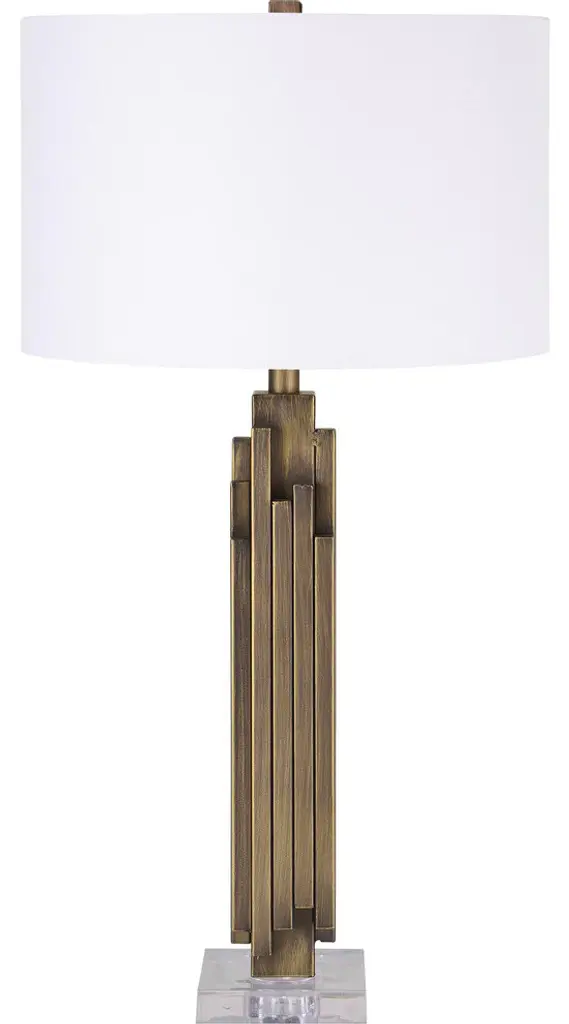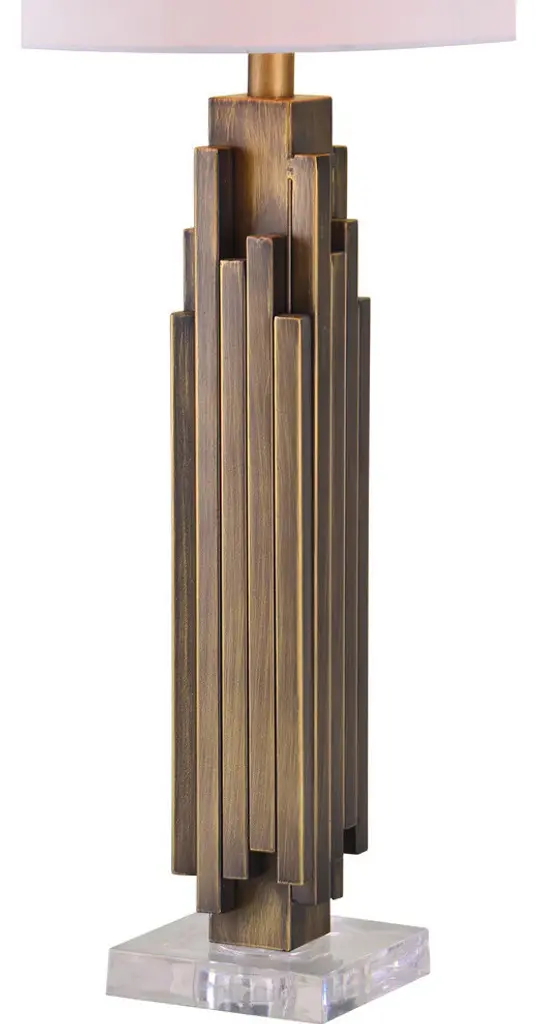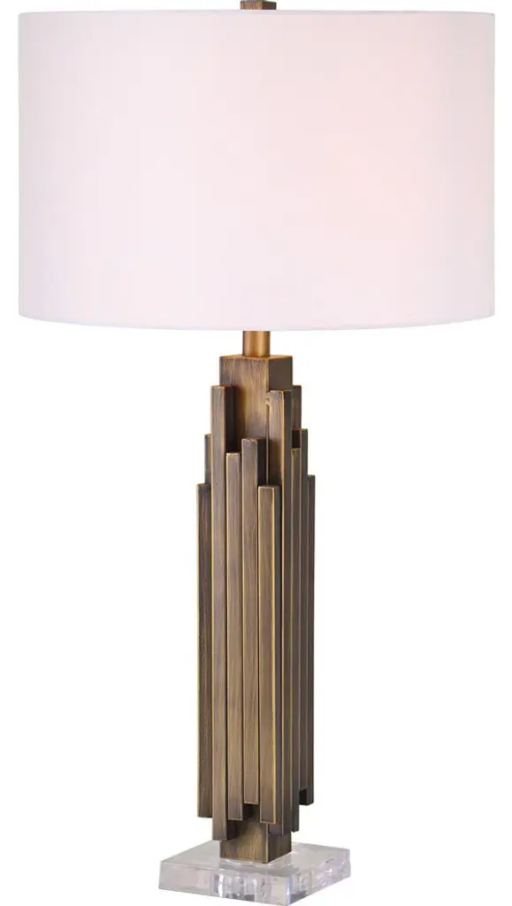 The striking profile of this modern table lamp takes its structural cues from metropolitan skyscrapers. An accent light fixture for an end table, console or desk, the clear acrylic pedestal and metal base features individual columns of forged iron that wrap around the rectangular pillar in an offset pattern that emphasizes its vertical design lines. The contemporary table lamp is finished with an antique bronze patina and topped with an off-white cotton drum lampshade.