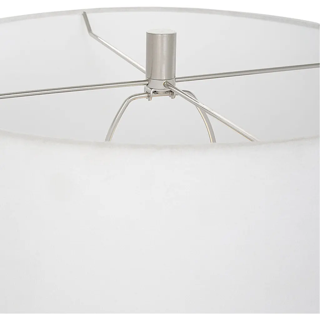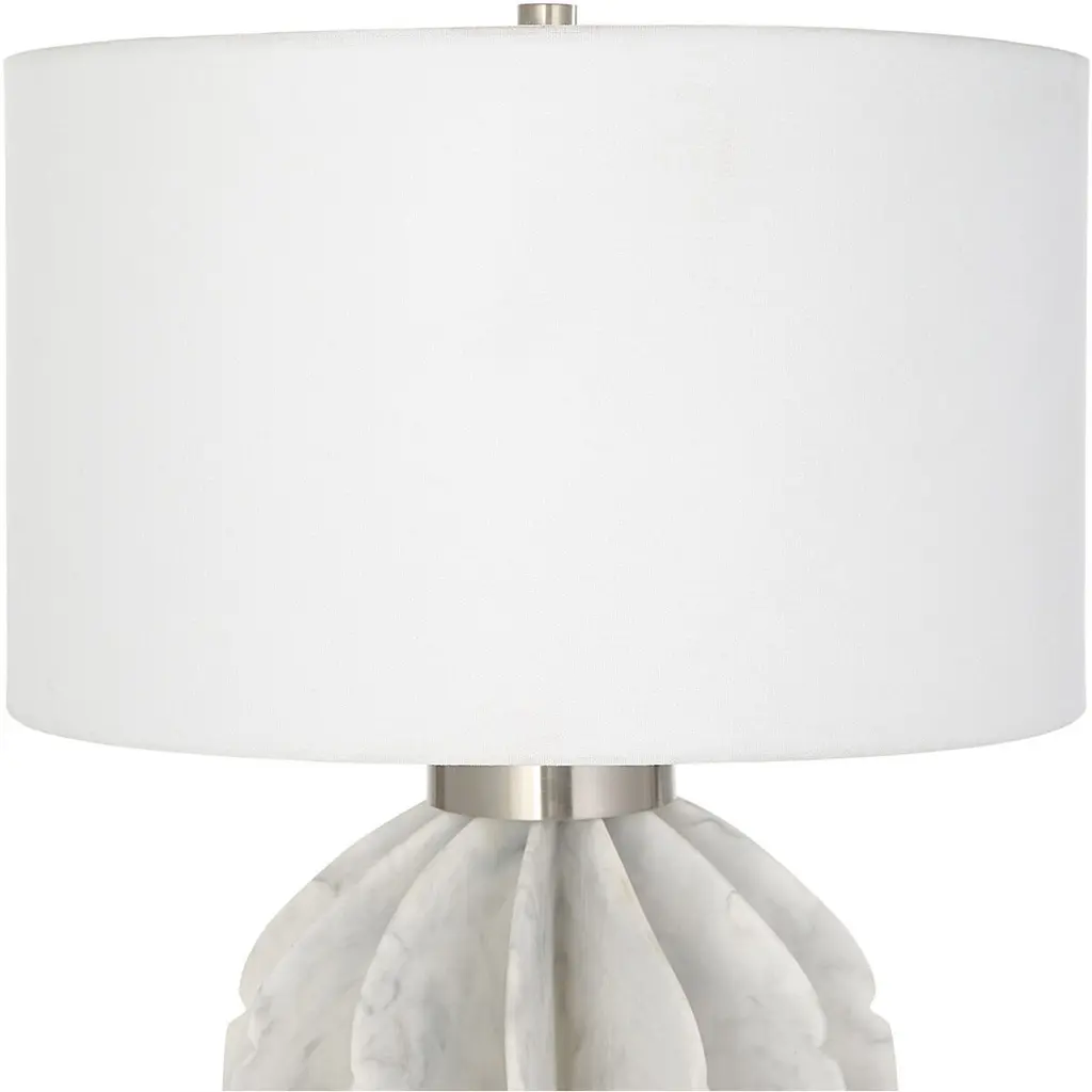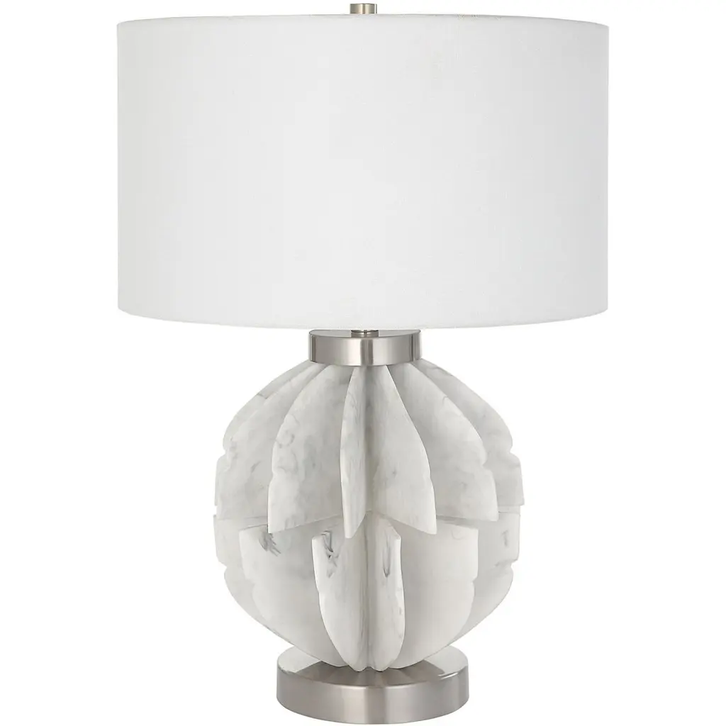 This Contemporary Table Lamp Features Thin Stacked Blades That Create An Organic Sphere Finished In A White Marble Look Accented By Plated Brushed Nickel Accents. The Lamp Is Paired With A White Fabric Drum Shade.