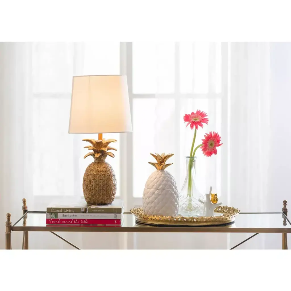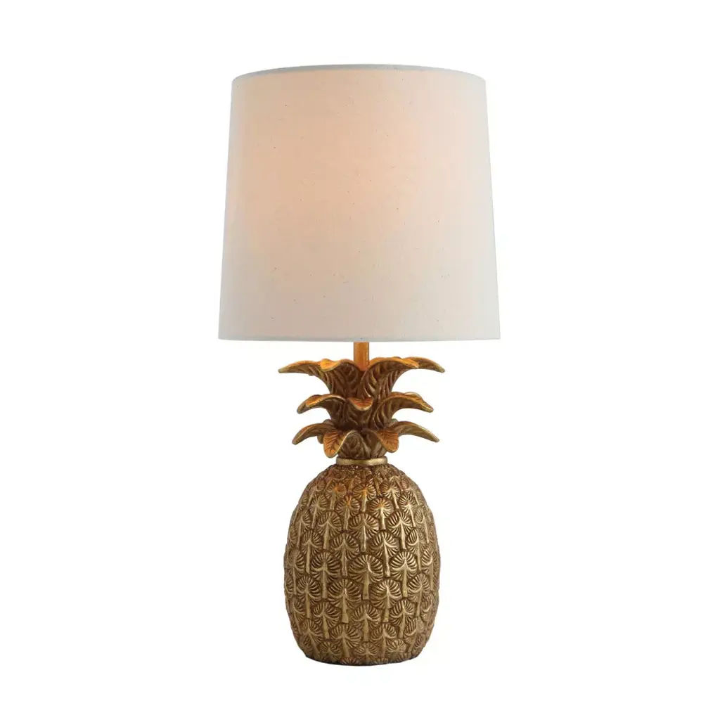 Add some style and personality to the space with this gold resin pineapple table lamp. This table lamp showcases a playful resin pineapple base that has a distressed gold finish and a metal accent. The pineapple base adds a touch of contrast and whimsy to the lamp. The lamp is topped with a linen shade that creates a cozy and inviting atmosphere. This table lamp is suitable for enhancing any style of home décor, from tropical to modern. Use it in the living room, bedroom, office, or any other area that needs some extra fun and brightness. This table lamp requires one 60-watt bulb (not included) and is equipped with a rotary switch for easy operation. It measures 9 inches round x 18 inches in height, and the cord length is 5 feet. Add this gold resin pineapple table lamp to the home and enjoy its beauty and functionality.