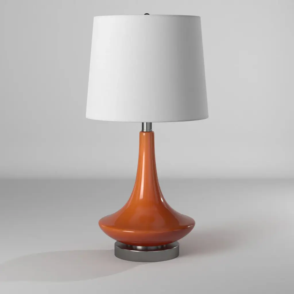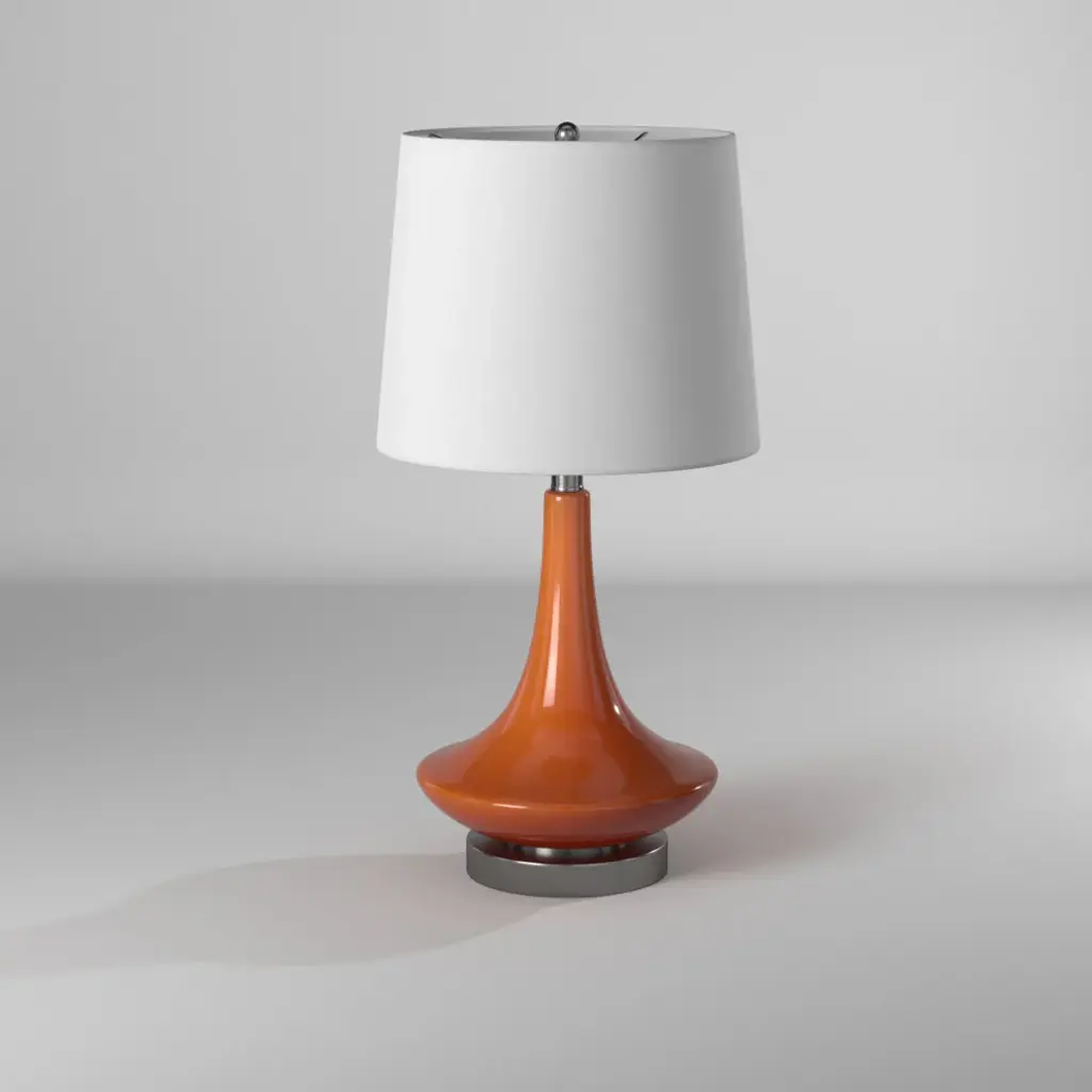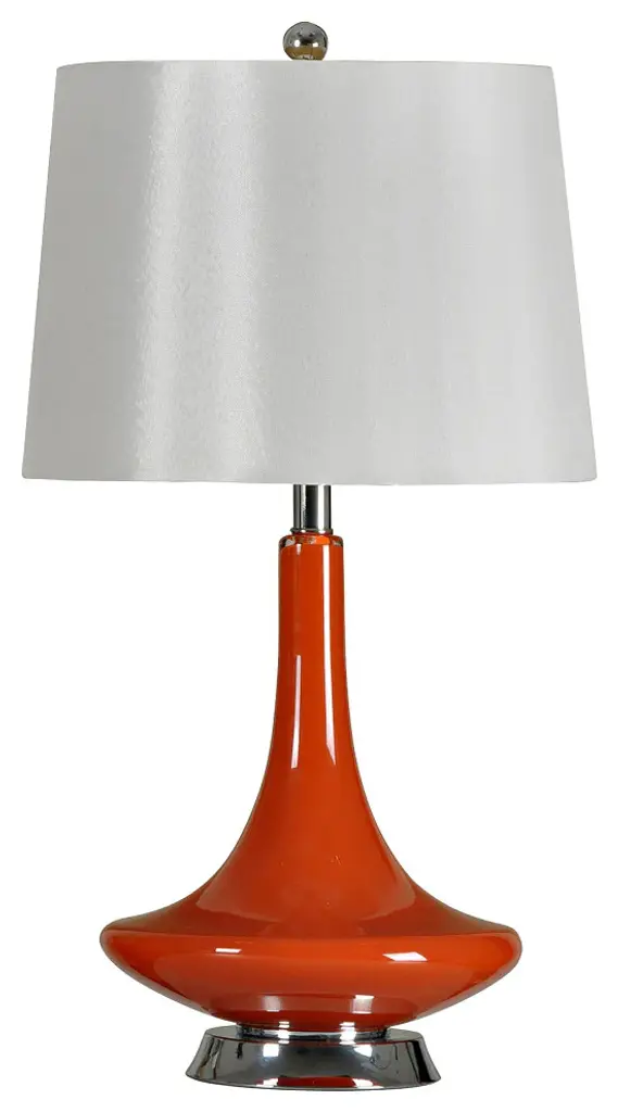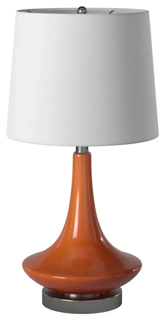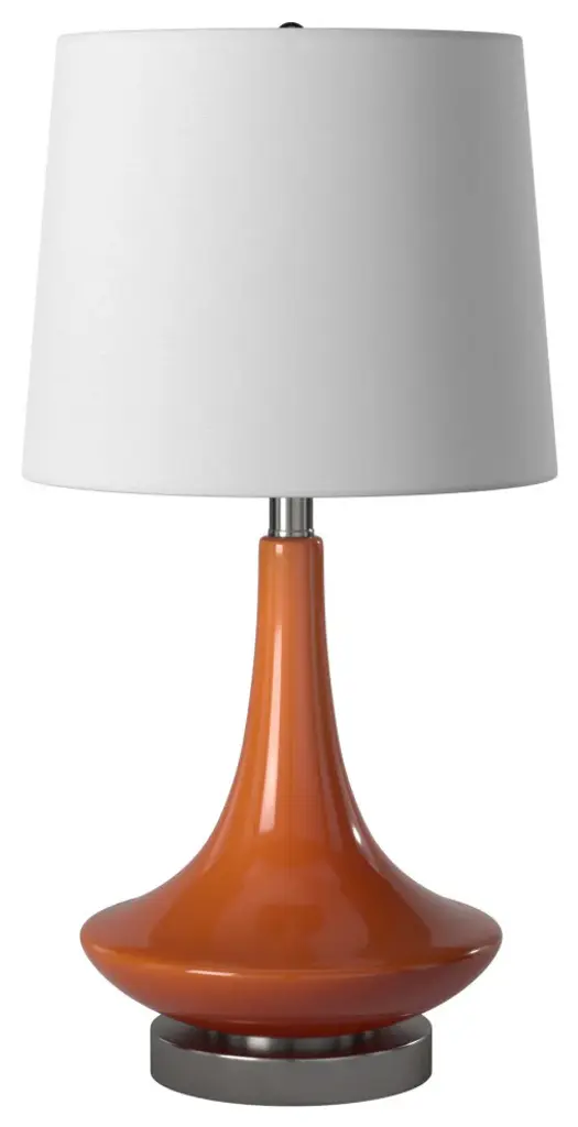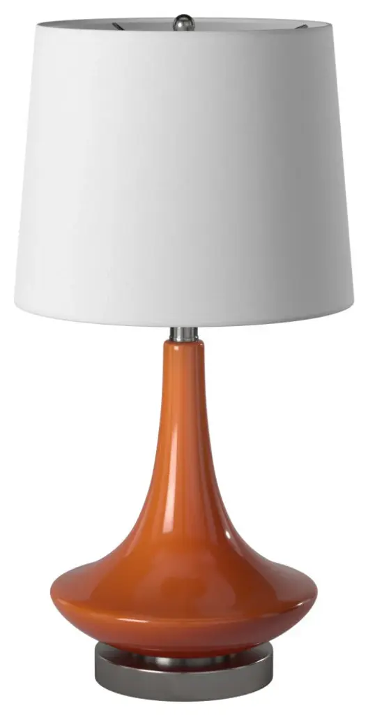 Accent your decor with this lovely Table Lamp.Features: Finish: OrangeShade Finish: WhiteMaterial: Glass , Steel Shade Material: Hardback FabricLength: 14 inchesWidth: 14 inchesHeight: 26 inchesVoltage: 120VWattage: 150Safety Rating: Dry Location - This item is rated for dry locations, meaning it can be used in an indoor area that is not normally subject to dampness. May include a location subject to temporary dampness provided ventilation is adequate to prevent any accumulation of moisture such as the bathroomBulb(s) Included: NoBulb Type: IncandescentNumber of Bulbs: 1 | Due to the production process, each piece is unique and no two are exactly alike. | Harp Height and Finish: 8", Silver | Finial Height and Description: 1", BallBulb Shape: A21Socket Type: E26Due to lighting and monitor differences, actual colors and finishes may vary slightly from what appears online.