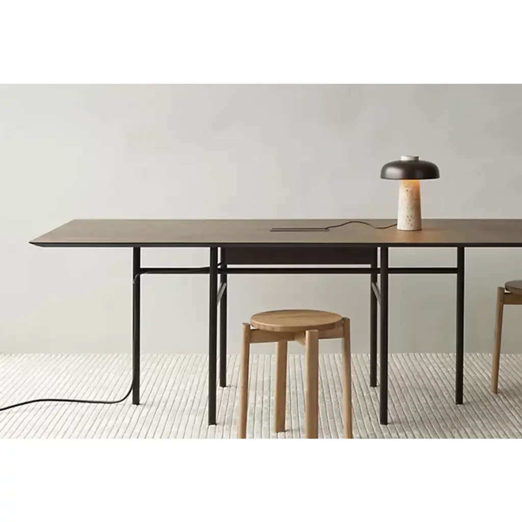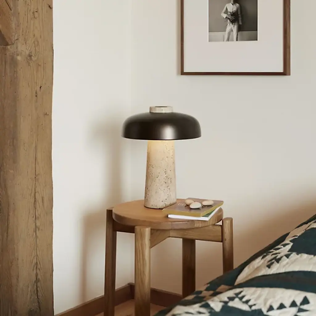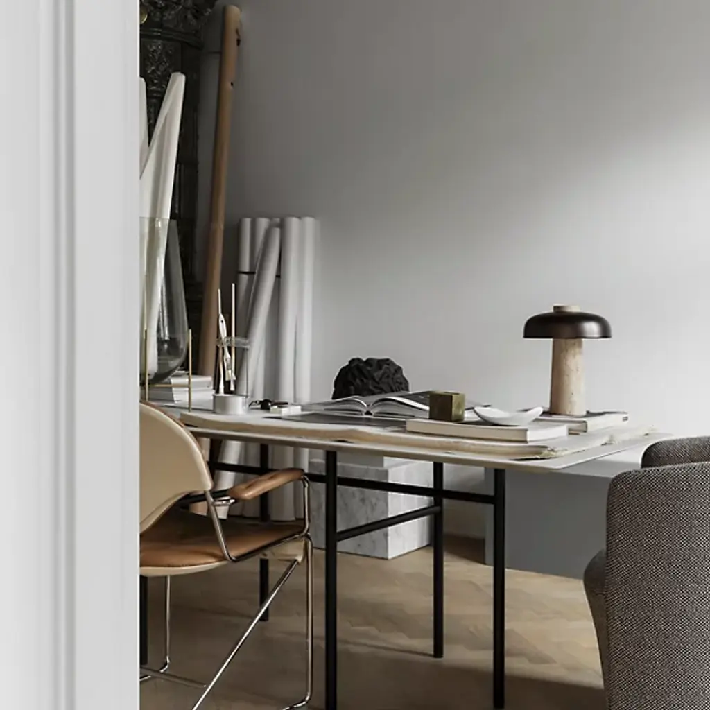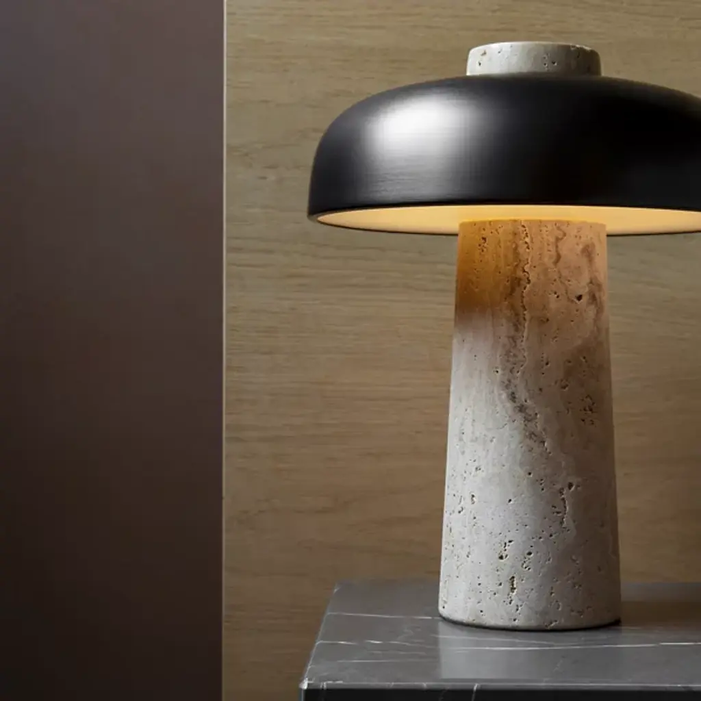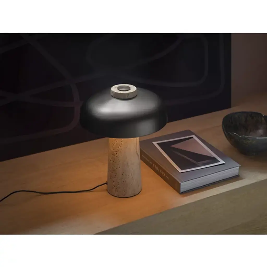 The Reverse LED Table Lamp by Audo Copenhagen, formerly known as Menu, has a simple, geometric design that balances different natural materials together. Aleksandar Lazic, the Danish designer, was inspired by the natural, unpolished look from 1970's Italian marble tables. The base of the table lamp is made from unfinished travertine, while the shade is made from spun aluminum and finished in bronzed brass, adding a more polished look to the fixture. The integrated LED light source is hidden under the shade, and creates an indirect lighting source.