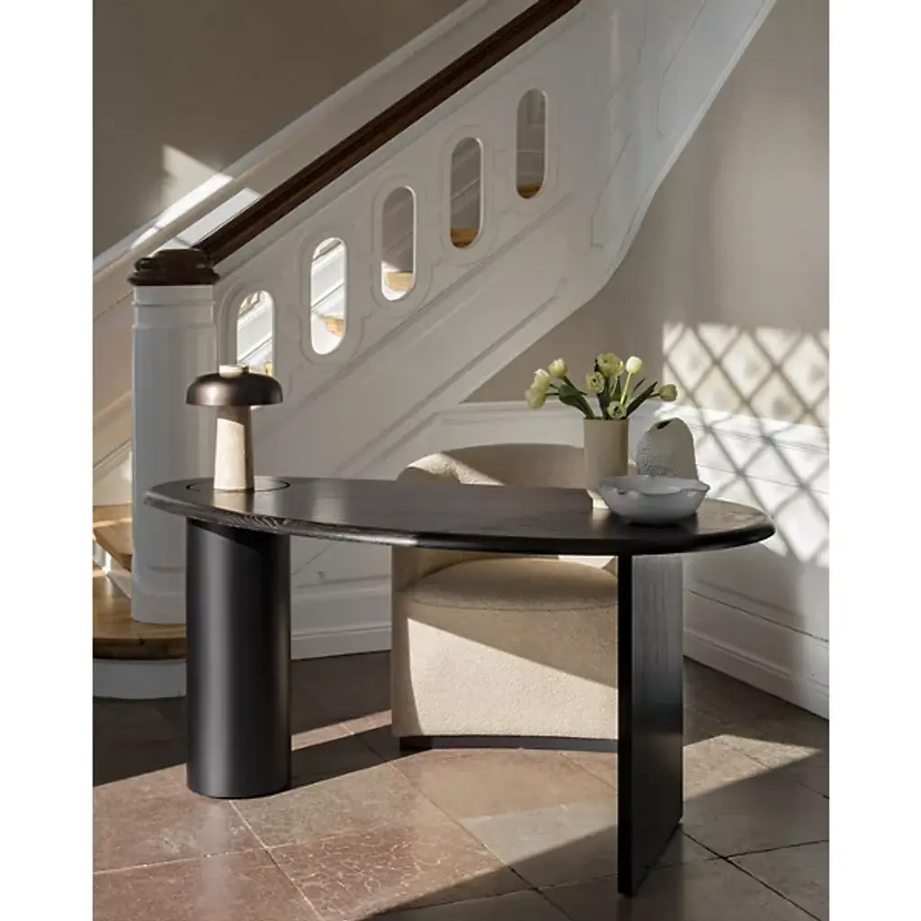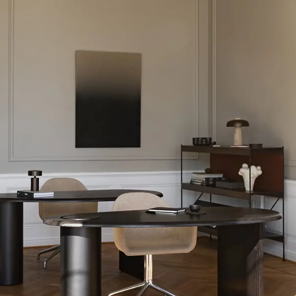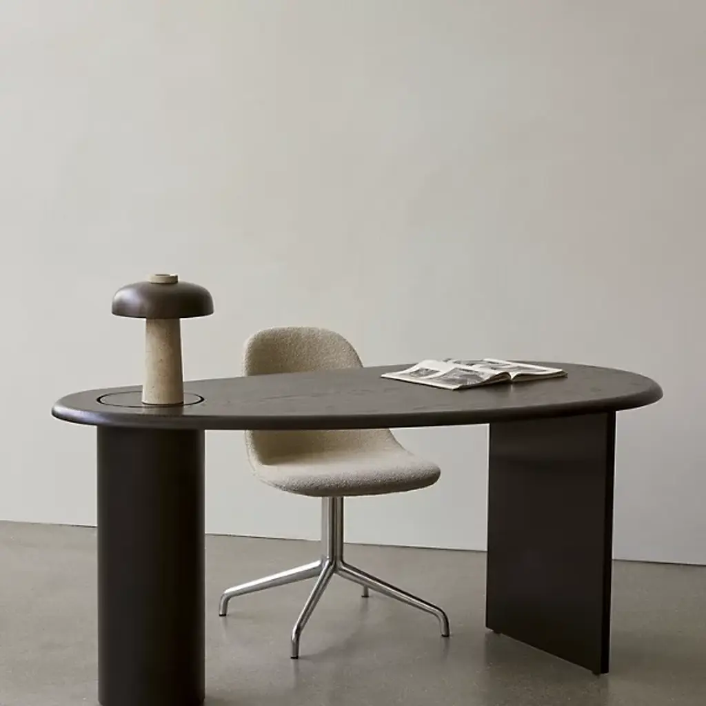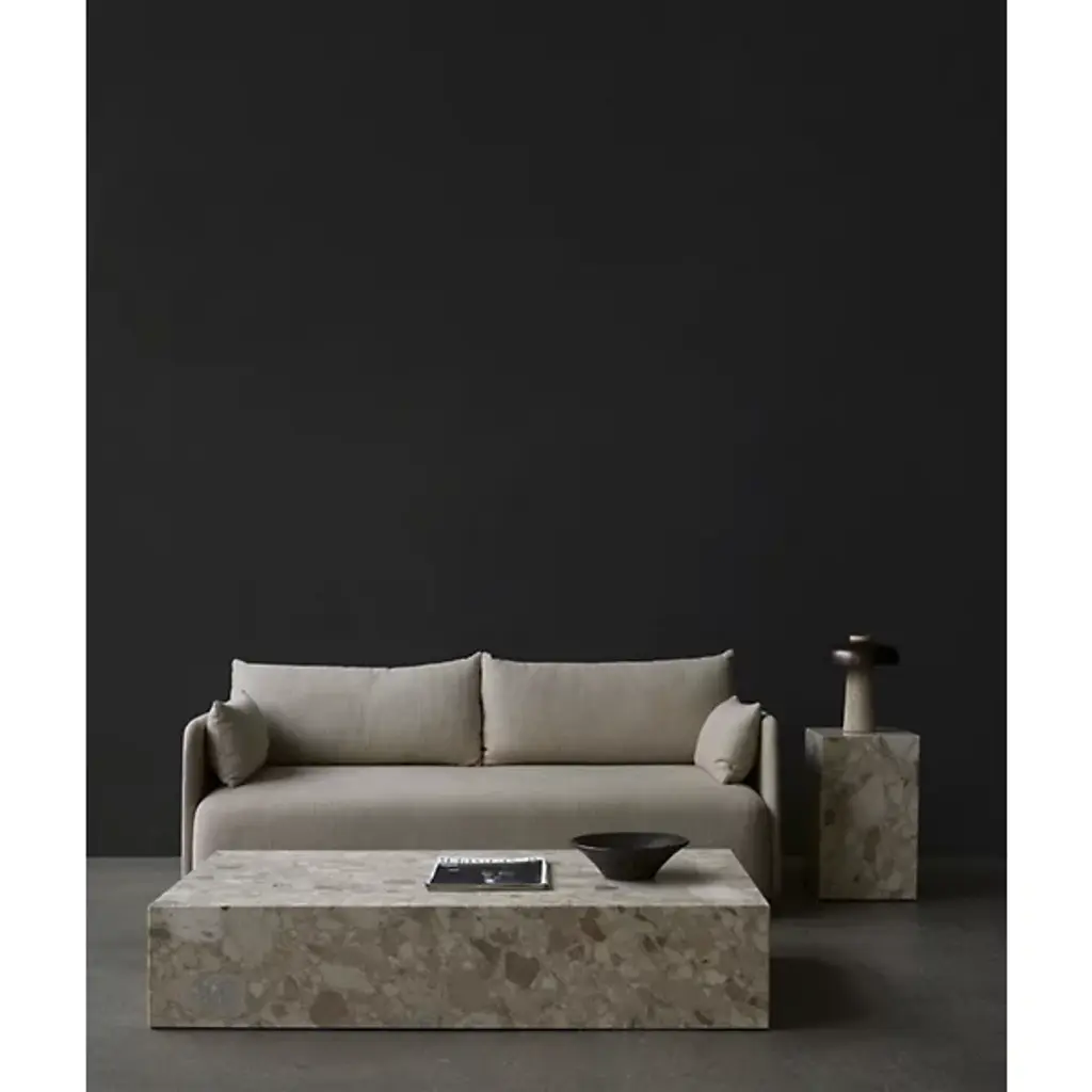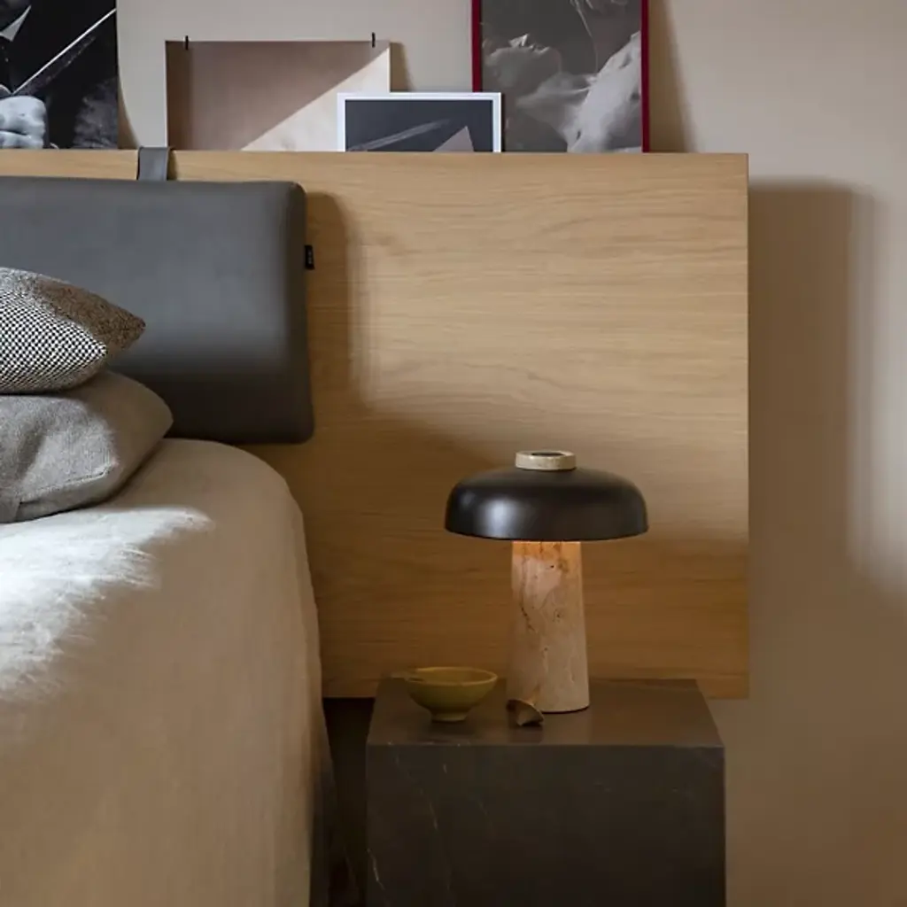 The Reverse LED Table Lamp by Audo Copenhagen, formerly known as Menu, has a simple, geometric design that balances different natural materials together. Aleksandar Lazic, the Danish designer, was inspired by the natural, unpolished look from 1970's Italian marble tables. The base of the table lamp is made from unfinished travertine, while the shade is made from spun aluminum and finished in bronzed brass, adding a more polished look to the fixture. The integrated LED light source is hidden under the shade, and creates an indirect lighting source.