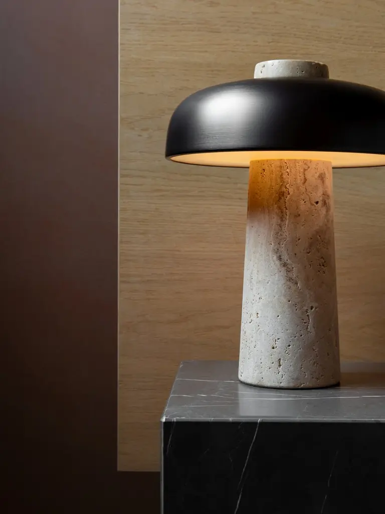 Audo presents Reverse Lamp, a new lighting solution that underpins the ever-present beauty of natural materials. In his search for simple and clever solutions in any given space, Danish designer Aleksandar Lazic looked to Italian marble tables from the 1970s when creating the Reverse Lamp. Inspired by the play on structure created by geometric constraints, the conical travertine base and curved, bronzed aluminum shade define the lamp’s perfectly balanced expression. The light diffuses evenly across the unworked stone, left raw to allow the light to highlight its natural imperfections, revealing shadows and an intriguing color play that seems to stem from the base itself. At precisely the point at which the shade and base meet sits a dimmer switch for adjusting the light intensity. Fitted with a dim-to-warm LED light source, the Reverse Lamp casts warm light on a bedside table or subdued light on a cabinet surface, making it an elegant and characterful solution to a multitude of lighting needs.