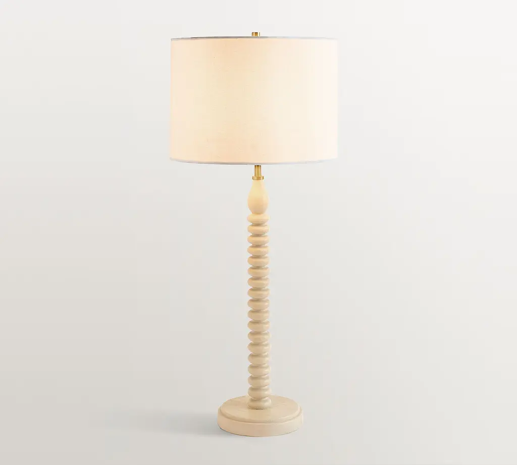 With its soft palette of updated neutrals, this quietly luxurious look is ideal for todays interiors. The table lamp features a dramatically turned mango wood base, and it is topped with a tapered white linen slub shade. The easy, classic vibe is accentuated with quality, coordinating metal hardware. Try two on a console, or display on a side table to provide soft illumination in a dark corner.