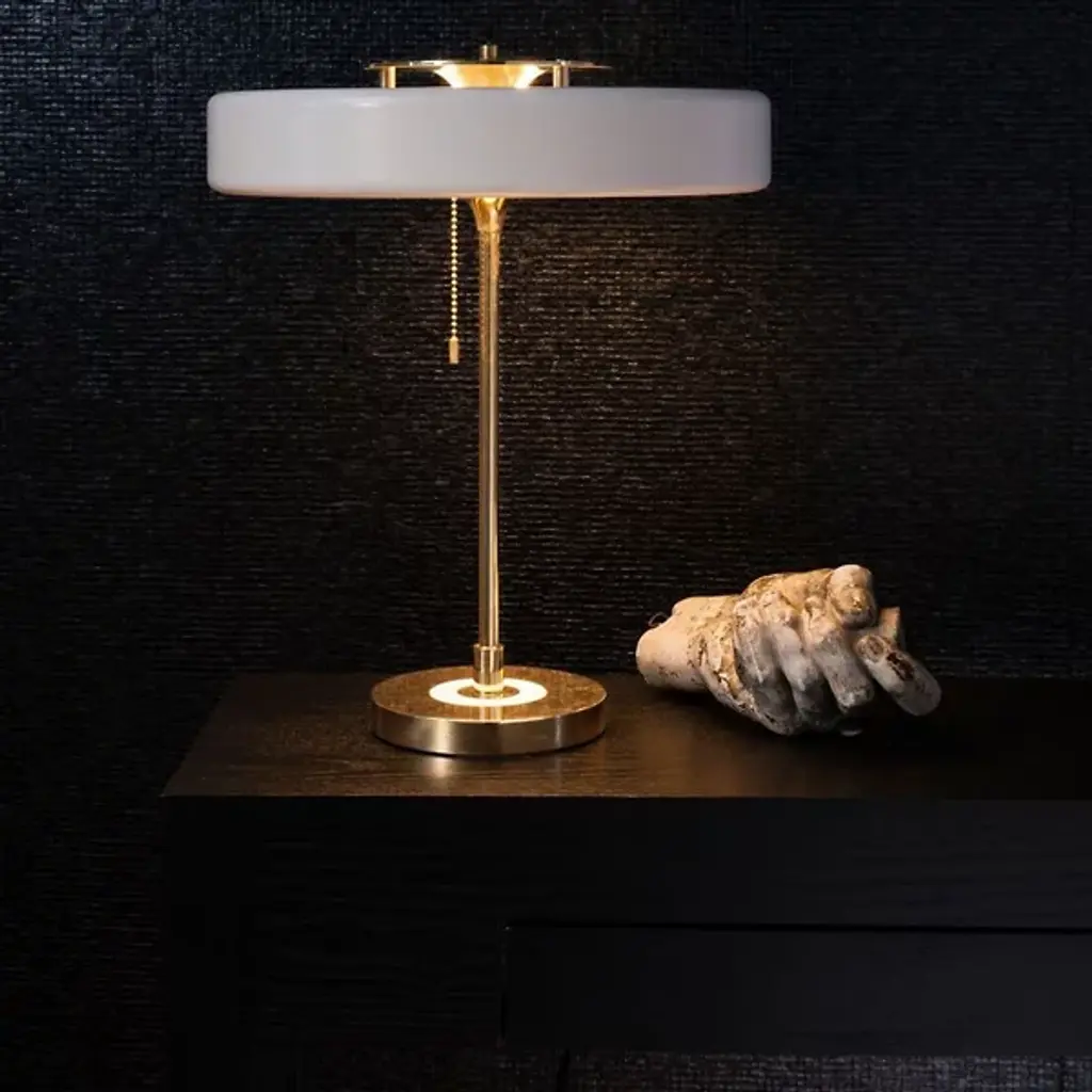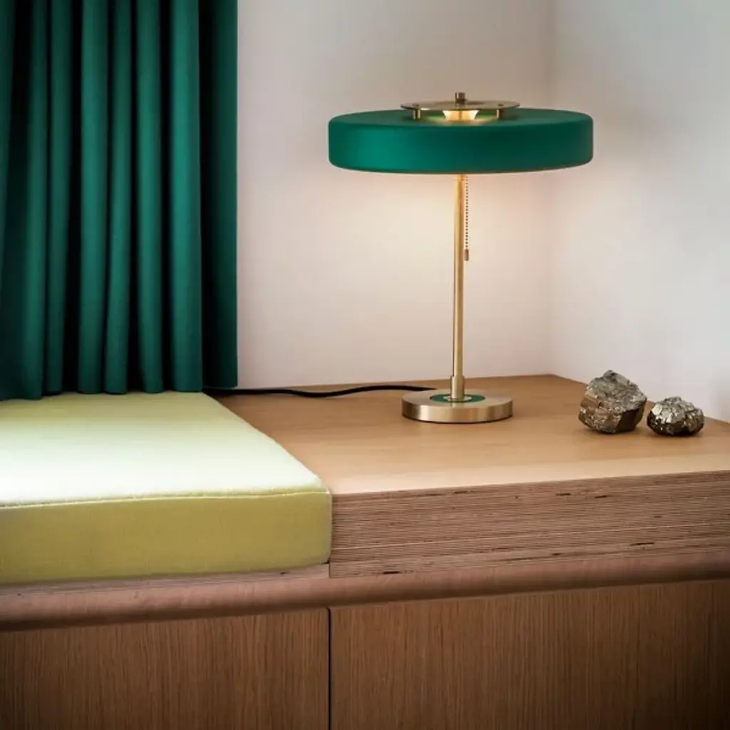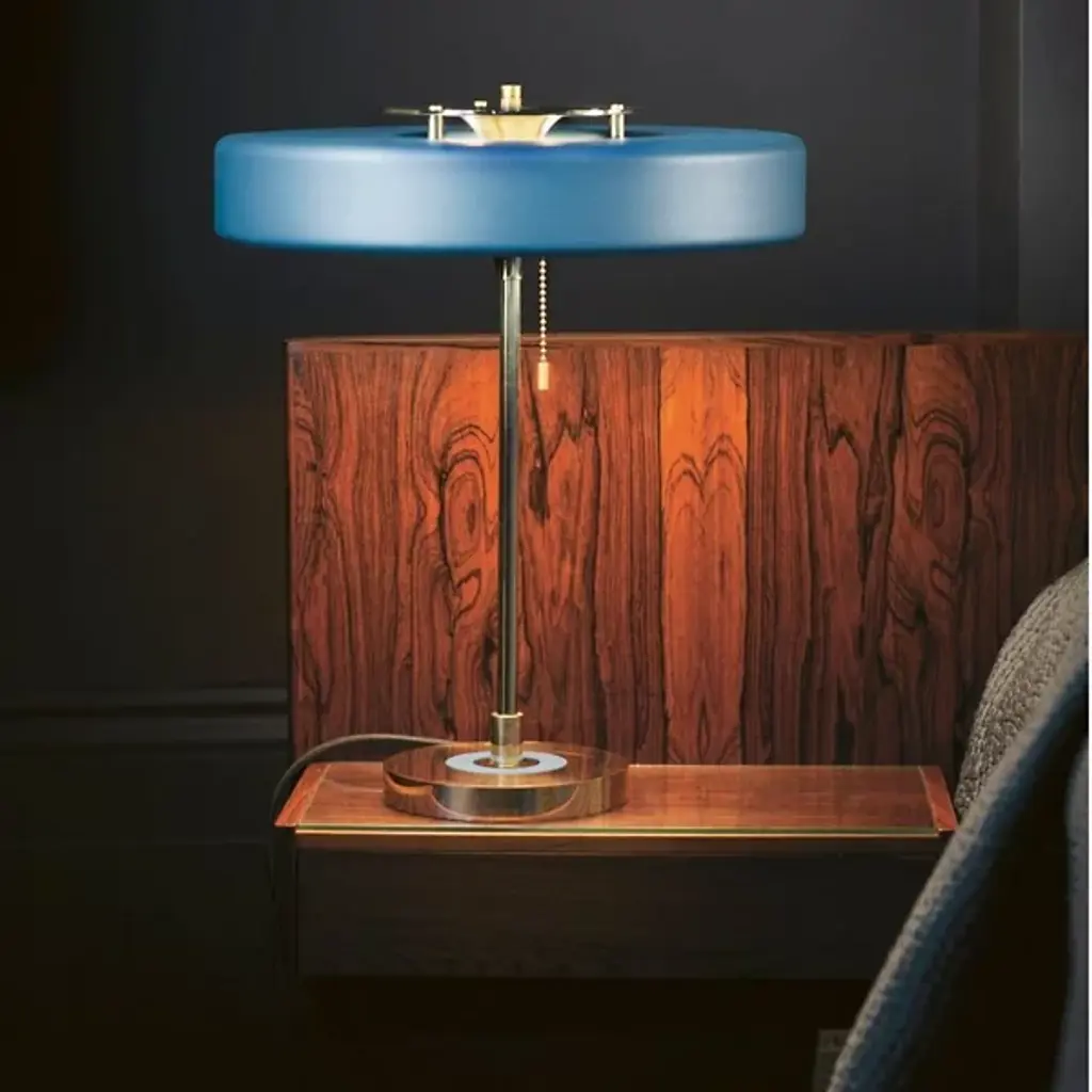 Solid, confident, elegant. Heighten the ambiance in your rooms with the handcrafted, mid-century-inspired design of the Revolve Table Lamp from Bert Frank. All of Bert Frank’s work represents something the studio would place in their home, weighty designs that produce a crisp edge and a sturdy feel. This enduring quality is reflected from top to bottom on the table lamp. It stands firmly over your table in a color-coded metal base and slender column. The spun metal shade above reiterates the color of the base, adding a dose of modern style. The eyes travel up to the lifted metal disc above the disc; this accent adds a contrasting pop that illustrates the way Bert Frank’s piece inspires the feeling of touch. Speaking of touch, a metal chain pull below feels elegant against the fingers. A simple tug generates a spread of diffused ambient illumination through a polycarbonate shade.