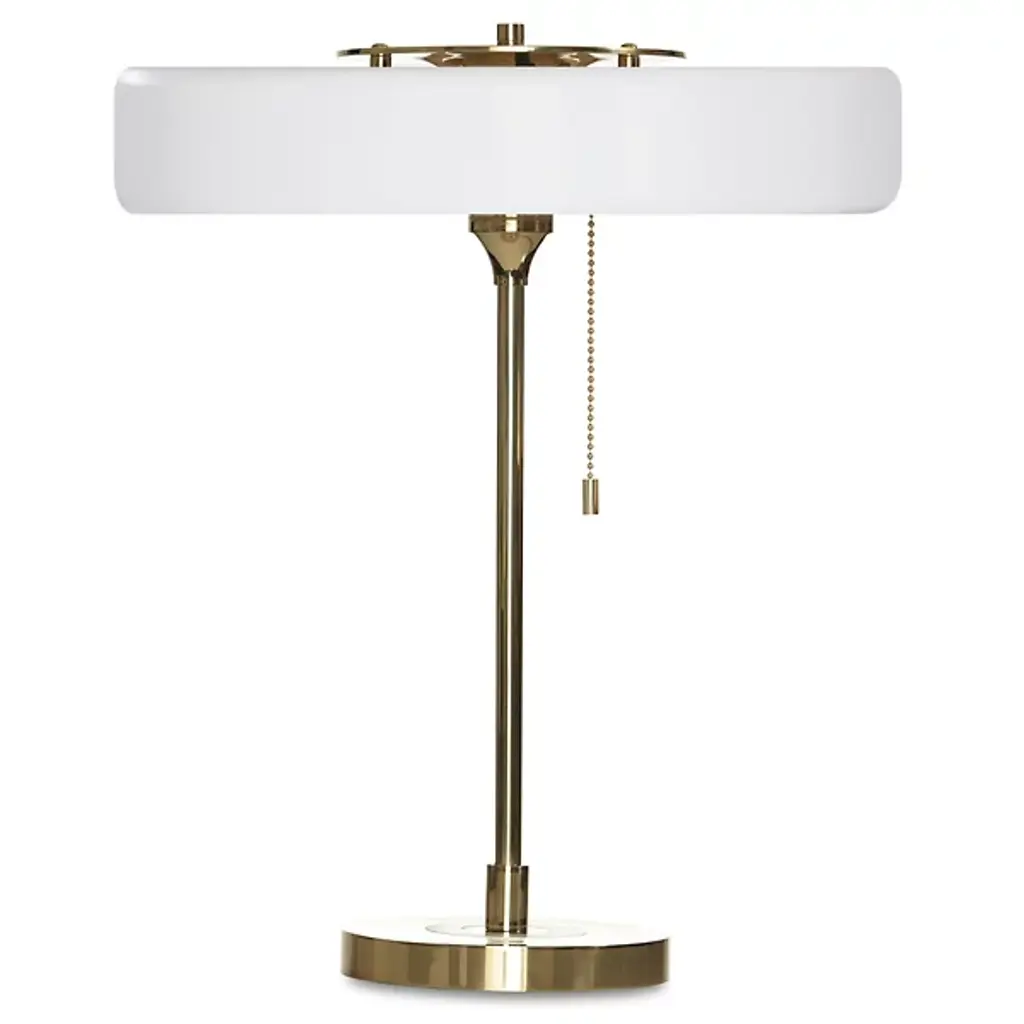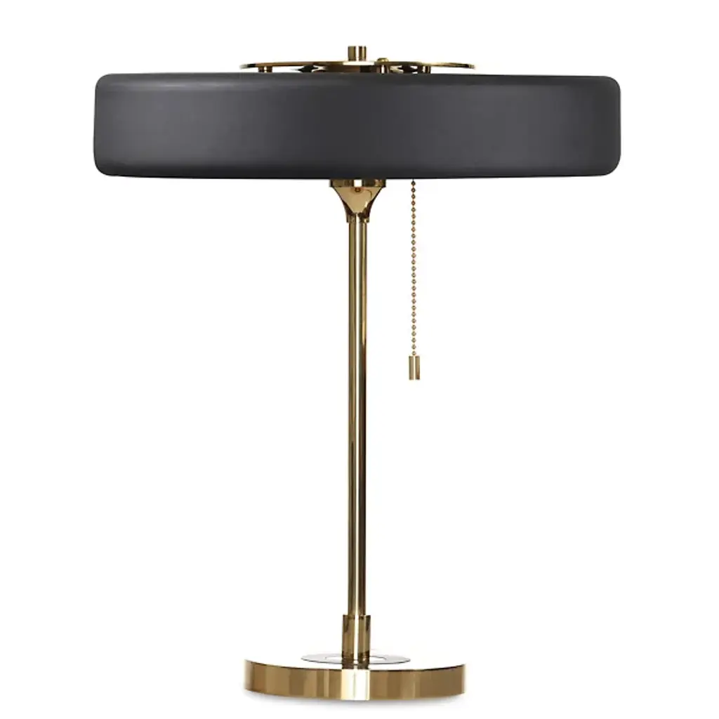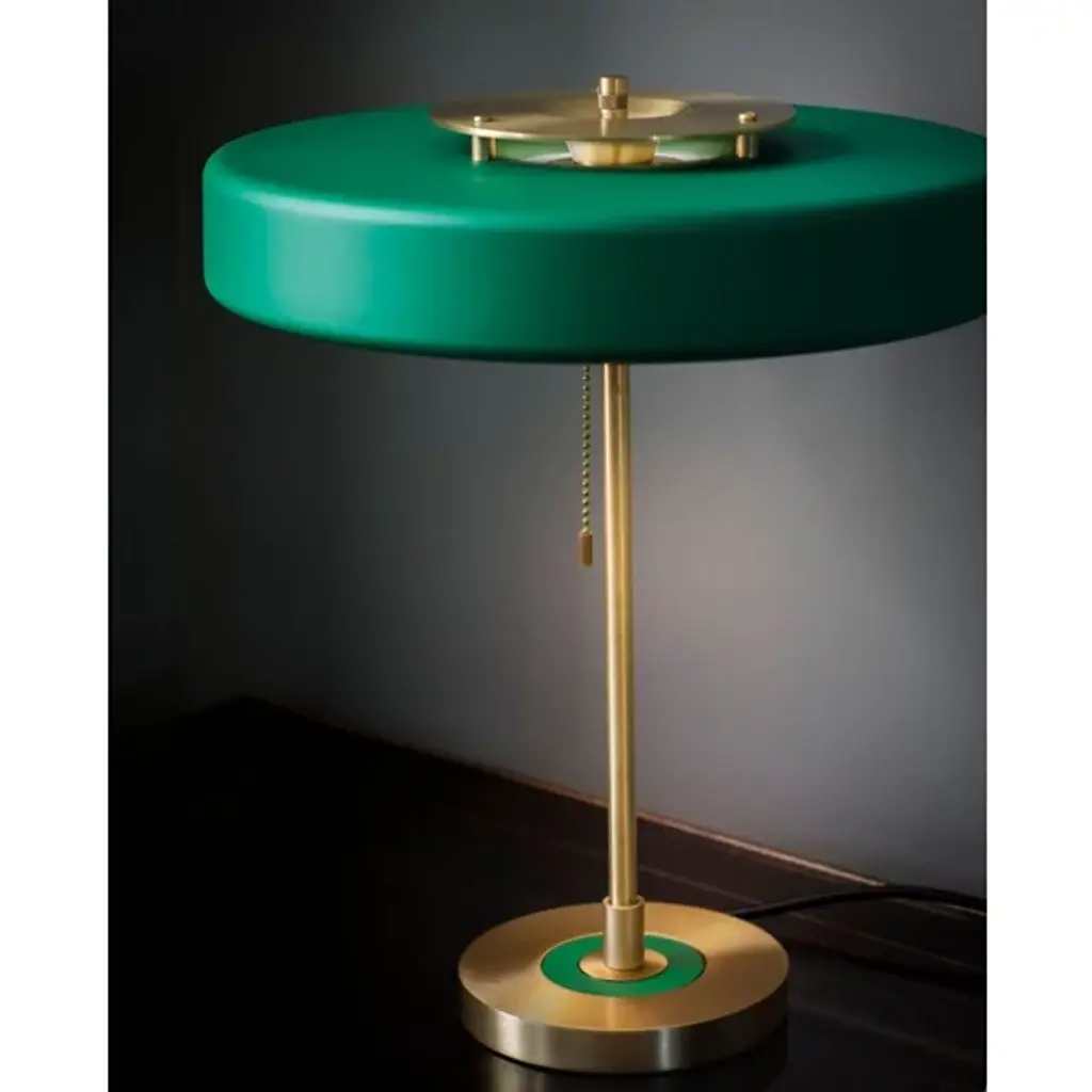 Solid, confident, elegant. Heighten the ambiance in your rooms with the handcrafted, mid-century-inspired design of the Revolve Table Lamp from Bert Frank. All of Bert Frank’s work represents something the studio would place in their home, weighty designs that produce a crisp edge and a sturdy feel. This enduring quality is reflected from top to bottom on the table lamp. It stands firmly over your table in a color-coded metal base and slender column. The spun metal shade above reiterates the color of the base, adding a dose of modern style. The eyes travel up to the lifted metal disc above the disc; this accent adds a contrasting pop that illustrates the way Bert Frank’s piece inspires the feeling of touch. Speaking of touch, a metal chain pull below feels elegant against the fingers. A simple tug generates a spread of diffused ambient illumination through a polycarbonate shade.