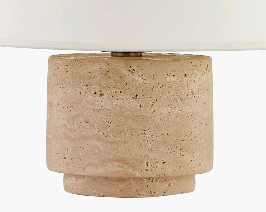 A tapered paper shade beautifully frames Rhea's natural travertine base, directing light down and around to highlight its organic texture and markings. A Patina Brass accent gives this earthy table lamp a hint of sophisticated detailing. Overall dimensions: 14.5"h. x 12"diam., E26 Medium Base Weight: 13 lbs Uses 1 Bulb Cord Length: 144" Plug In Assembly Required Receives UPS delivery