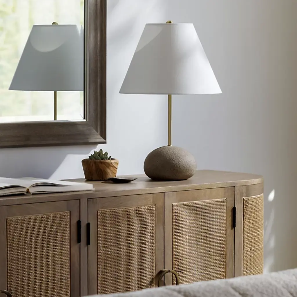 The Rhodes Table Lamp from Surya pairs the substantial weight of cement with the lightness of cotton for an engaging material contrast. Its empire-shaped cotton shade diffuses light with a soft quality that flatters surrounding textures. This country-inspired design brings cottage charm to bedside tables and reading corners without feeling overly rustic. Its simple on/off socket switch provides a straightforward function, and its iron accents introduce a subtle definition that frames the cement structure. This practical lamp delivers unpretentious style alongside genuine functionality for spaces where authenticity matters.
