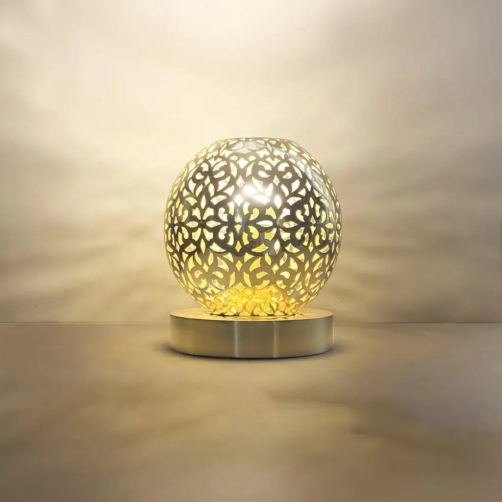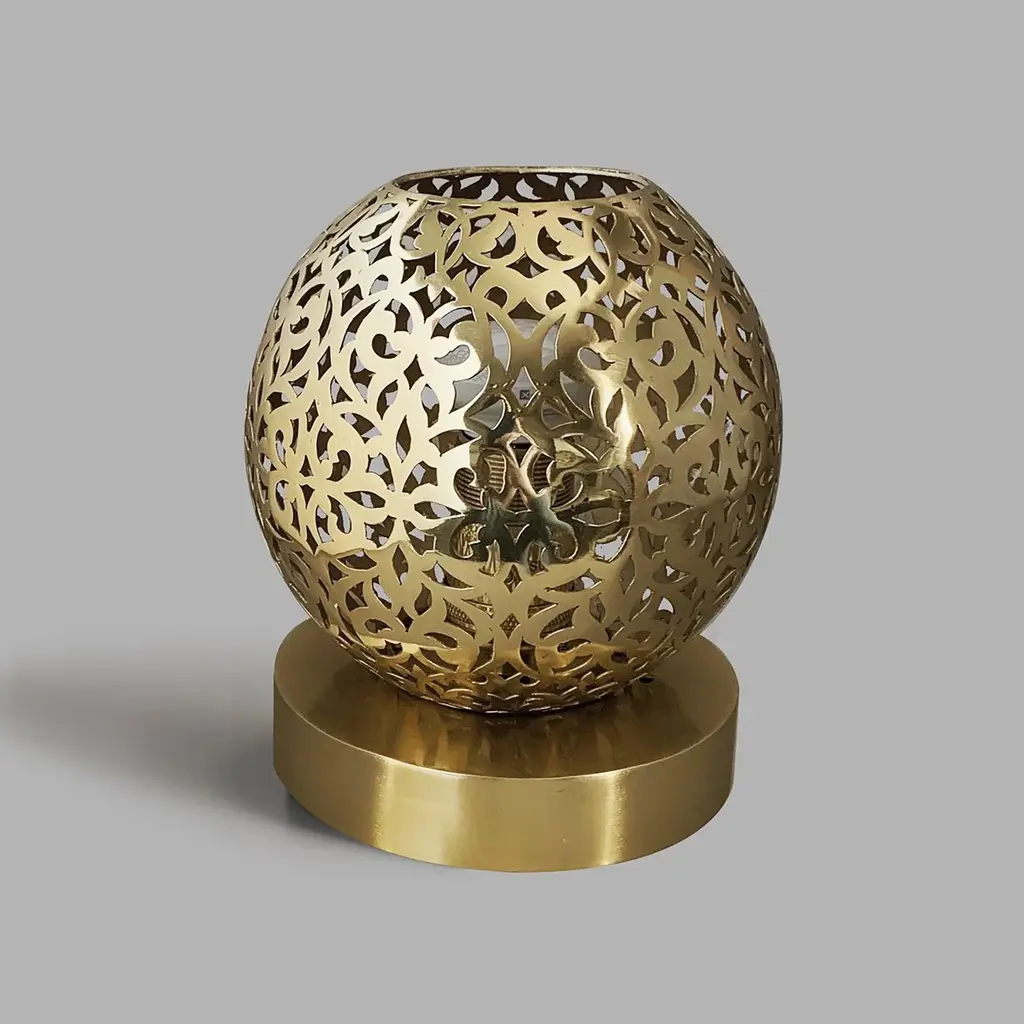 The Riad Brass Metal Table Lamp is a nod to the Riad style of living in Morocco. An intricate pattern is hand etched into a sphere-shaped metal lamp. Hand-cut by master artisans in Marrakech using locally sourced materials the mettalic brass lamp is hammered and positioned atop a matching stationary stand. Reflect light elegantly and uniquely with the Riad metal table lamps. Each metal lamp is sealed with a topcoat to preserve its color.
