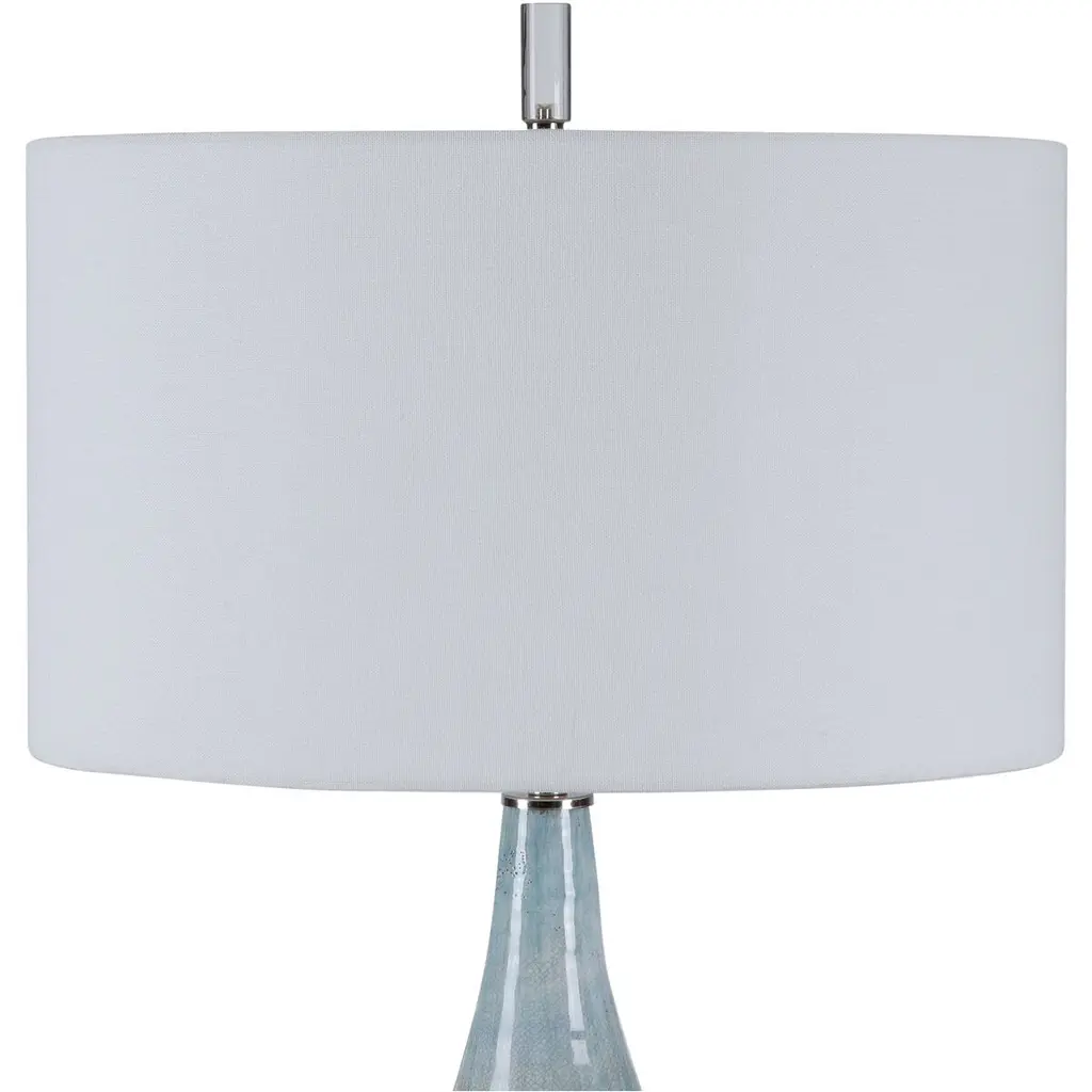 Showcasing A Refined Coastal Style, This Table Lamp Has A Ceramic Base Finished In An Aqua And Teal Crackle Glaze With Touches Of Rust Brown. Polished Nickel And Crystal Accents Highlight The Design. The Lamp Is Paired With A Round Hardback Drum Shade In A White Linen Fabric.