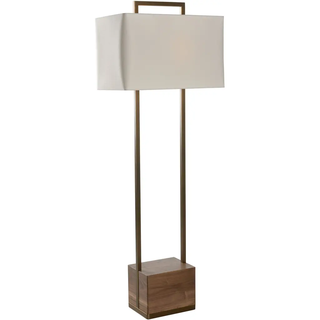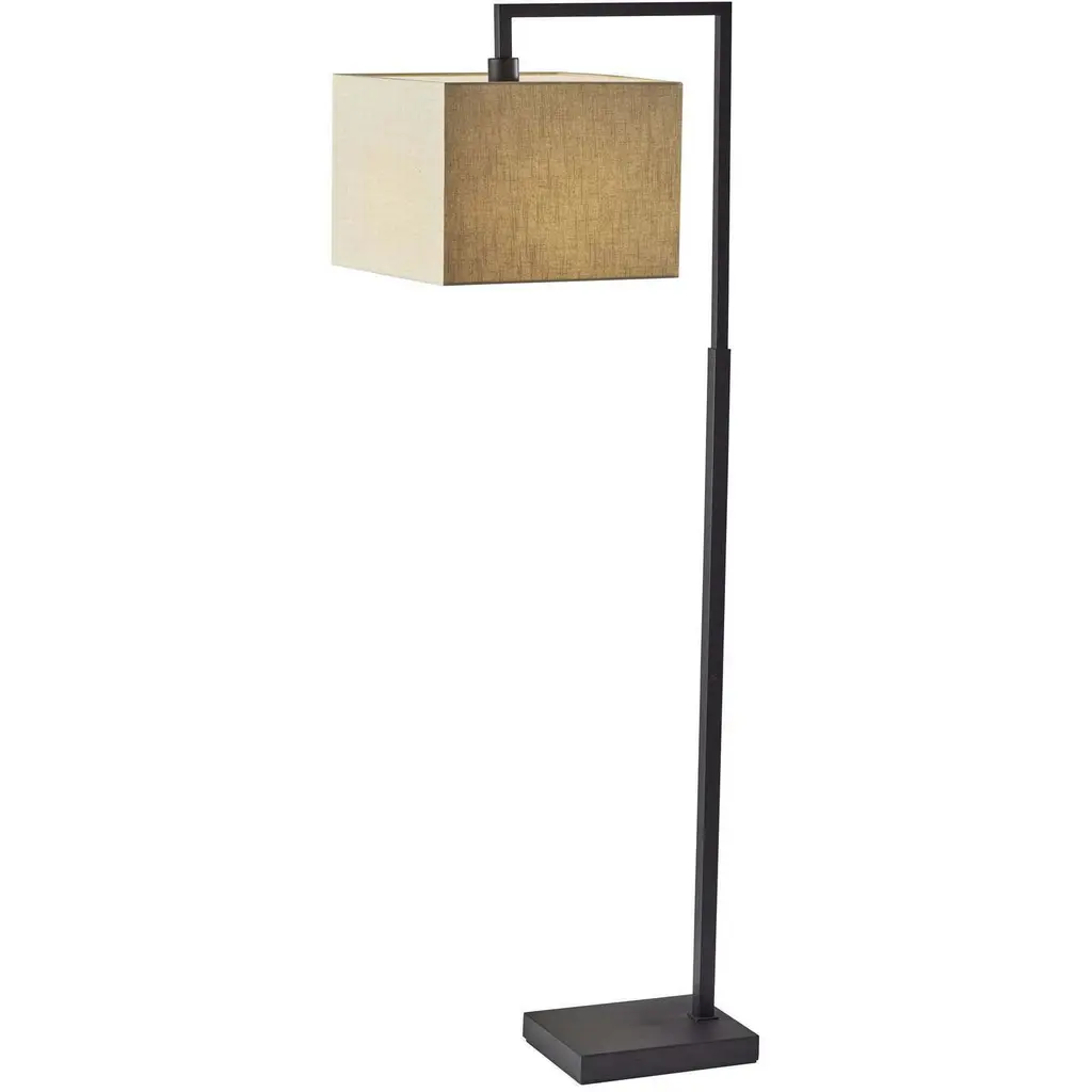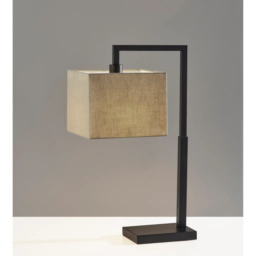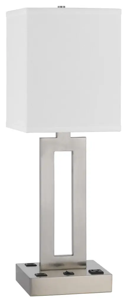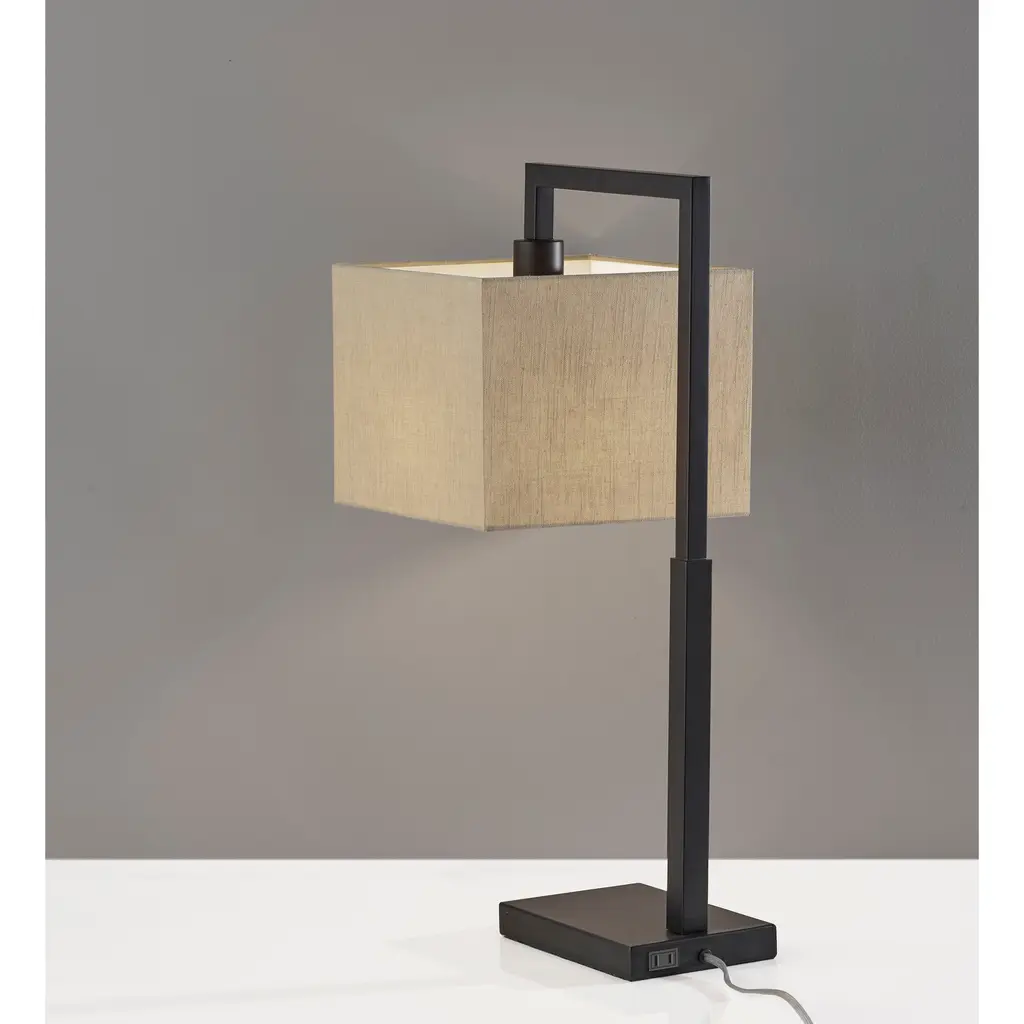 With a clean, minimalist shape and a simple color palette, the 25" tall Richard table lamp exudes modern style. It features a black metal rectangular base measuring 5.5" by 8". The black finish continues up the narrow rectangular stem leading to a square, beige textured fabric shade that softly distills the light. For convenient access to AC power on your table or desk, the base includes an outlet subtly located on the back. The 60W bulb (not included) is operated by a rotary switch located on the socket, and the lamp features a 5' clear cord. Complete your space's look with the coordinating Richard floor lamp.Features: Black metal finish with a square, beige, textured fabric shadeRequires 1 x 60.00 watts E26 bulbs (Not Included) Compatible with 16W LED BulbRotary Socket Switch60-inch CordLight Settings are On/OffScrew Down Uno Shade FitterIntegrated outlet located at the back of the base provides convenient access to AC powerSome Assembly Required1-Year Limited Manufacturer WarrantyMeasurements: Height is 25- inchesWidth is 10-inchesExtension/Depth is 15-inchesShade Dimensions are 10" Square x 8"HBase measures 5.5" x 8" Rect.Tube diameter is. 1" Sq. & .75" Sq.Weight: 5.95 lbs