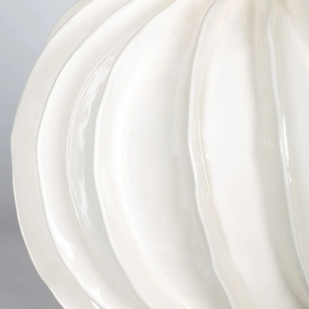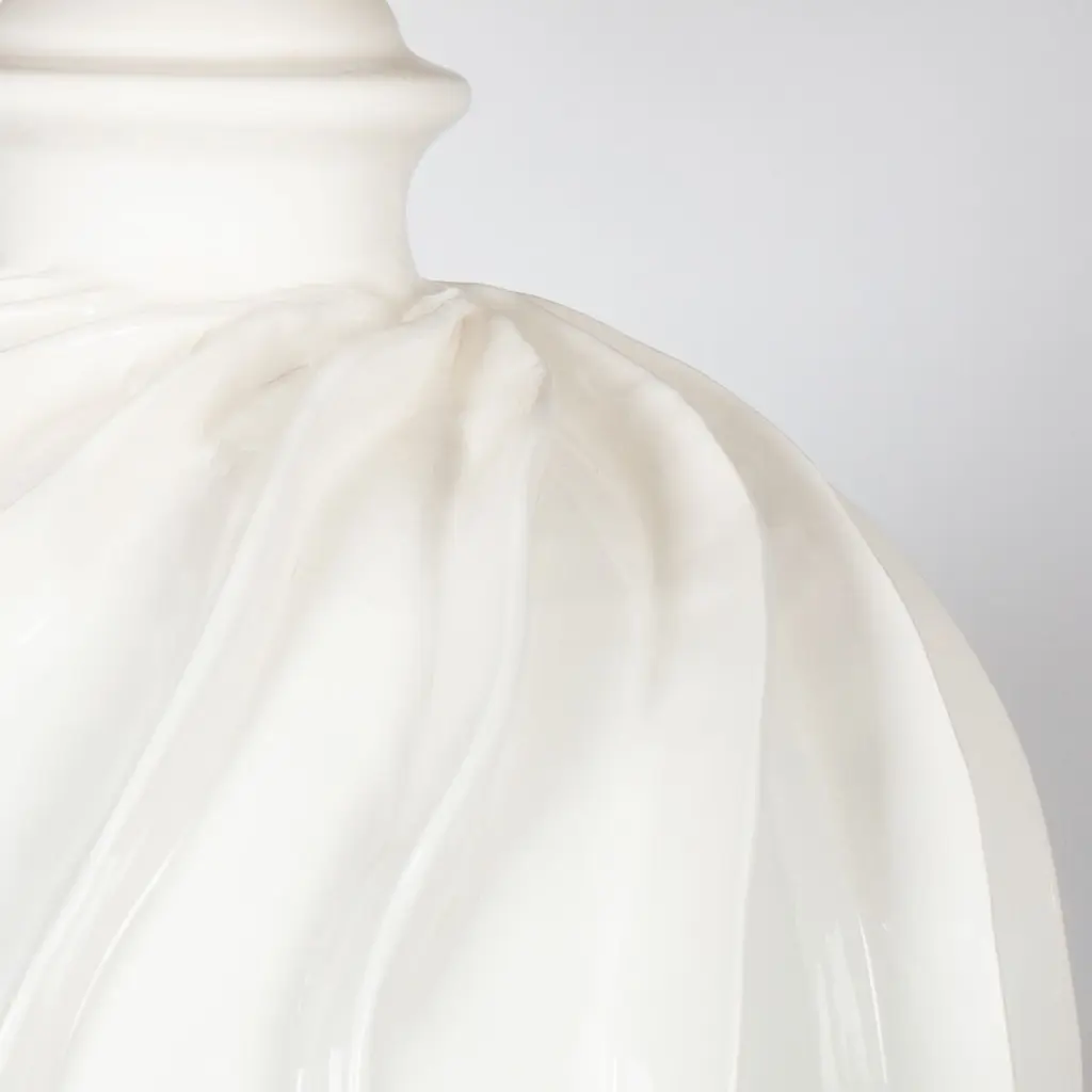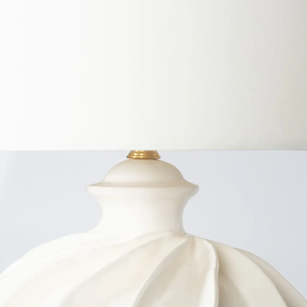 The ethereal swirling effect of the Rio Vista Blanc table lamp delivers artisanal charm with adaptability. This lamp is fashioned of creamy white ceramic and is hand-crafted in Italy. A modern drum shade joins gold leaf finish accents to produce a light source that works perfectly in a variety of settings.