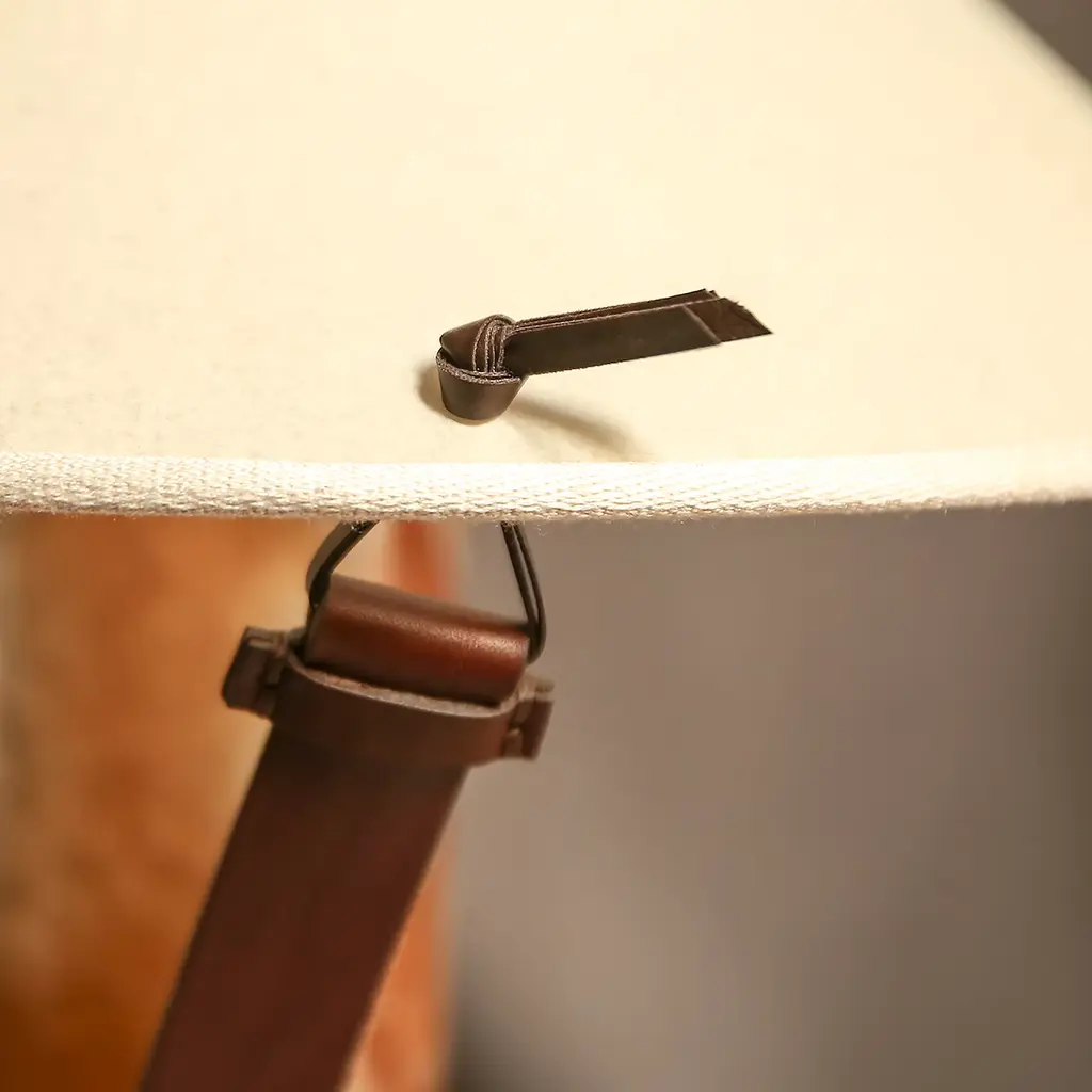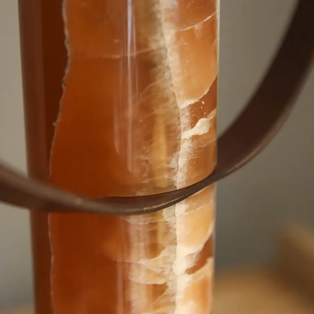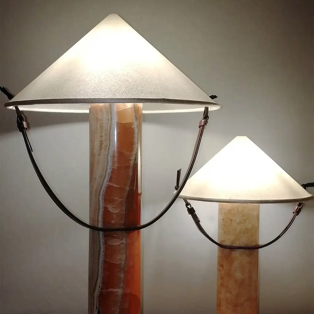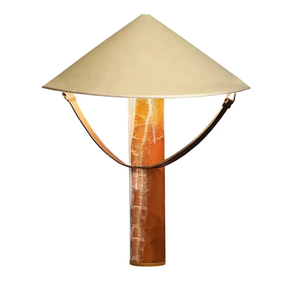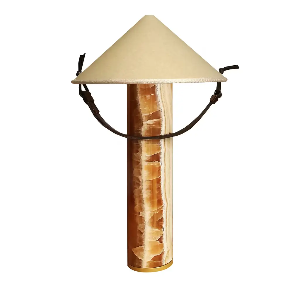 Table lamp with a cylindrical onyx base and an ivory parchment paper cone-shaped lampshade. Inspired by the oriental hat, the lampshade and onyx stem are connected by a leather band that is inserted into the base through a slit. Different types of onyx or stones are available upon request and subject to availability. The color and the finish of the lampshade are also customizable upon request. Since it is made from natural stone, each piece is unique and may differ slightly from the photos.