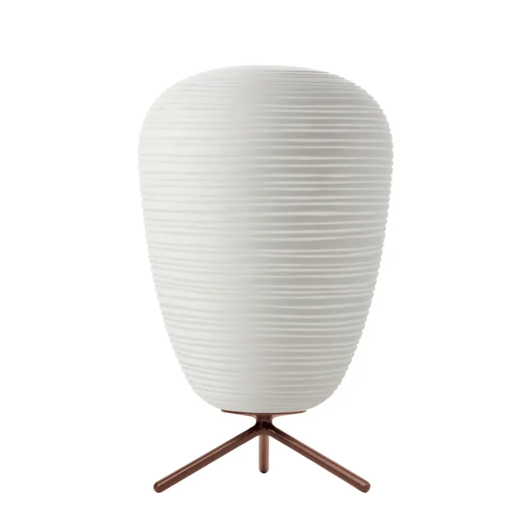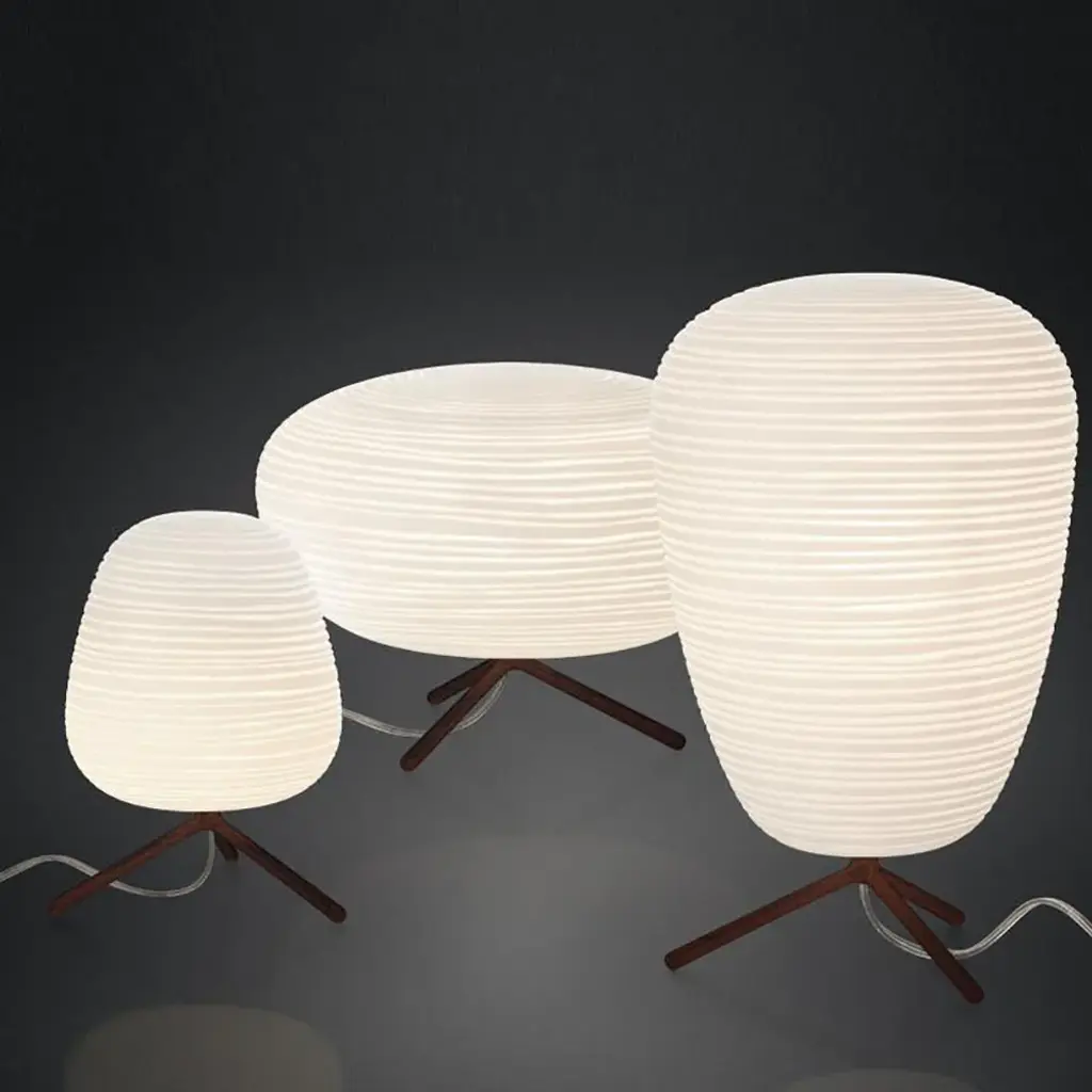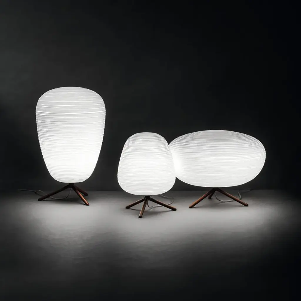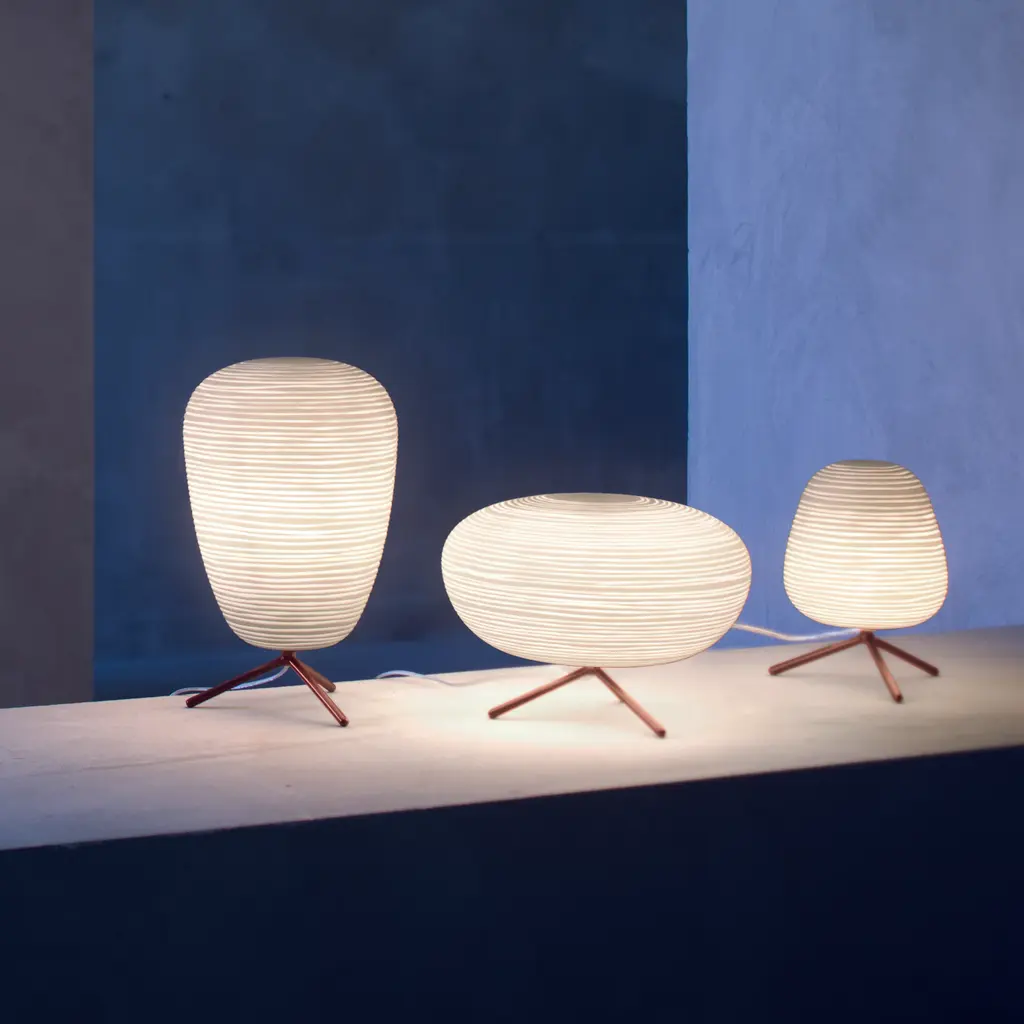 One, two, three lanterns that are lightweight yet brimming with seductive texture. Three different yet concurrently complementary shapes, balancing between the east and the west. A family of lamps that sheds its relaxing light in the most diverse settings, conveying the magic of rice paper or mulberry tree bark, the raw materials of traditional Japanese lanterns, in the precious physical appeal of blown and frosted glass. The horizontal lines which cut across the surface of the lamps give rise to a soft and charming décor and at the same time contribute to filtering the intensity of the light source, diffusing a full, warm and soft light into the room. The blown glass body – with its pleasantly plaster-like appearance – is suspended on a base consisting of three metal feet: a highly distinguishing trait, on which the lamp appears to be floating mid-air. They are perfect for use alone or in a harmonious composition of shapes; on a bedside table, a console and a table or even on the floor: for an area dedicated to relaxation or as meditation lamps, wisely lighting both the space we live in as well as our interior world. Features