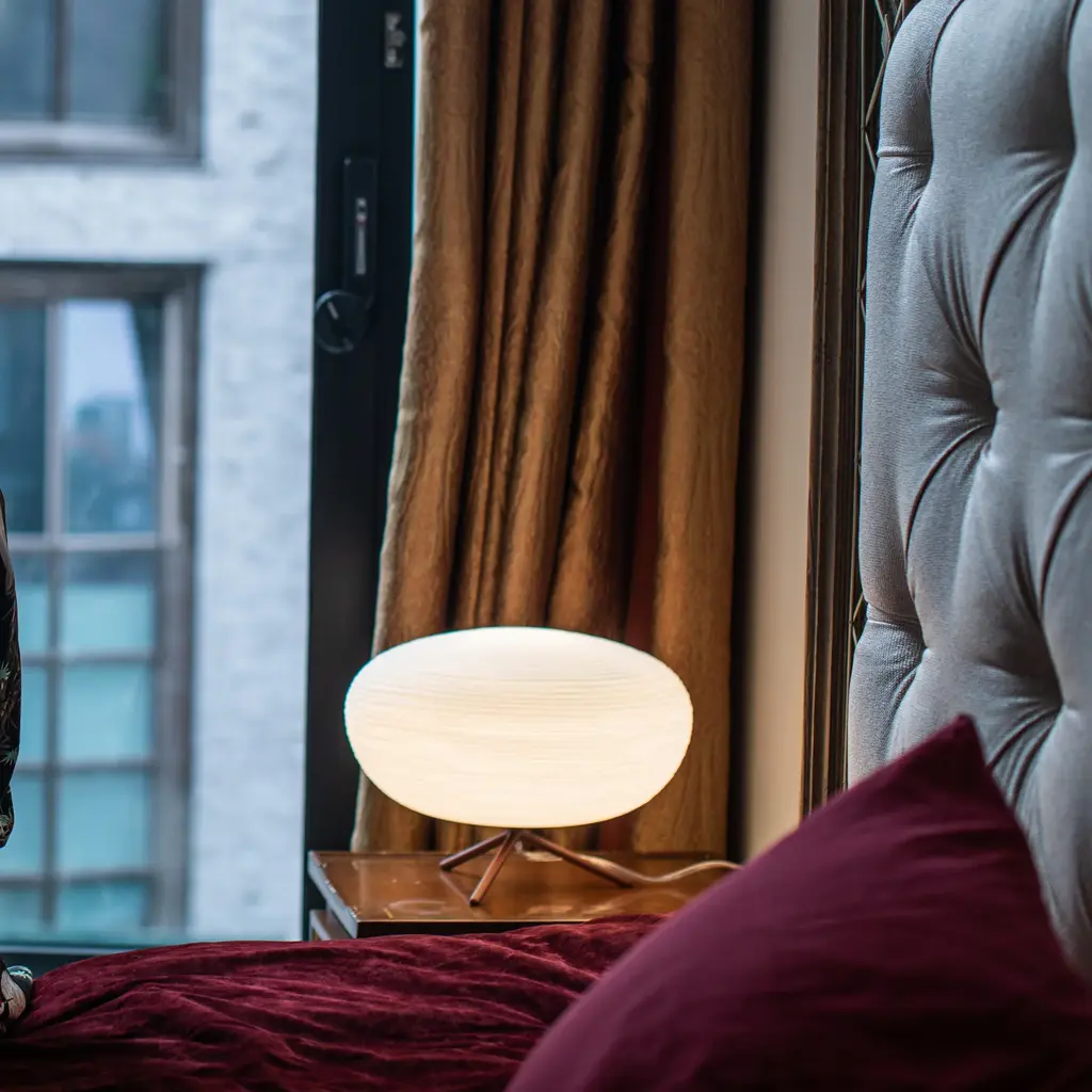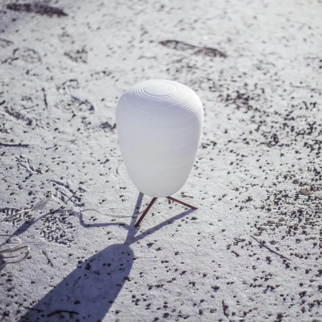 One, two, three lanterns that are lightweight yet brimming with seductive texture. Three different yet concurrently complementary shapes, balancing between the east and the west. A family of lamps that sheds its relaxing light in the most diverse settings, conveying the magic of rice paper or mulberry tree bark, the raw materials of traditional Japanese lanterns, in the precious physical appeal of blown and frosted glass. The horizontal lines which cut across the surface of the lamps give rise to a soft and charming décor and at the same time contribute to filtering the intensity of the light source, diffusing a full, warm and soft light into the room. The blown glass body – with its pleasantly plaster-like appearance – is suspended on a base consisting of three metal feet: a highly distinguishing trait, on which the lamp appears to be floating mid-air. They are perfect for use alone or in a harmonious composition of shapes; on a bedside table, a console and a table or even on the floor: for an area dedicated to relaxation or as meditation lamps, wisely lighting both the space we live in as well as our interior world. Features