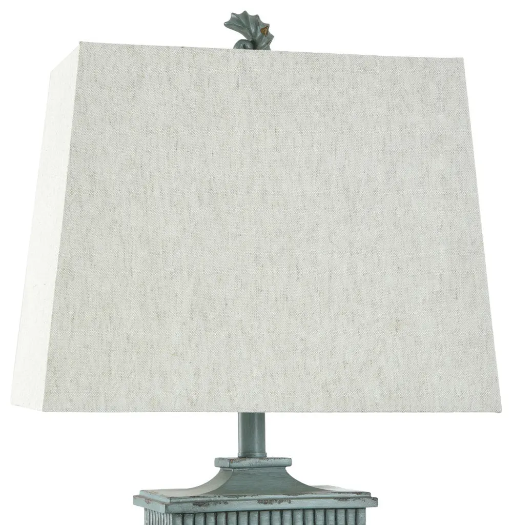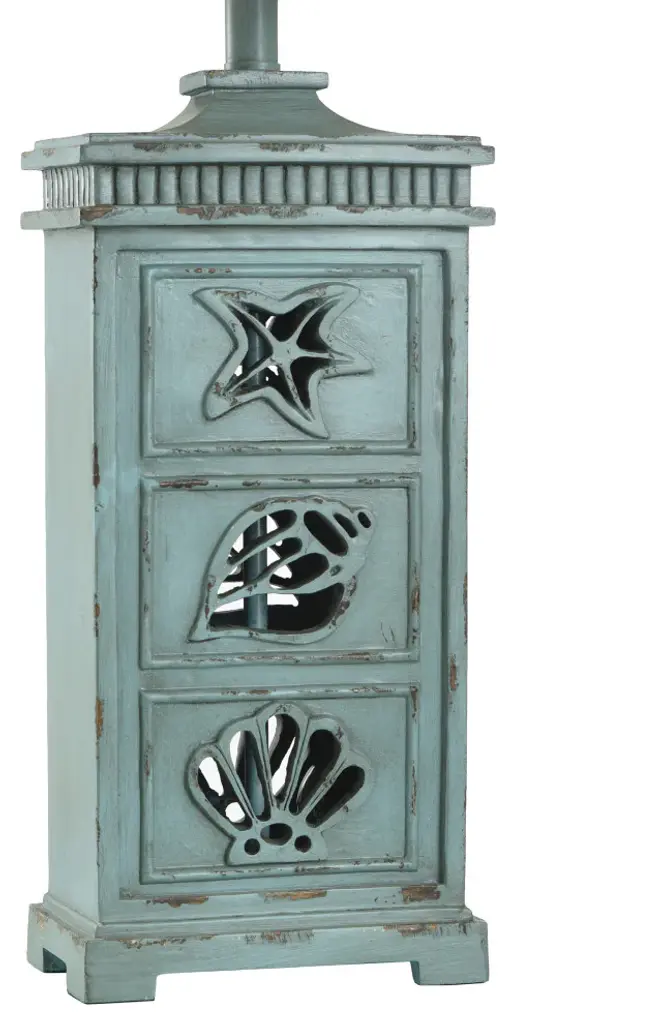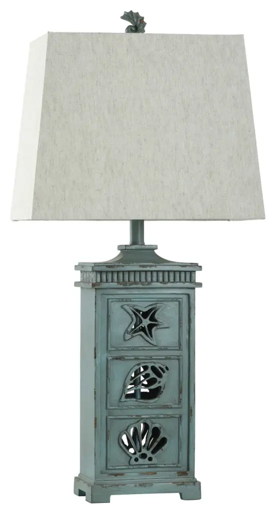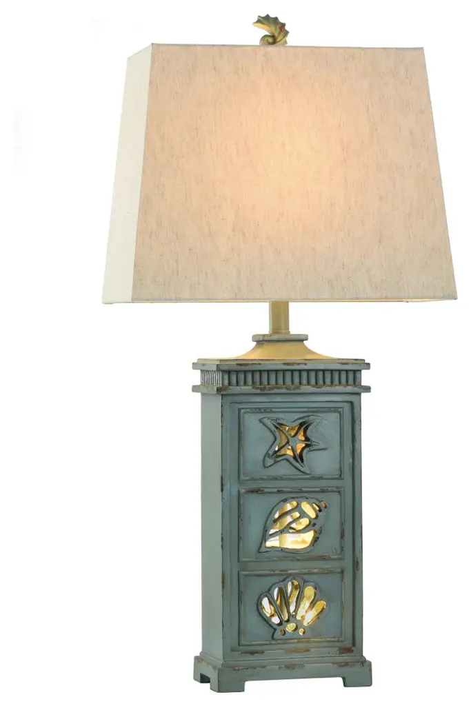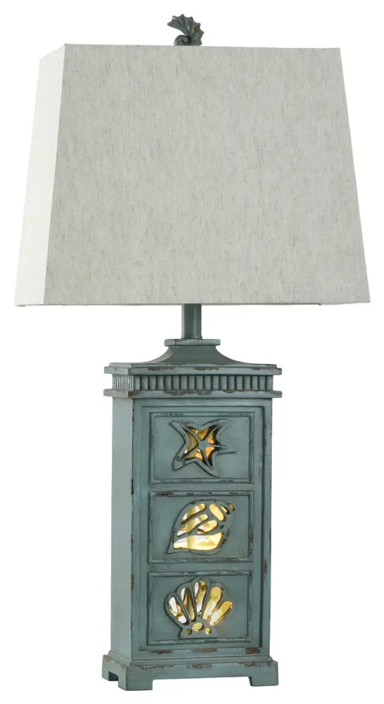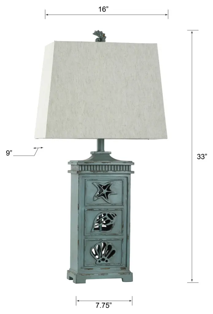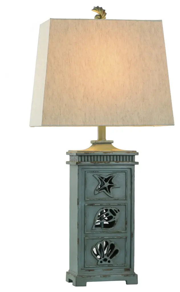 Showcasing coastal-inspired flair, the ceramic frame of this table lamp has cutout seashell designs and a distressed light blue finish. The matching blue finial atop the taupe fabric hardback shade is also in the shape of a seashell. Enhance nautical decor in a bedroom, office, hallway, dining room, or living room with this ocean-inspired lamp.Features: Finish: River CrestShade Finish: TaupeMaterial: Poly Shade Material: Hardback FabricLength: 9 inchesWidth: 16 inchesHeight: 33 inchesVoltage: 120VWattage: 100Safety Rating: Dry Location - This item is rated for dry locations, meaning it can be used in an indoor area that is not normally subject to dampness. May include a location subject to temporary dampness provided ventilation is adequate to prevent any accumulation of moisture such as the bathroomBulb(s) Included: NoBulb Type: IncandescentNumber of Bulbs: 1Due to lighting and monitor differences, actual colors and finishes may vary slightly from what appears online.