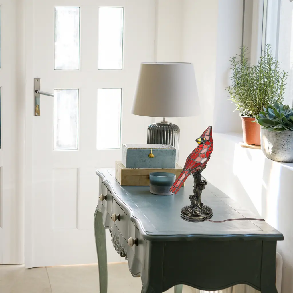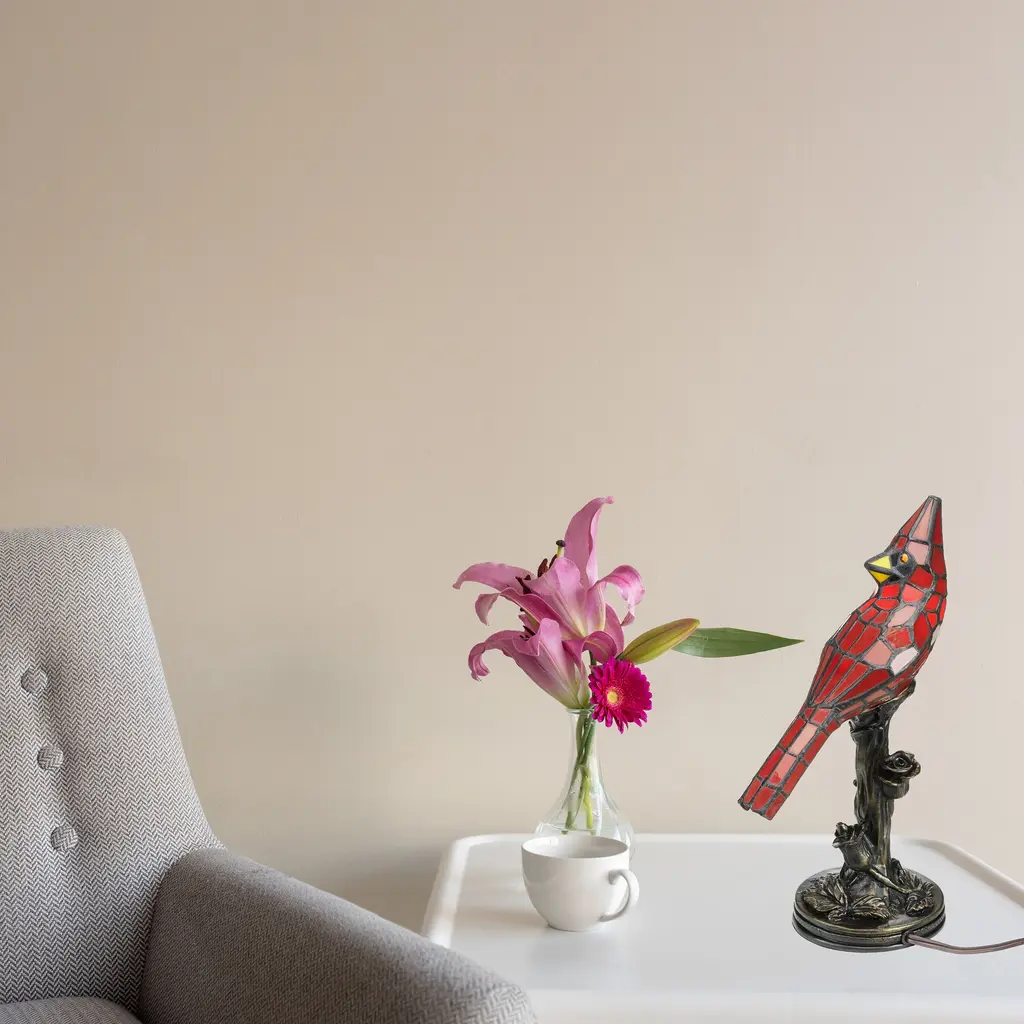 Illuminate your home with the charming design of this cardinal accent lamp from River of Goods. Handcrafted from 95 pieces of vibrant red cut stained glass, this lamp features a bronzed polyresin tree trunk base and 2 round orange cabochon eyes. Measuring 13.5 inches high, it is perfect on a side table, mantel, or bookshelf. This lamp makes a perfect gift for birdwatchers or cardinal fans! The low wattage bulb design provides gentle and unobtrusive lighting, and the inline on-off switch offers convenient operation.Features: