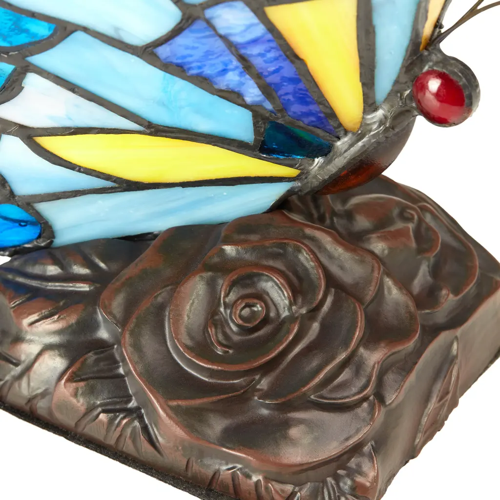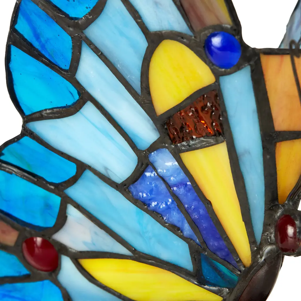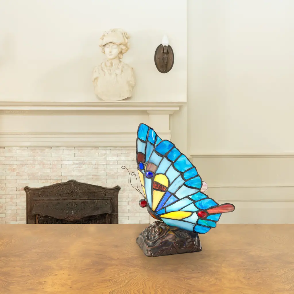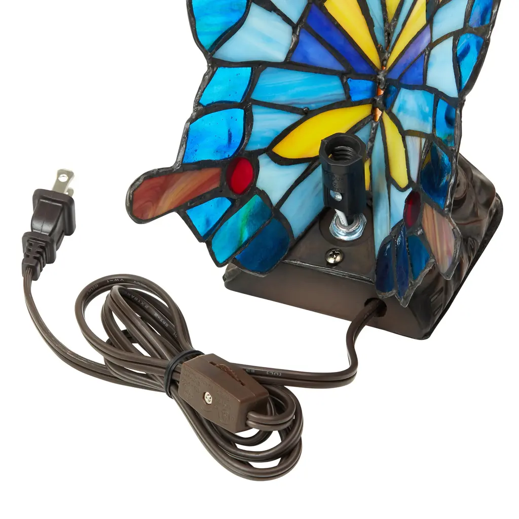 Let this little beauty "fly" into your home! At 9"H, this accent lamp is the perfect addition to any home decor. Composed of 68 glass pieces including 7 cabochons in vibrant colors of blue, white, yellow, and orange, this lamp will light up any room. Imagine sitting outside and seeing a colorful, friendly butterfly flutter by. Now you can bring the graceful beauty of this creature to your home.At 9"H, this beauty will feel right at home on a table or shelf in the living room, dining room, kitchen or bedroom. A perfect nightlight to softly light a hallway or near a door. Also makes a great gift!Handcrafted from 68 pieces of cut glass in rich, vibrant blue, yellow, and mahogany and red hues. Seven round cabochons brilliantly sparkle and shine in the light. A detailed, floral design resin base completes the look.Handcut glass pieces are soldered together using the copper foil method, made famous by Louis Comfort Tiffany in the early 1900s.Features inline switch and cord length of 66".Requires one 25W bulb (not included).