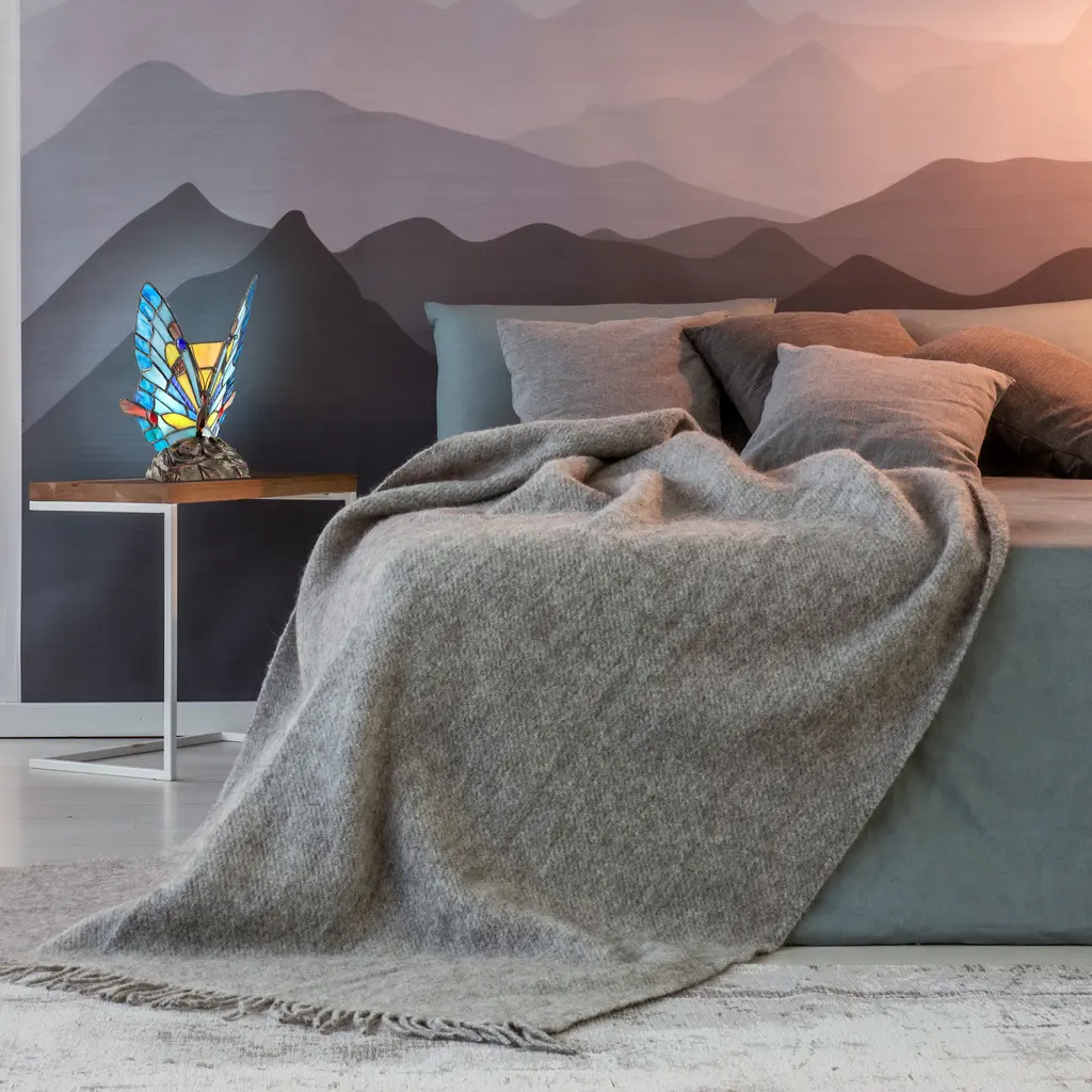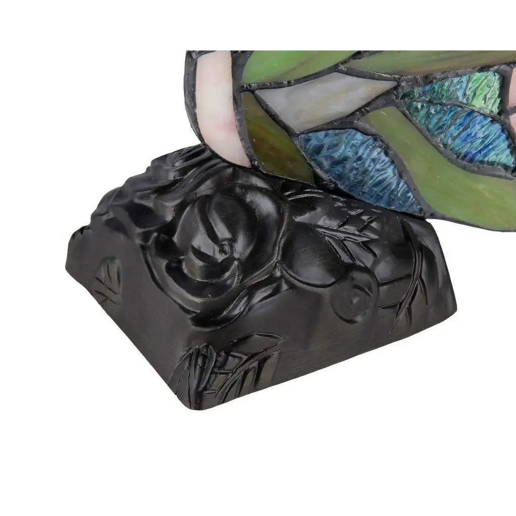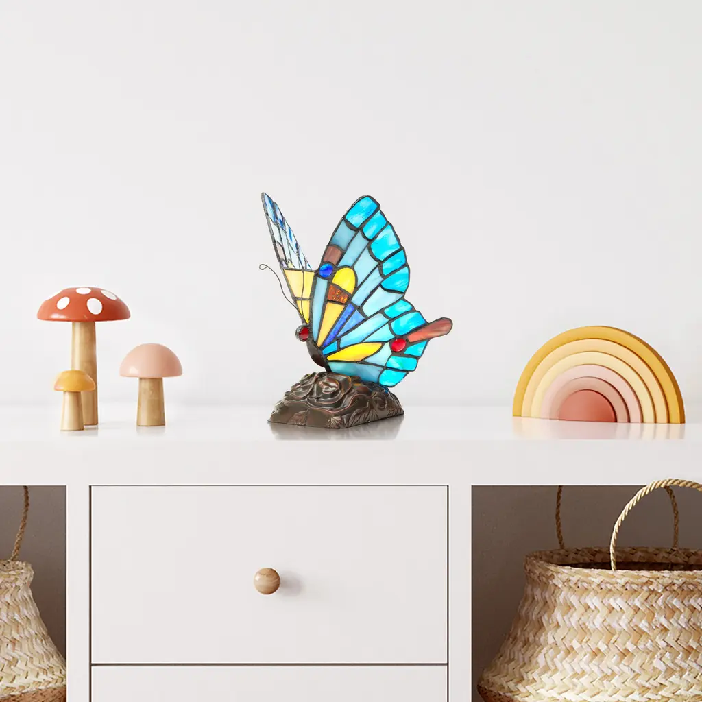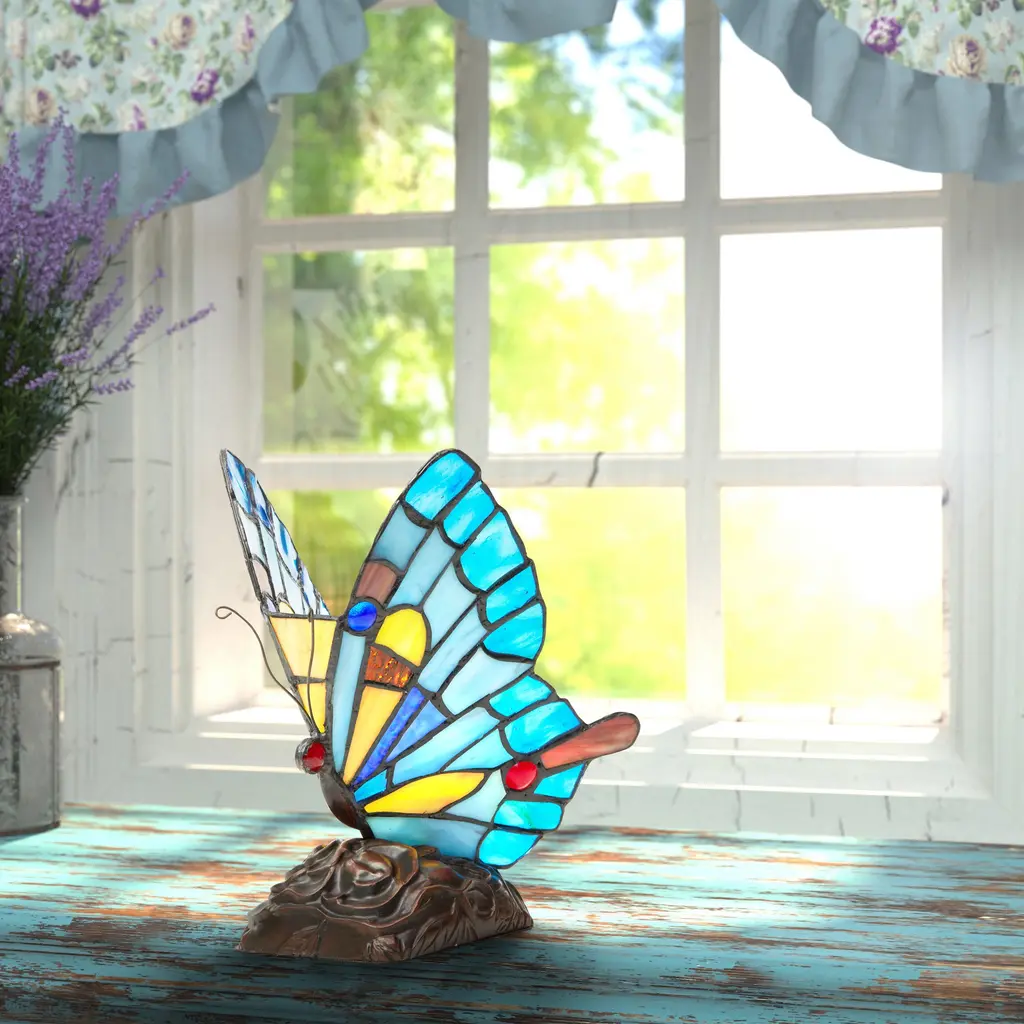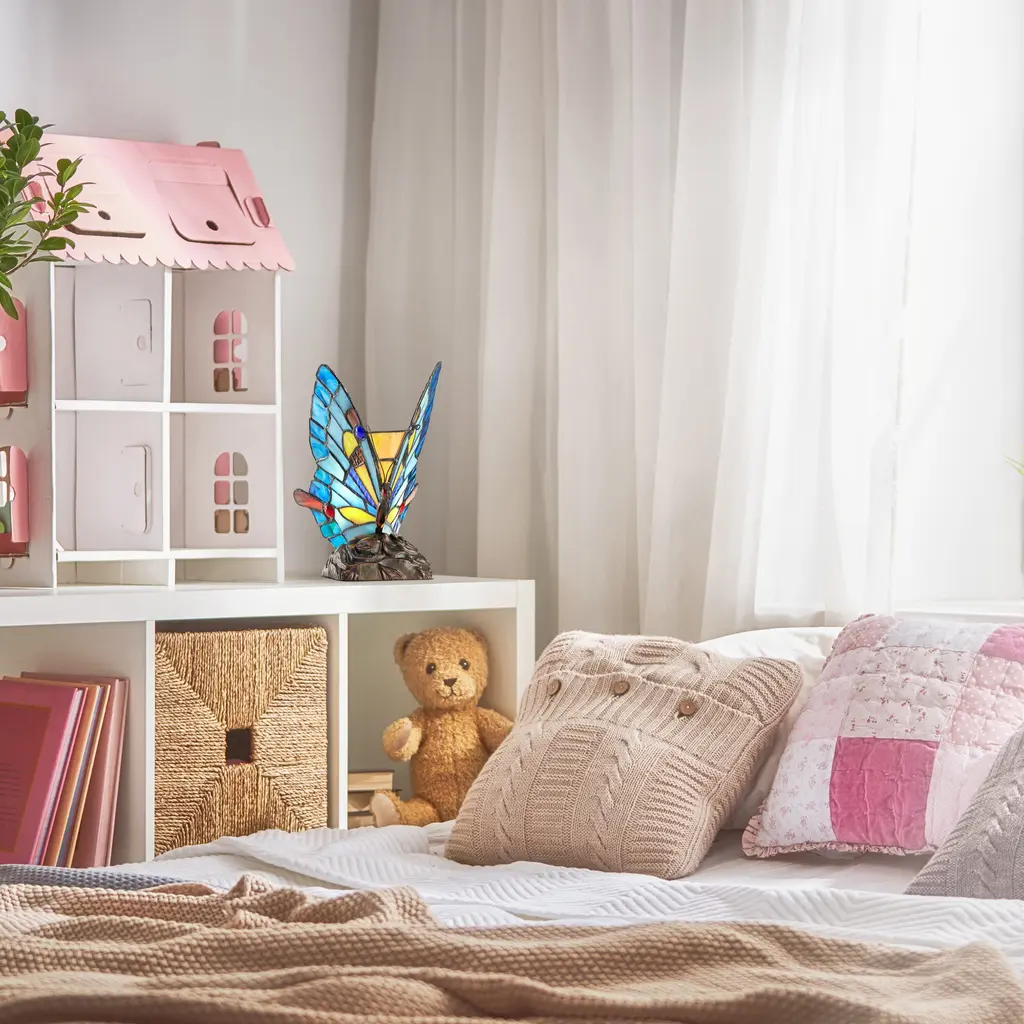 Let this little beauty "fly" into your home! At 9"H, this accent lamp is the perfect addition to any home decor. Composed of 68 glass pieces including 7 cabochons in vibrant colors of blue, white, yellow, and orange, this lamp will light up any room. Imagine sitting outside and seeing a colorful, friendly butterfly flutter by. Now you can bring the graceful beauty of this creature to your home.At 9"H, this beauty will feel right at home on a table or shelf in the living room, dining room, kitchen or bedroom. A perfect nightlight to softly light a hallway or near a door. Also makes a great gift!Handcrafted from 68 pieces of cut glass in rich, vibrant blue, yellow, and mahogany and red hues. Seven round cabochons brilliantly sparkle and shine in the light. A detailed, floral design resin base completes the look.Handcut glass pieces are soldered together using the copper foil method, made famous by Louis Comfort Tiffany in the early 1900s.Features inline switch and cord length of 66".Requires one 25W bulb (not included).