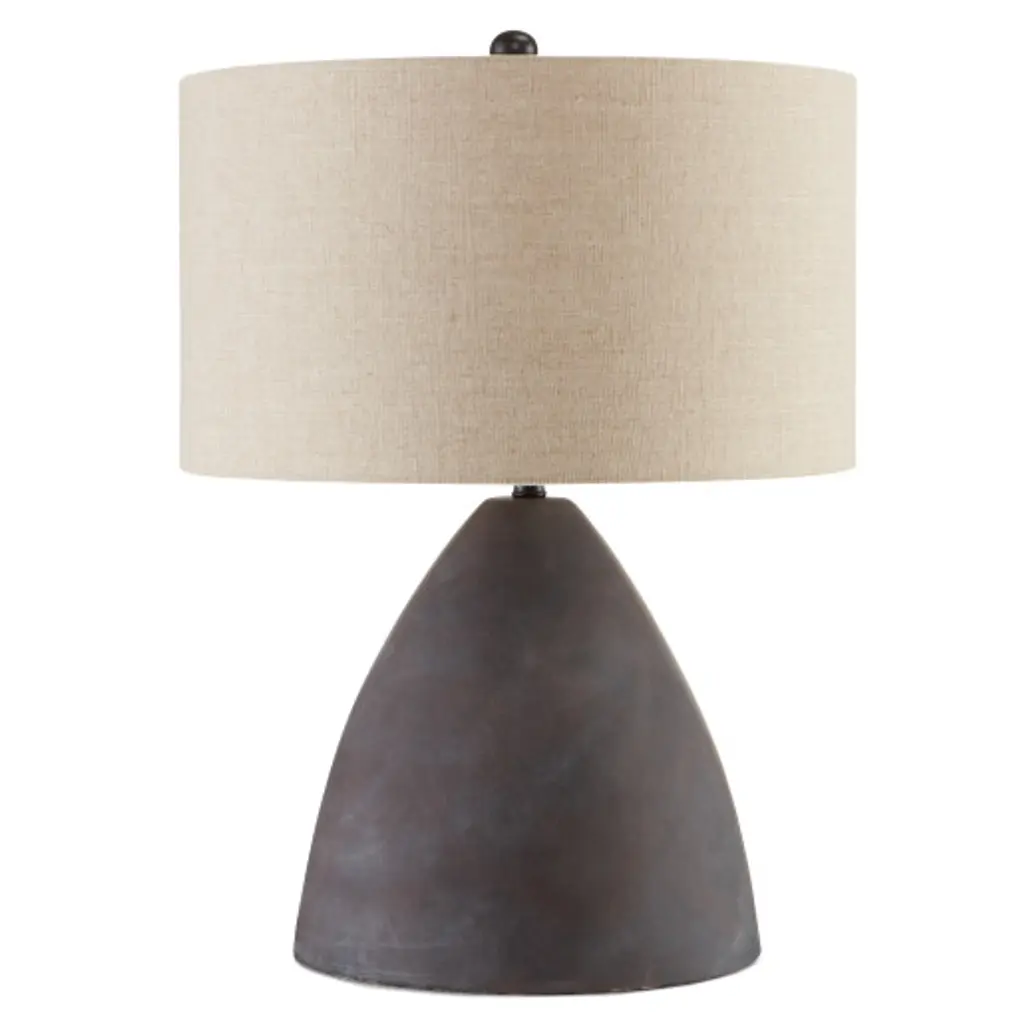 A sloping form in rustic black brings a dramatic edge to the Roan lamp. The terracotta base offers an earthy, elemental quality set for impact in any modern design. Topped with a coarse linen shade, this sculptural table lamp can blend seamlessly into your decor.