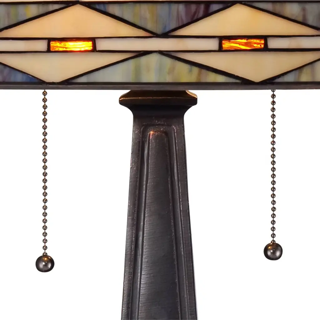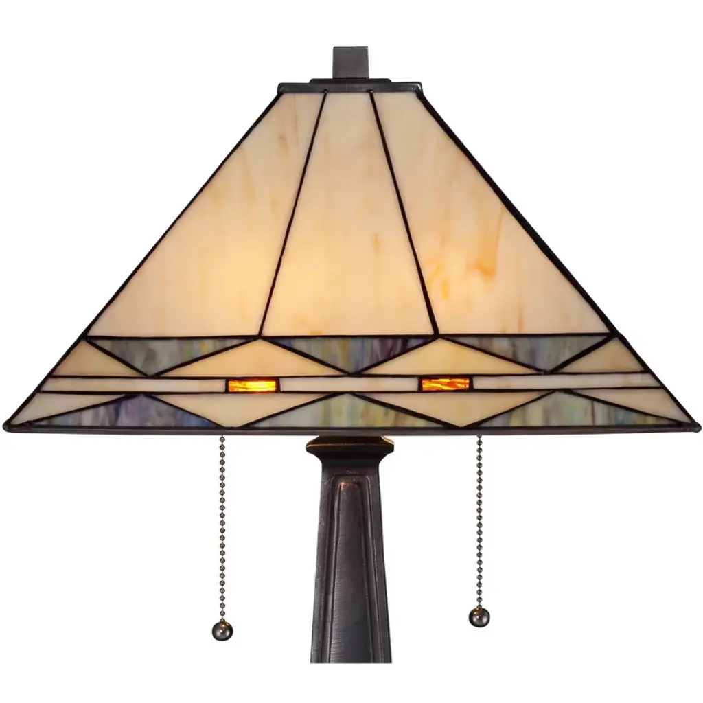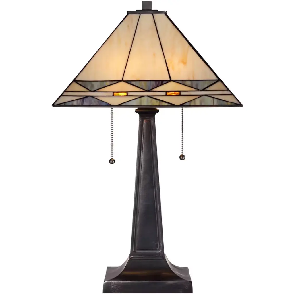 The spectacular Tiffany-style table lamp offers a bright and beautiful room accent for your home. From the Rober Louis Tiffany brand, it features a handcrafted lamp shade that uses over 80 pieces of hand-cut stained glass. The glass is assembled using the traditional copper foil technique, and creates a warm and welcoming glow in any setting. Mission, Craftsman-style base is in a bronze finish. Pull-chain table lamp design makes it easy to control the light output.