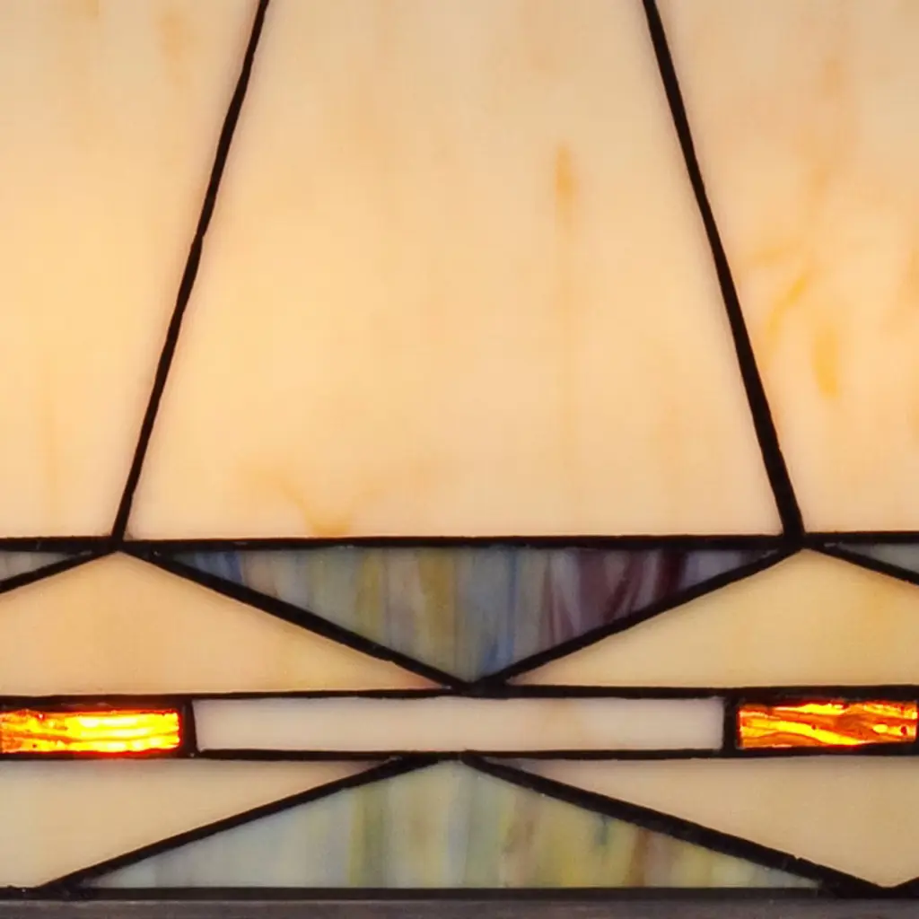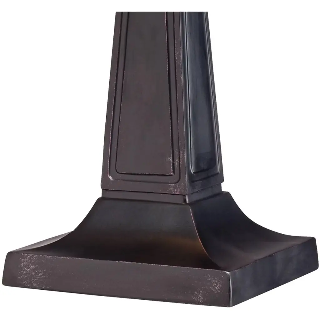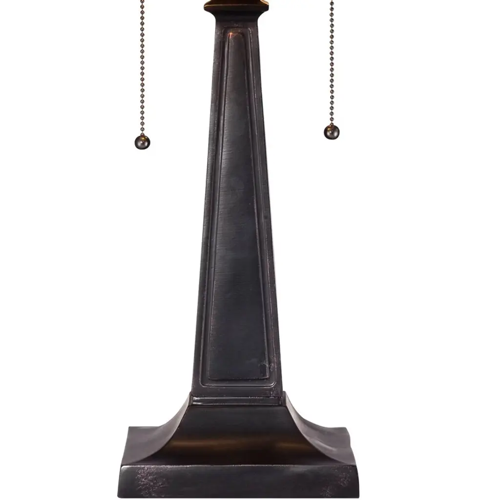 The spectacular Tiffany-style table lamp offers a bright and beautiful room accent for your home. From the Rober Louis Tiffany brand, it features a handcrafted lamp shade that uses over 80 pieces of hand-cut stained glass. The glass is assembled using the traditional copper foil technique, and creates a warm and welcoming glow in any setting. Mission, Craftsman-style base is in a bronze finish. Pull-chain table lamp design makes it easy to control the light output.