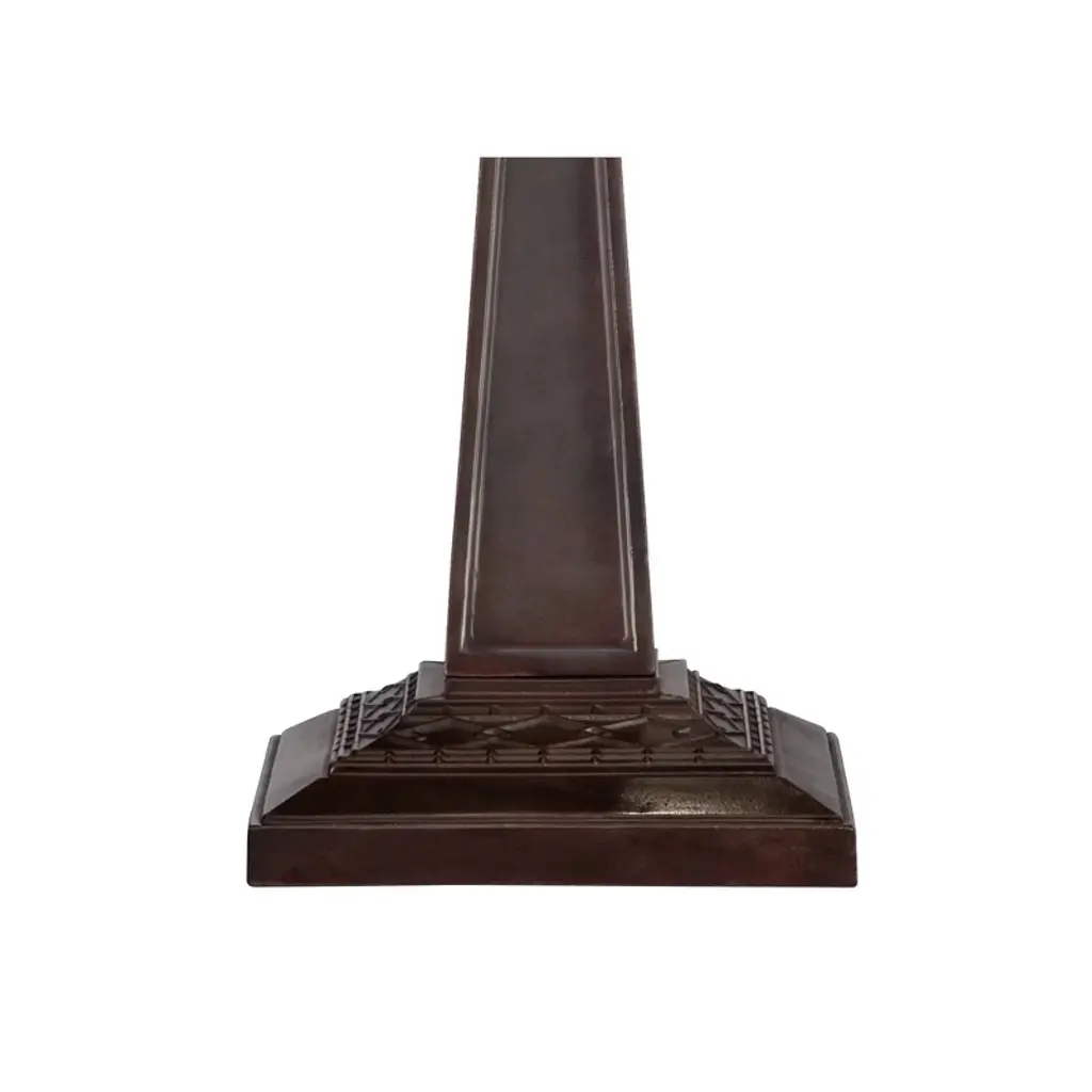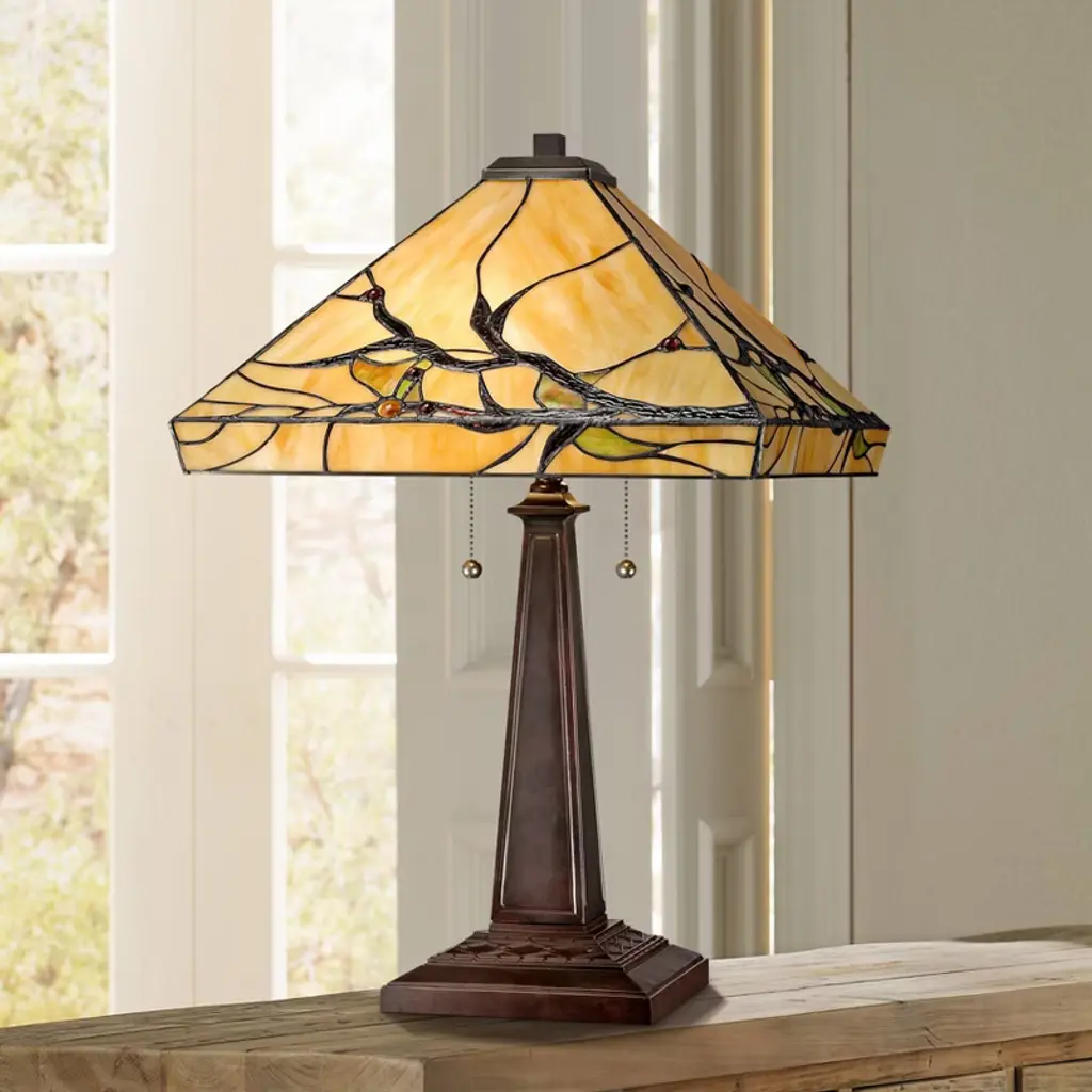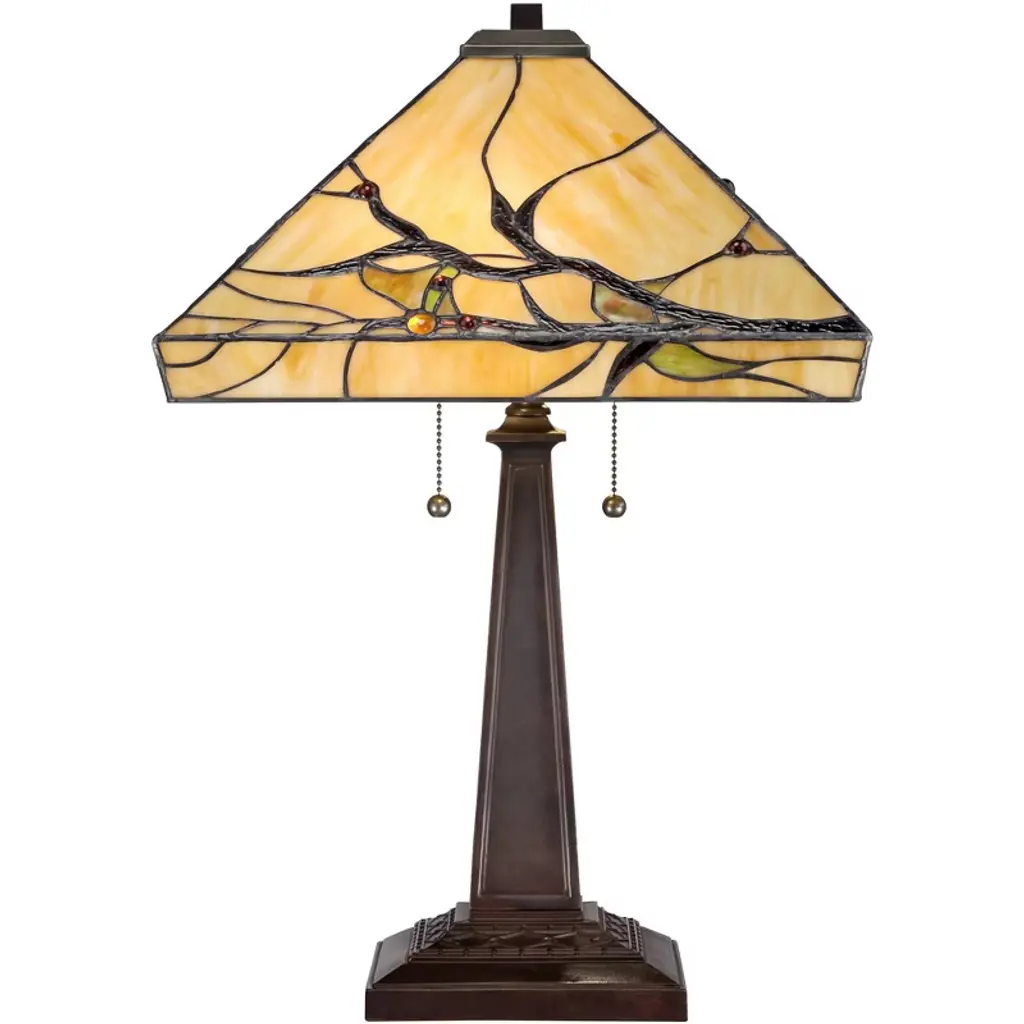 Add a Mission style accessory to your home decor with this beautiful Tiffany style table or desk lamp. Tapered metal base features warm bronze finish while the tapered square shade is awash in colorful art glass. Twin pulls operate each bulb separately. From our assortment of best-selling Tiffany-style lamps!