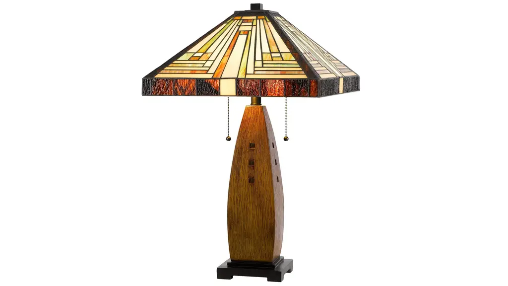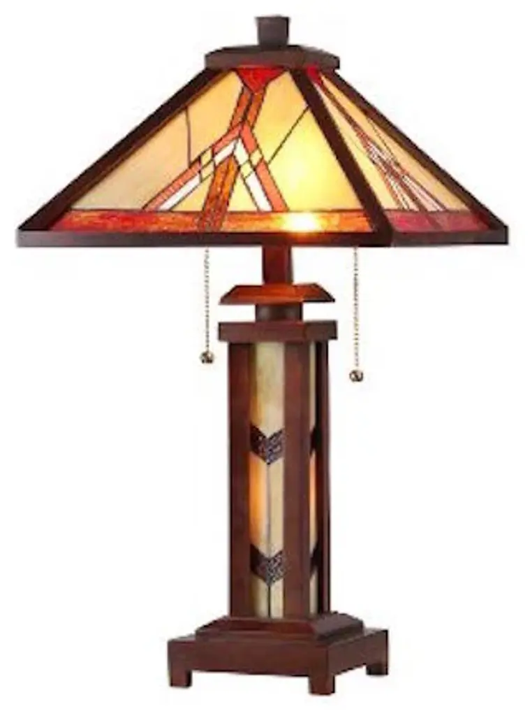 Decorate your home with this Tiffany-style table lamp for a timeless look. Has a wood base with a faux leather palace shade. 4-position switch. Tiffany-style art glass. This lamp set comes with a tabletop dimmer, one for each lamp, which allows you to control the level of lighting. Simply insert the lamp plug into the dimmer outlet, and then slide the switch on the control to dim or brighten the lighting.