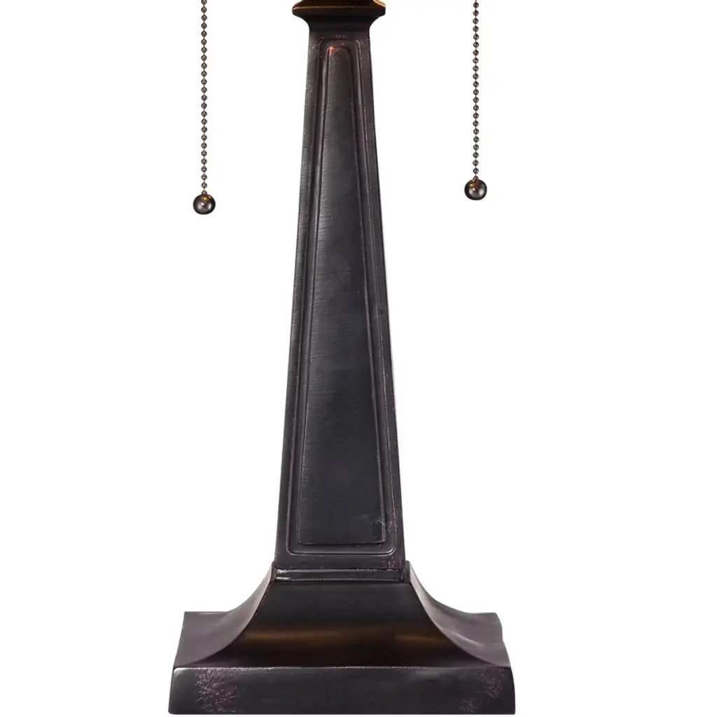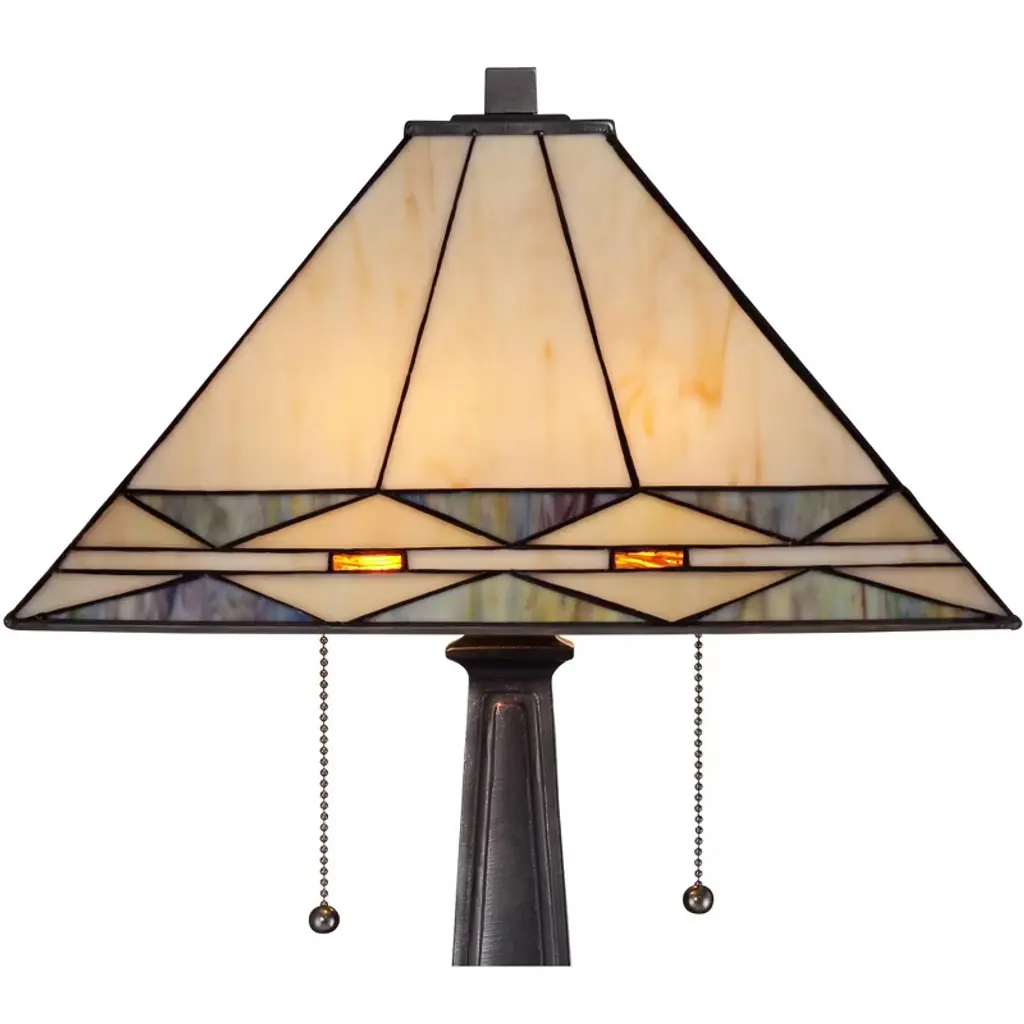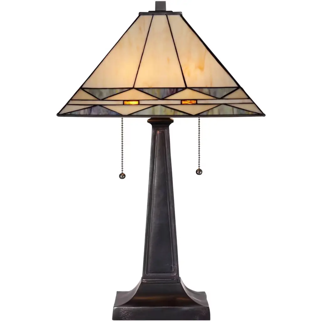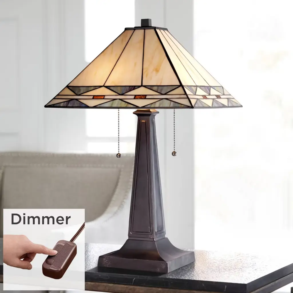The spectacular bronze table lamp has a handsome tapered base. A stunning square art glass shade in cream, gray and amber tops the look. A beautiful twin-light design for traditional home decor. This lamp set comes with a tabletop dimmer, one for each lamp, which allows you to control the level of lighting. Simply insert the lamp plug into the dimmer outlet, and then slide the switch on the control to dim or brighten the lighting.