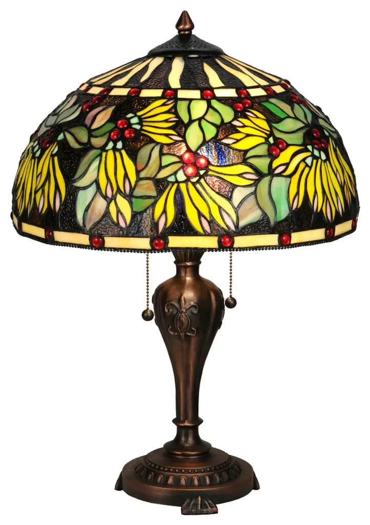 From our best-selling collection of Tiffany-style lamps comes this dramatic table lamp featuring colorful woodland birds, perched atop the trees, on an art glass shade. Its rounded shade has a scalloped bottom edge, below which hang the pull chains for this lamp's two lights. A beautifully detailed base in bronze finish adds a classic Tiffany-style touch to this delightful design from Robert Louis Tiffany.