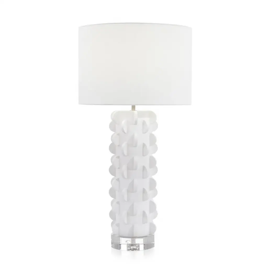 The Robertson Table Lamp from Arteriors turns a basic column profile into something extraordinary through individually sculpted and hand-attached loops. Its ivory crackle finish highlights the handcrafted details while providing neutral versatility. The tall drum shade, with its distinctive flat-band trim solely at the bottom, creates an asymmetrical design detail that draws the eye. This lamp demonstrates how thoughtful modifications to classic forms can create fresh, engaging designs that remain timeless rather than trendy.