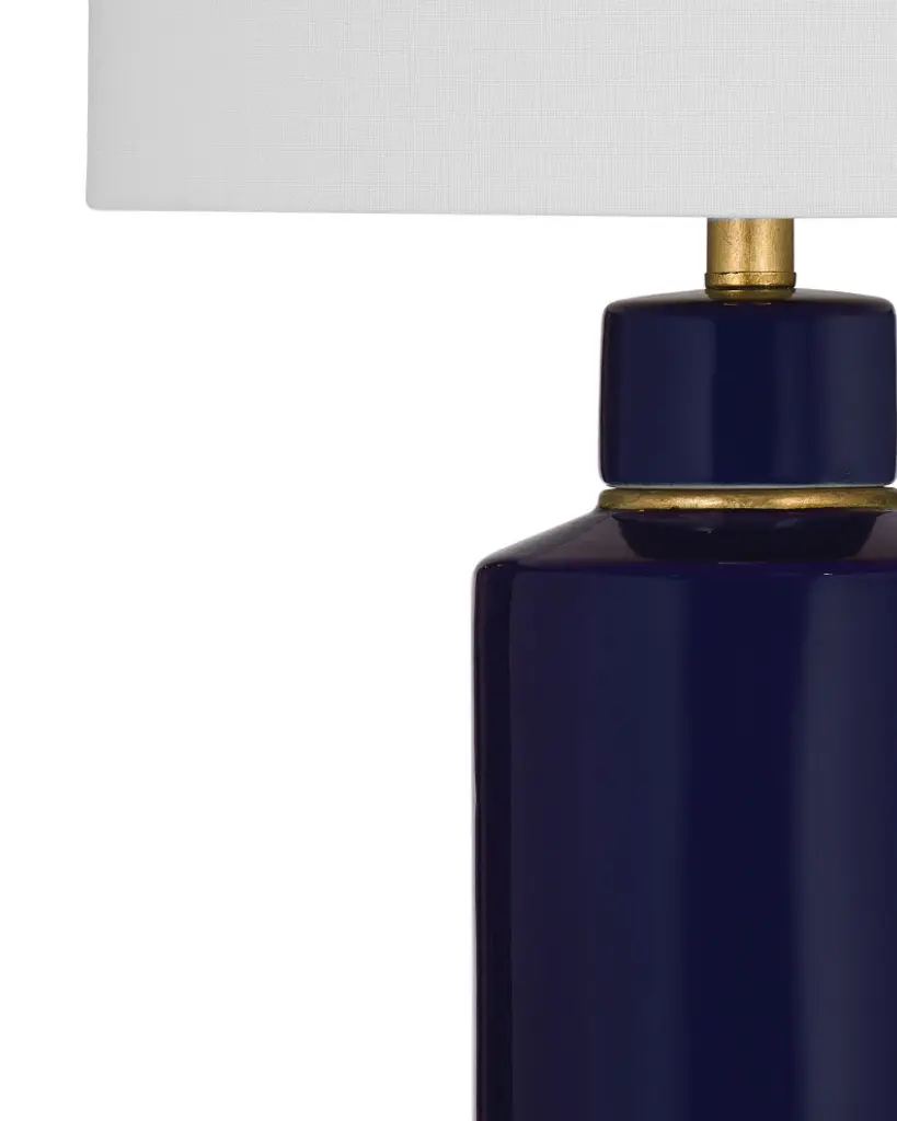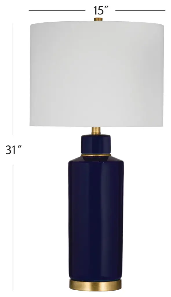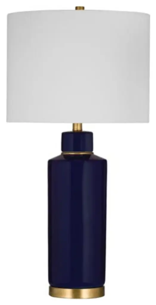 Transform your space with the Robynn Table Lamp, a timeless piece that combines elegance and functionality. The navy blue cylindrical ceramic lamp body, complemented by brass accents around the neck and base, adds a touch of sophistication to your decor. The drum-shaped lamp shade, crafted from white linen, creates a soft and inviting ambiance. Illuminate your surroundings with the convenient 3-way turn knob light switch, and with a generous 6-inch lamp cord, you have the flexibility to place it wherever you desire. Elevate your home with this chic and versatile lighting solution that effortlessly enhances your living space.Features:The navy blue ceramic lamp has a contemporary styleThe drum shaped lamp shade is constructed with white linenFeatures a 3 way turn knob light switchLamp cord measures 6 inches, allowing for easy placementBulb type a required, not includedEasy assembly - just attach harp, finial and shadeFor over a century, Bassett Mirror has been synonymous with style and quality, transforming homes with its sophisticated and timeless designs. With a wide-ranging collection of furniture, lighting, mirrors, and art, Bassett Mirror seamlessly blends modern style with classic appeal. From rustic modern to luxe glam, each piece is thoughtfully crafted to inspire and elevate any space. Committed to exceptional value and customer care, Bassett Mirror makes it easy for homeowners to create beautiful, personalized interiors with confidence.