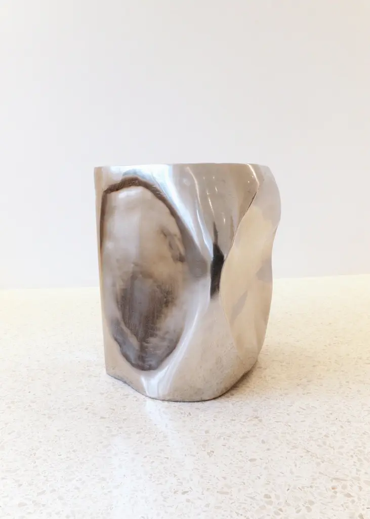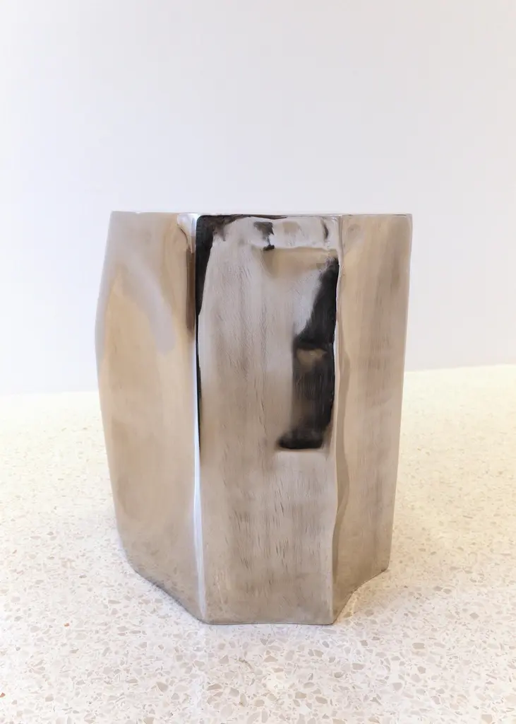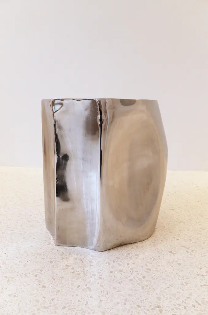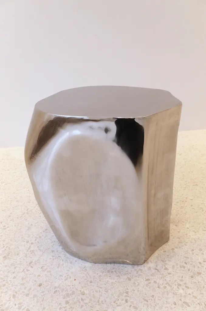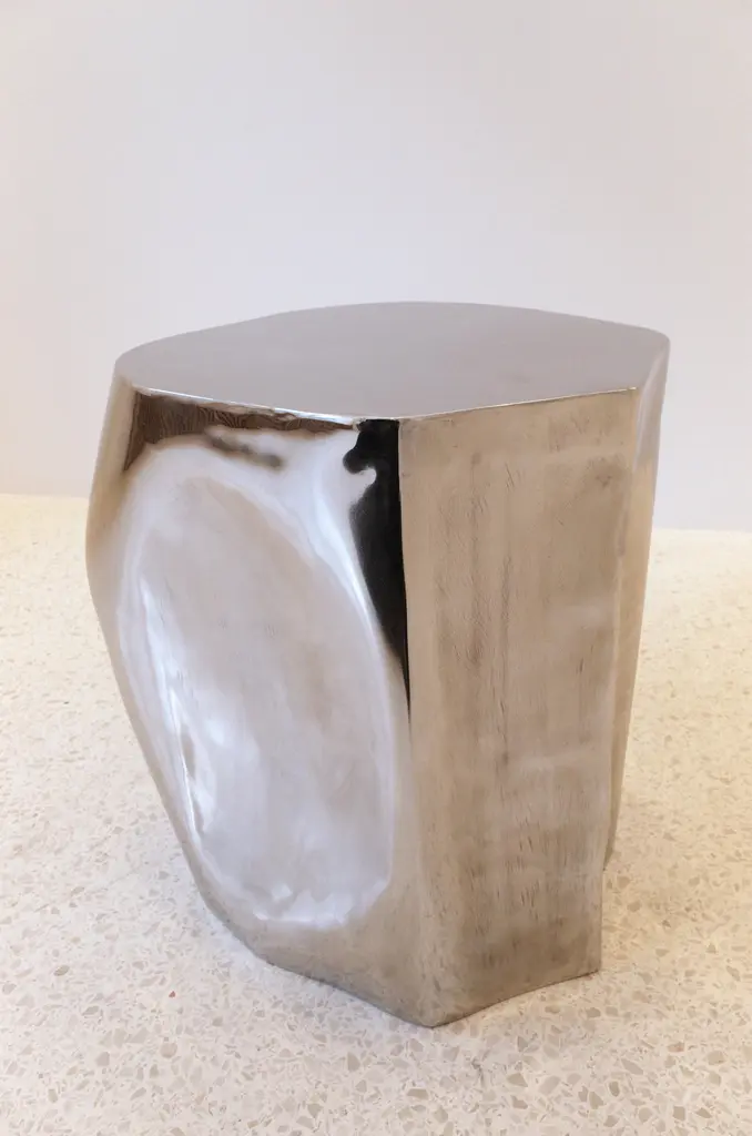 Rocher Small Side Decorative Table In Inox Stainless Steel by Atelier ElleryLimited Edition Of 8 Pieces.Dimensions: D 38 x W 40 x H 45 cm.Materials: Inox stainless steel.Available in different finishes and material options. Prices may vary. Please contact us.The ‘Rocher Table’ seamlessly blends minimalist design with organic inspiration. Its monochromatic palette and unique silhouette evoke understated elegance.Bearing subtle impressions, it prompts reflection on the interplay between natural phenomena and human intervention. Resembling a celestial object's journey, its form suggests impact and transformation. As if sculpted by cosmic collisions, the table's surface bears the traces of its journey, marked by subtle indentations that narrate its story.Crafted in Paris from polished inox, the ‘Rocher Table’ measures 40 x 45 x 38 cm and symbolizes a harmonious balance. Its form hypothetically fills and completes the base of its sibling, the Moulin Lamp by Kym Ellery.Its final form captivates, like a piece of rare fruit carved from around its core; this piece transcends conventional furniture design and becomes more akin to sculpture.Atelier ElleryMy practice is rooted in architectural form, material tension, and the relationship between object and body. I work primarily with metals—materials that carry weight, memory, and permanence—shaped into sculptural pieces that invite both physical and visual interaction. These objects often explore gravitational dynamics, considering how weight, balance, and form affect the way the body approaches, responds to, or is held by a structure.These forms often explore boundaries: between intimacy and distance, stillness and movement, structure and softness. Many of my works can be touched, sat in, or moved; kinetic elements are introduced to create a sense of calm, presence, and responsiveness. A movement might echo the body’s gesture or rhythm, subtly shifting how one relates to space.I’m interested in how sculpture can function as a site; something to enter into, rest within, or observe quietly. By folding materials around imagined or real bodies, I seek to create objects that hold a charge: sculptural presences that feel at once solid and open, architectural and emotional.Each piece is a study in form, but also feeling; how a curve invites approach, how a divide becomes a threshold, how metal, when worked by hand, retains the trace of care.