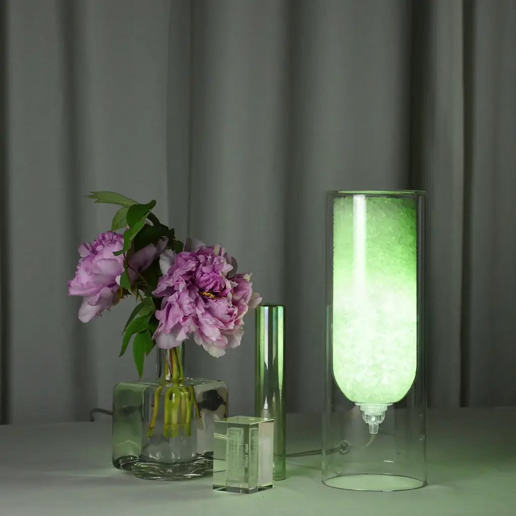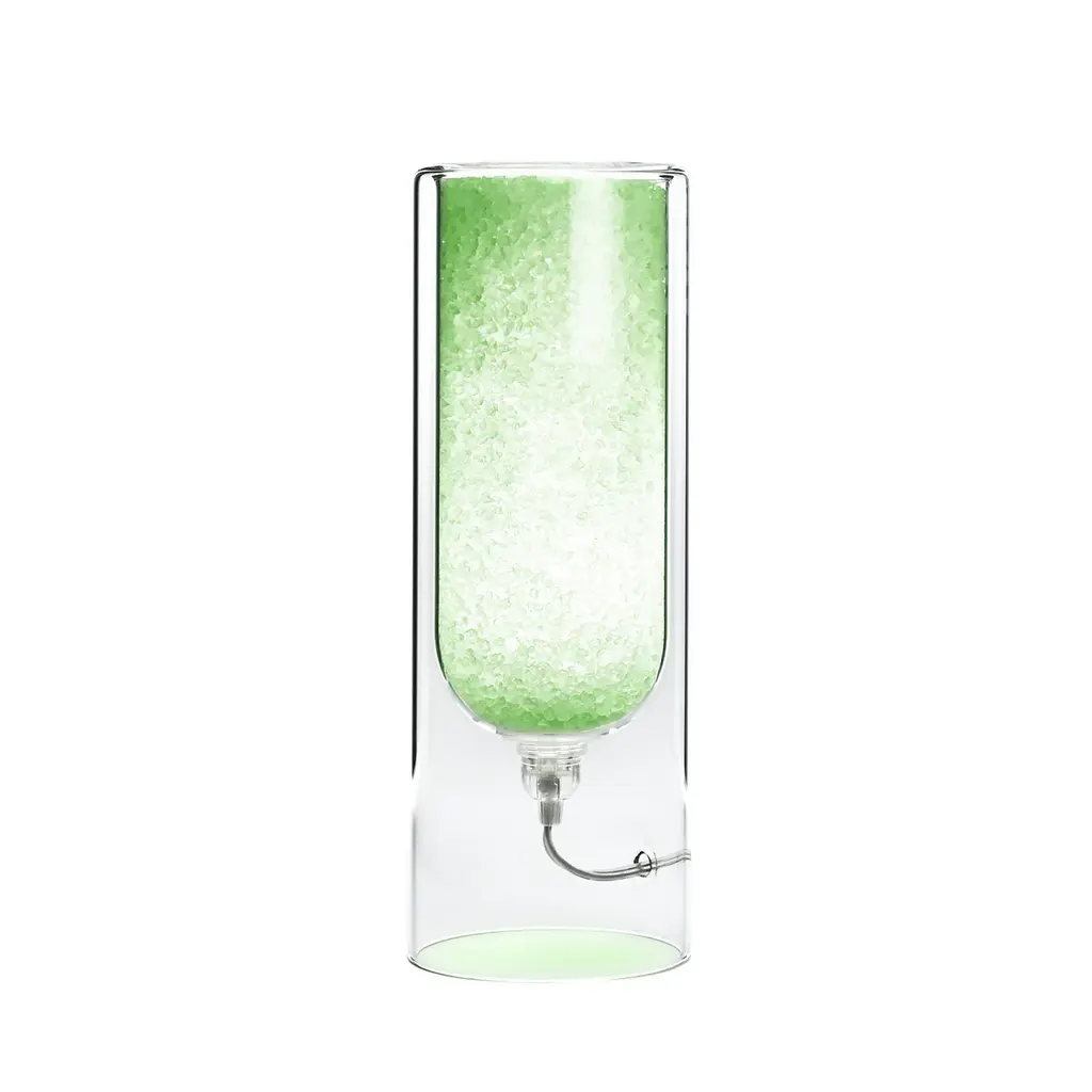 This extra-small version of the limited series Rocklùmi clear glass table lamps (where rock hints at the rock salt and "lumi" is the Italian referring to non-electrical lights) exploits pure rock salt crystals housed in its cylindrical body to turn into a humidity regulator. The included, low-consumption LED light (4W A++) lights up the crystals accenting their light-green hue obtained with vegetable pigments. Suitable also as a fragrance diffuser by adding essential oils' drops onto the top, this design features a fully-recyclable frame held together by an interlocking system. Other colors are available.