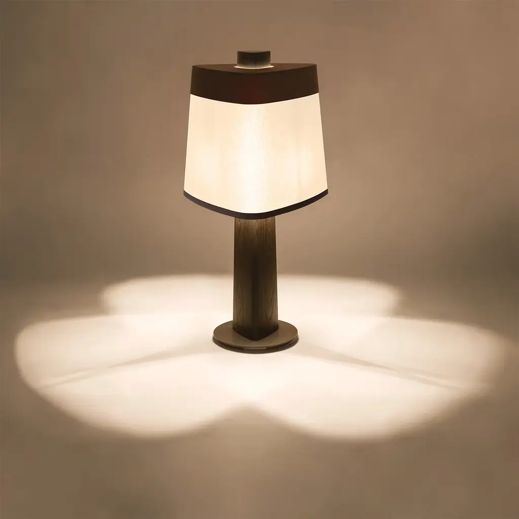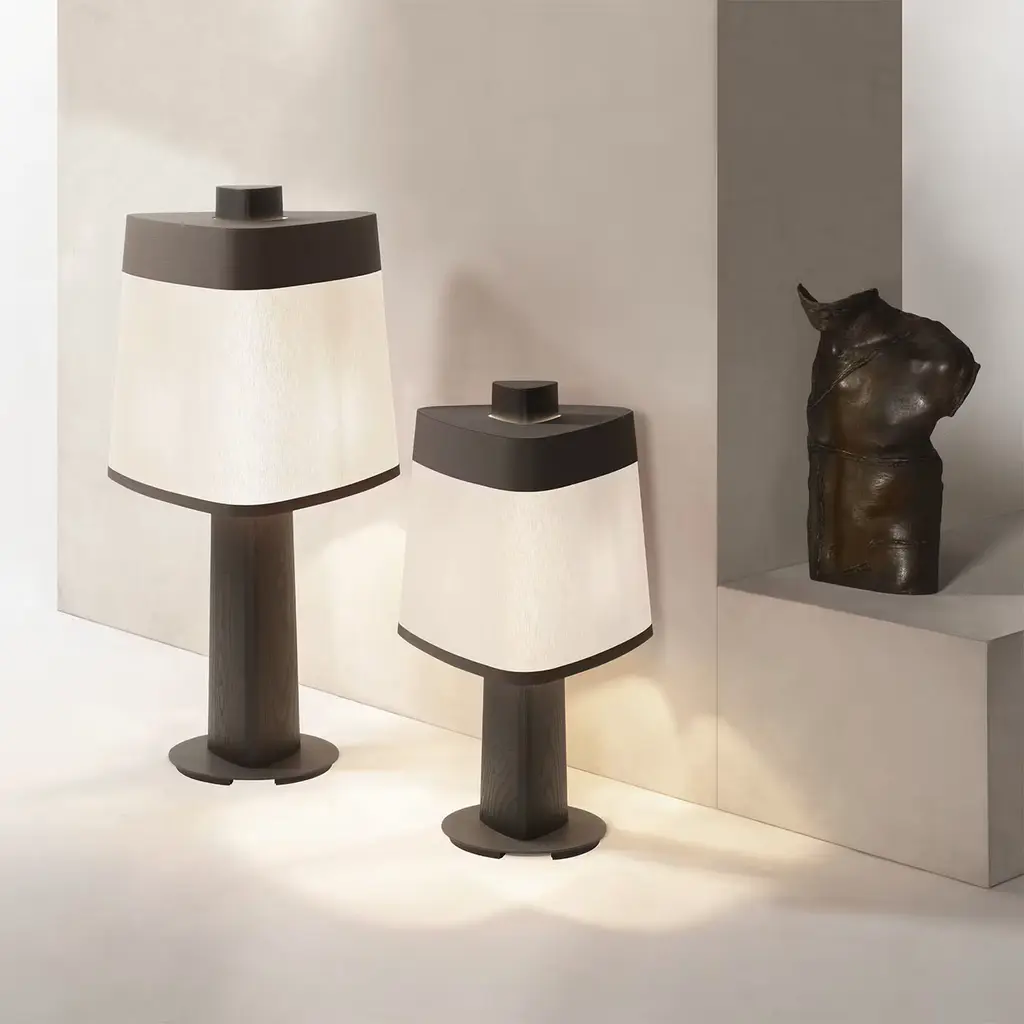 Clean lines and natural color combinations describe this timeless table lamp, ideally combined with the smallest version of the same design for an iconic accent of sophistication. Handmade of wood, available in dark-stained Canaletto walnut or wedge, the stem rests on a burnished bronze base and is topped with a fine white cotton lampshade, enhanced with brown details. Available in 110 or 220 V, it is customizable in size upon request.