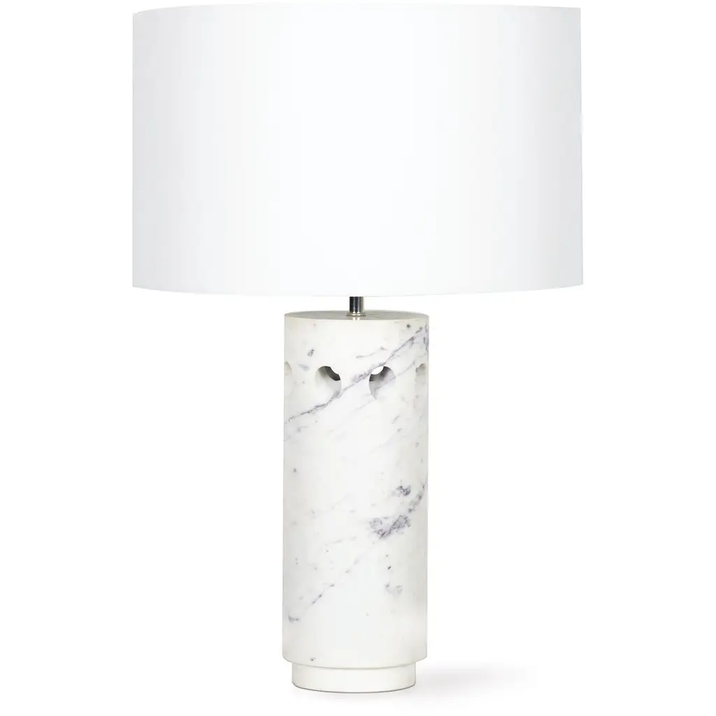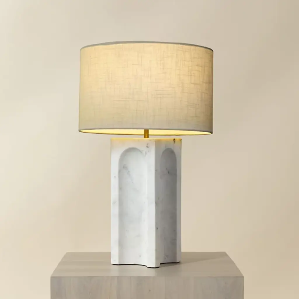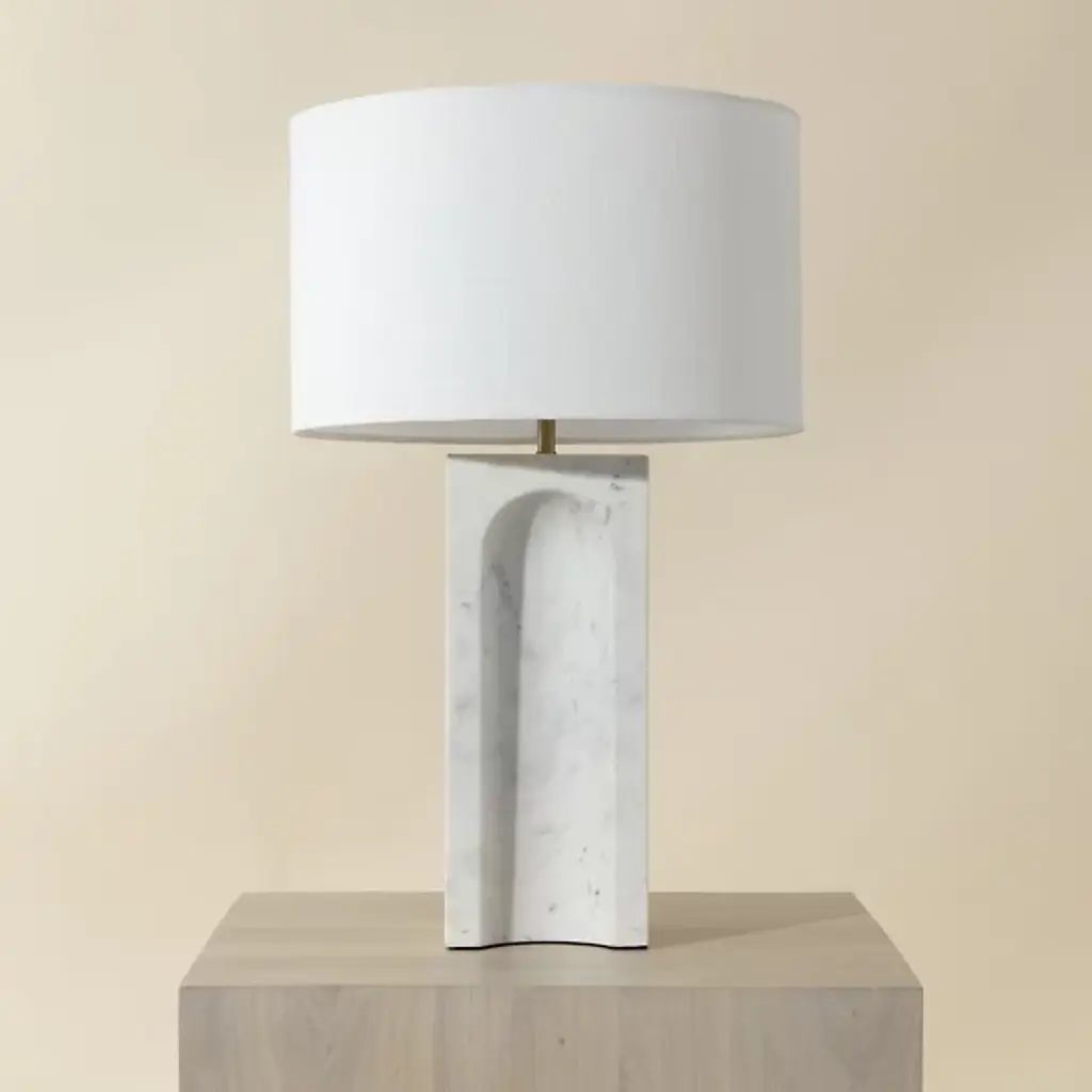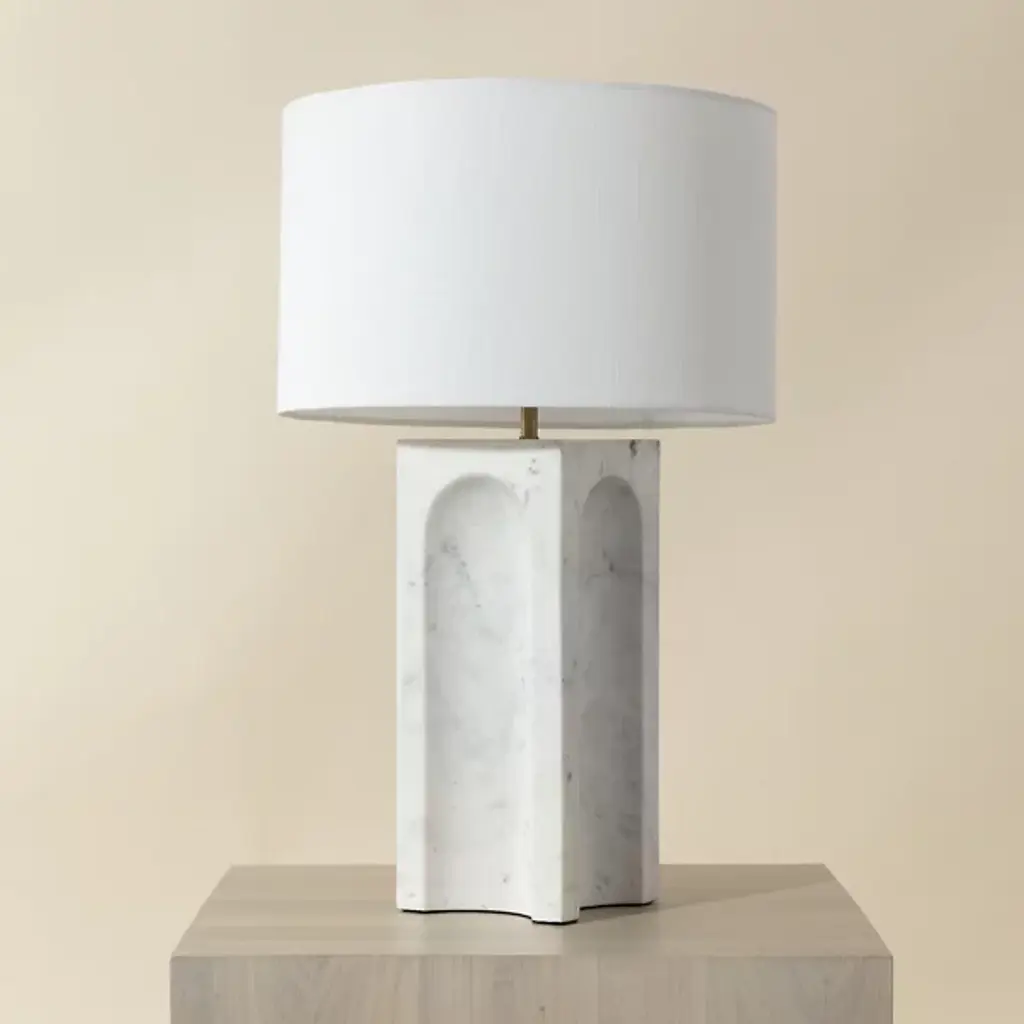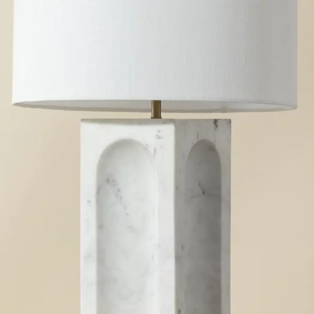 The Rohe Table Lamp from Sunpan, crafted from solid white Banswara marble, features a timeless elegance that enhances any decor. The lamp features meticulously hand-carved arched grooves across its rectangular base, creating a sophisticated geometric profile. This intricate detailing adds depth and interest to the design, making the lamp captivating from every angle. Its classic and refined appearance ensures it stands out as a statement piece in any room, combining artistry with functionality.