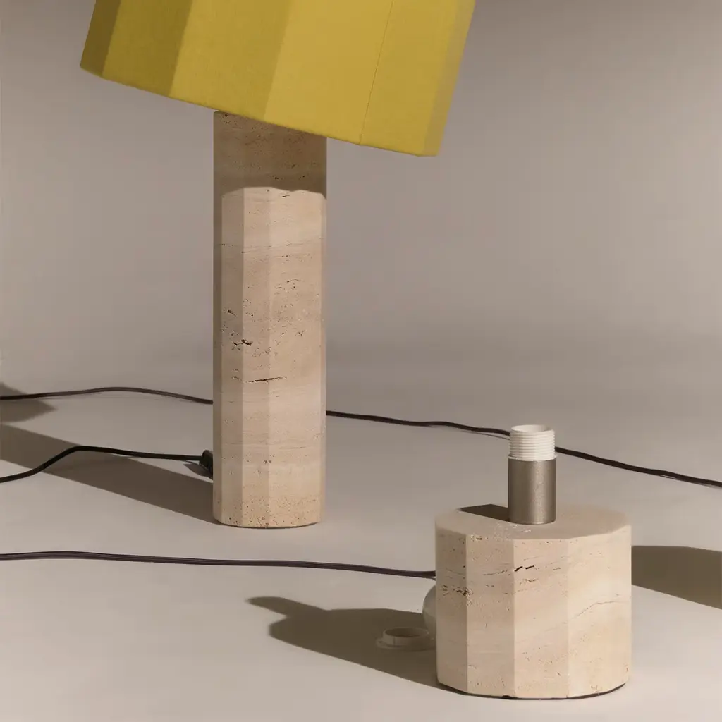 Characterized by a striking twelve-sided profile, this stunning table lamp will make for a lively and refined accent for contemporary interiors. Part of the Roma Dodecagon series of lighting fixtures, it is handcrafted of white Travertine, enriched with nickel-plated brass detailing, and crowned with a yellow linen shade, sewn by hand and available in warm white, blue, or brick red hues. Also offered in a red Travertine version, this lamp supports an E27 LED bulb.