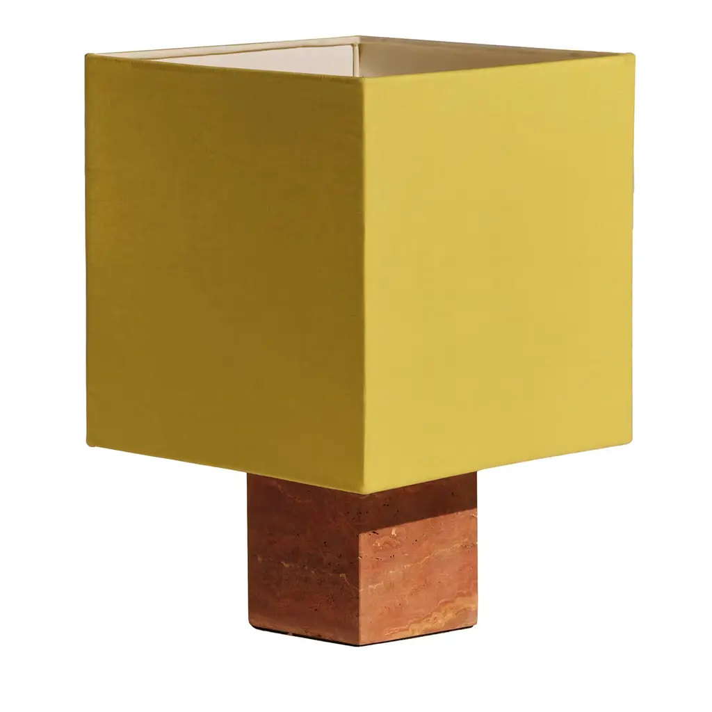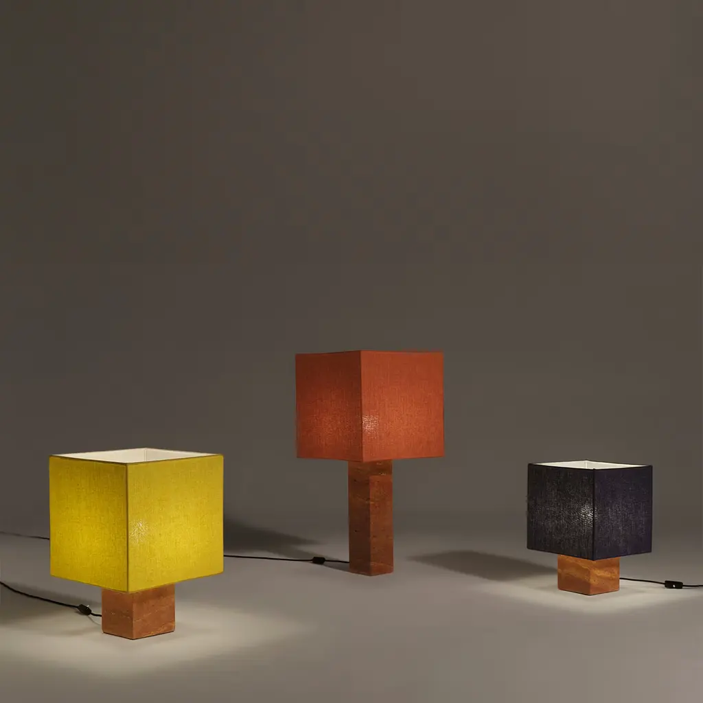 Clean architectural sophistication meets modern design in this stunning table lamp, part of the Roma Squared Collection of marble and linen lighting fixtures. Crafted by hand of red Travertine with nickel-plated brass details, it features a square shade hand-sewn of blue linen, complemented with a metal structure and cotton trimmings. Available in yellow, warm white, brick red, or with a white Travertine base, it supports an E27 LED bulb.