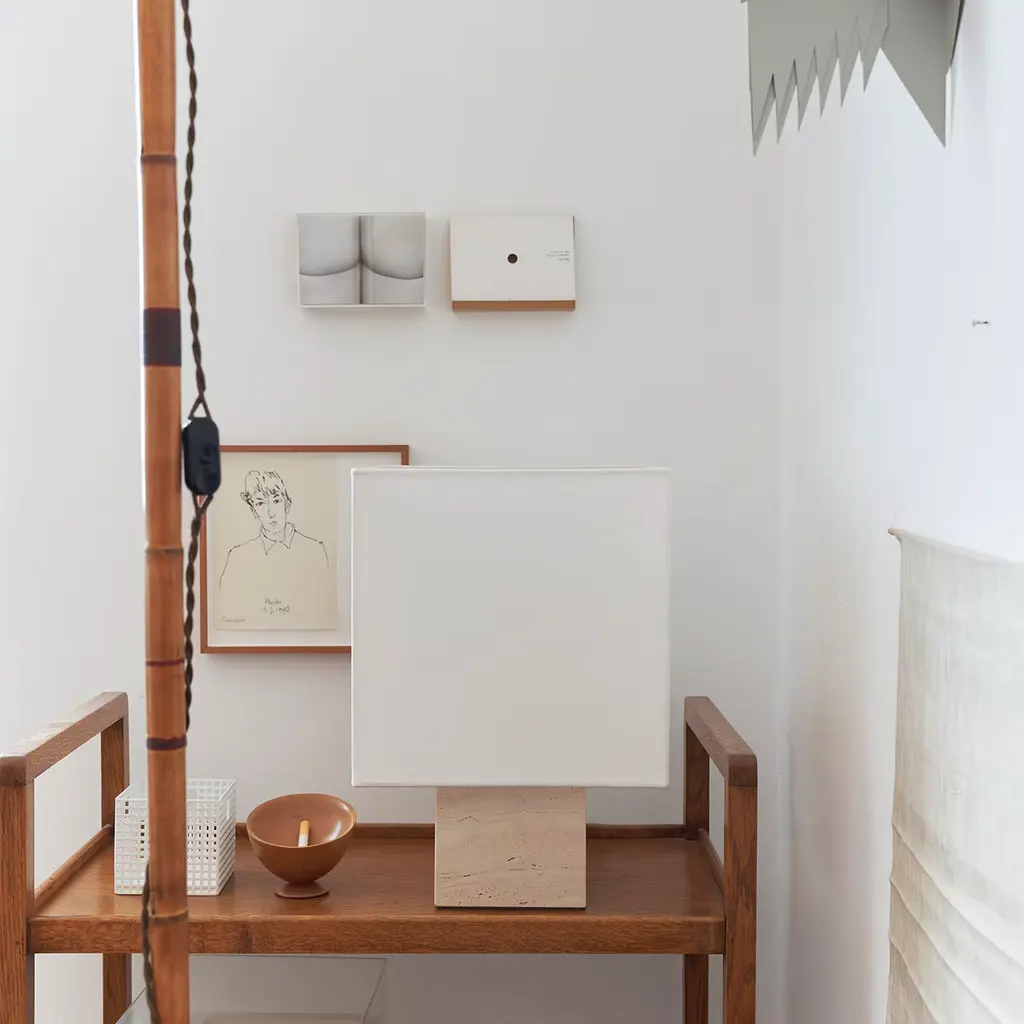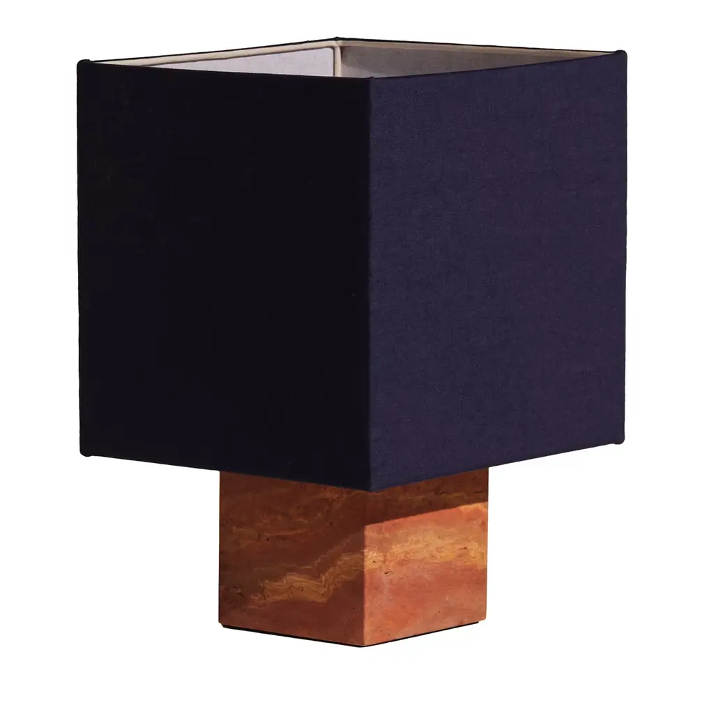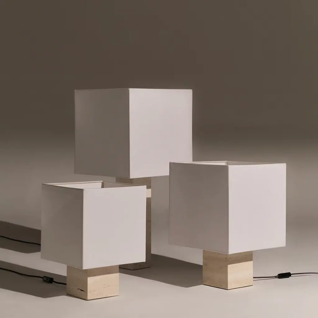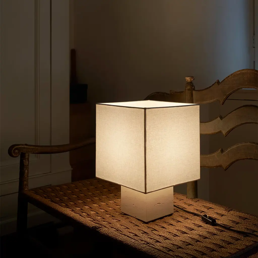 Clean architectural sophistication defines the Roma Squared Collection of refined table lamps, merging marble with linen in exceptional designs of unprecedented flair. Handmade of white Travertine with nickel-plated brass details, it features a square shade fashioned of warm white linen, enriched with a cotton-trimmed metal structure. Available in yellow, blue, and brick red, or with a red Travertine base, it supports an E27 LED bulb.