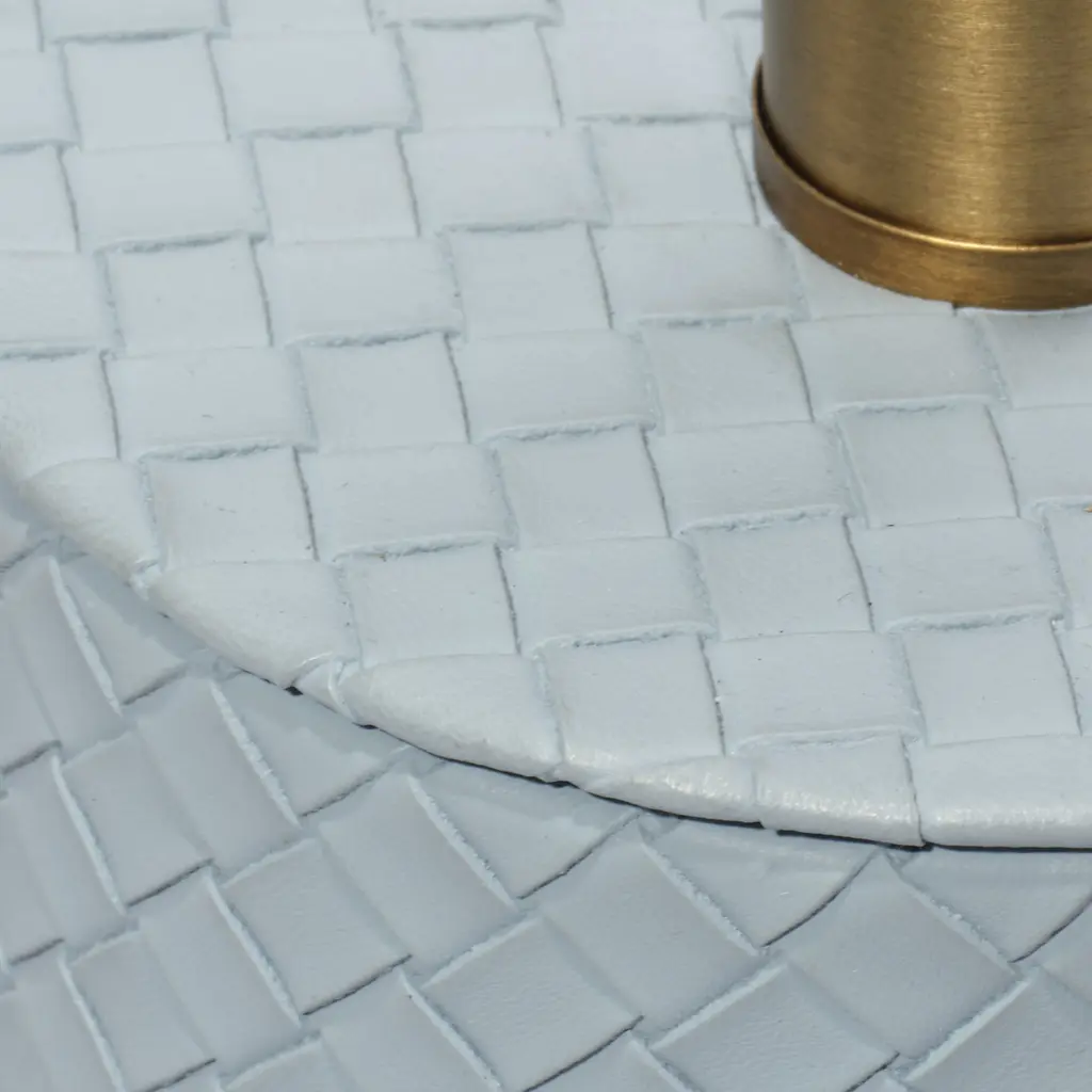 Expertly woven strips of top-quality leather completely cover the base of these sophisticated table lamps. The rich leather harmonizes beautifully with the clean white linen drum shade, while the neck features a burnished antique brass finish. Inspired by Italian fashion, these lamps make the perfect accent for any urban pied-à-terre.