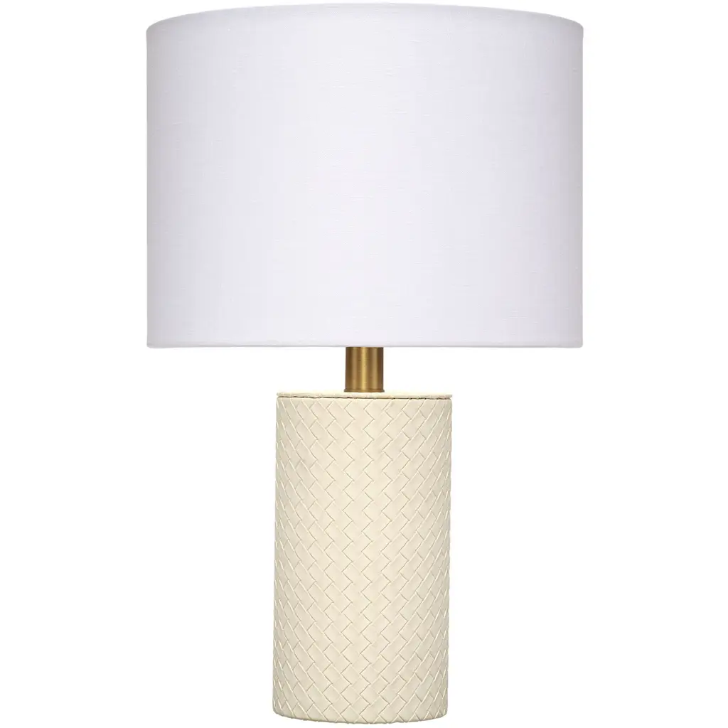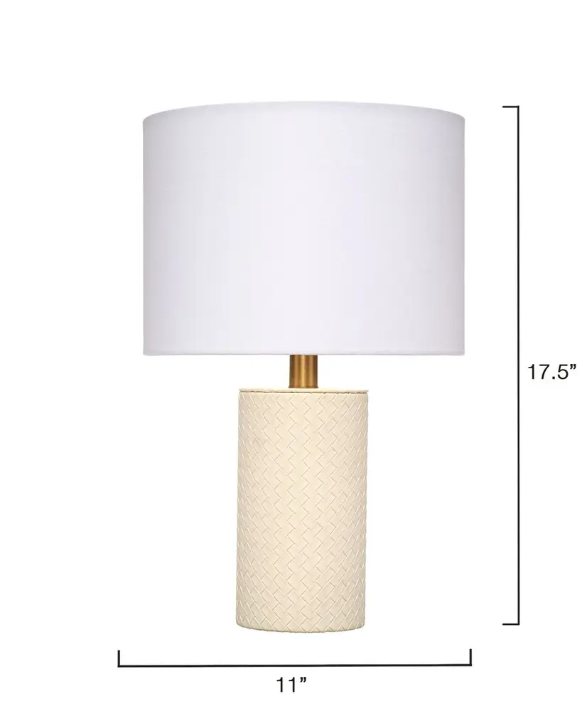 Expertly woven strips of top-quality leather completely cover the base of these sophisticated table lamps. The rich leather harmonizes beautifully with the clean white linen drum shade, while the neck features a burnished antique brass finish. Inspired by Italian fashion, these lamps make the perfect accent for any urban pied-à-terre.