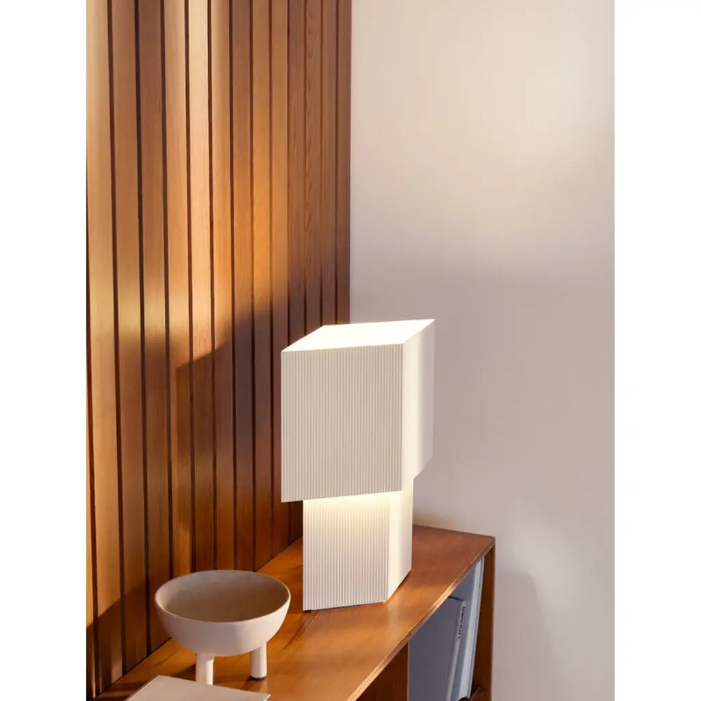 The Romb table lamp by Pholc is dominated by a striking design language that is sure to catch the eye wherever the lamp is placed. However, the luminaire is actually much more detailed than it might look at first glance: its surface is adorned with a delicate, undulating texture that creates an interesting contrast to the preciseness of the lamp’s shape. Designers Mats Broberg and Johan Ridderstråle say they got the idea from corrugated cardboard, which they often use when making architectural models. In geometry, Romb’s quadrilateral shape is called a rhombus, with all four sides measuring the same. The unusual shape gives Romb a striking presence but is, at the same time, a practical solution: the shape makes the luminaire slimmer, so it can fit on even a narrower shelf or windowsill. The lamp emits an indirect glow both from its open top as well as under its shade, the latter emphasizing the luminaire’s fascinating geometry. The strong shape and delicate texture also create a contrast that makes the Romb table lamp almost sculptural – Romb is guaranteed to add a captivating touch to the décor even when the light is turned off.